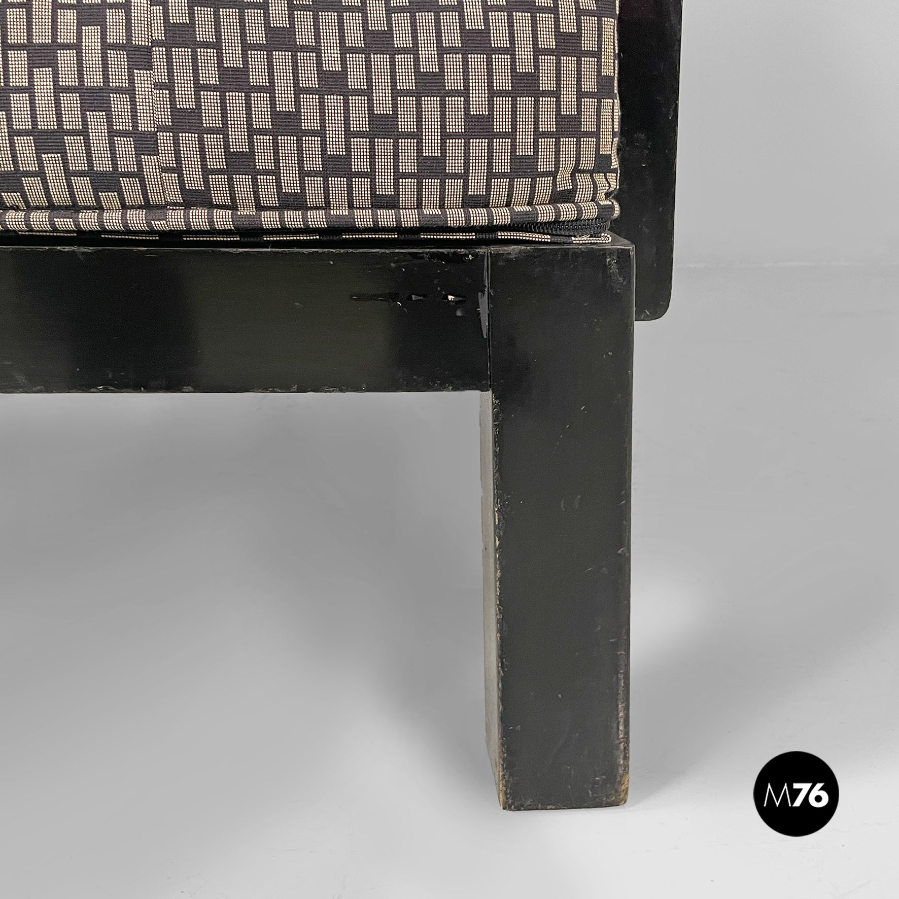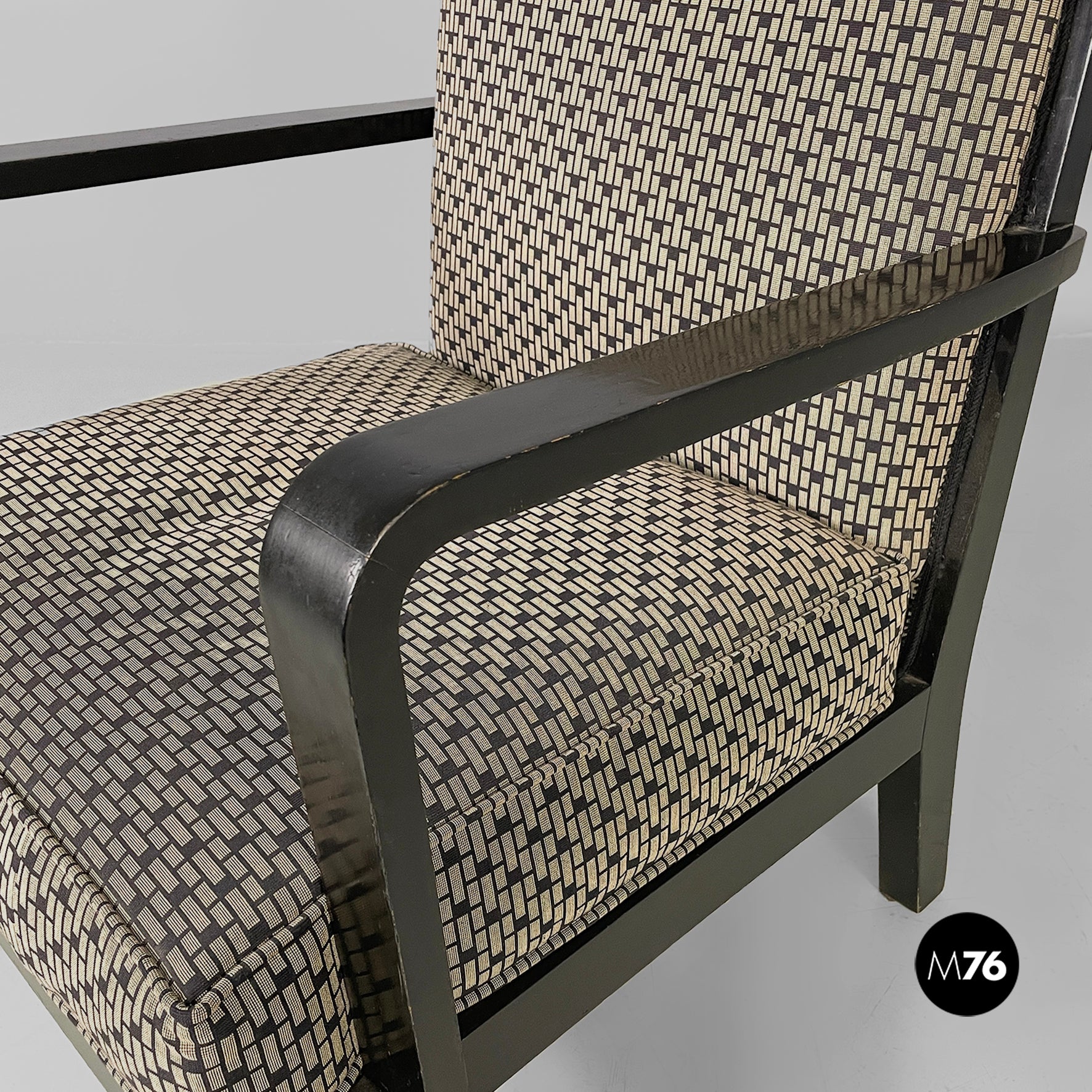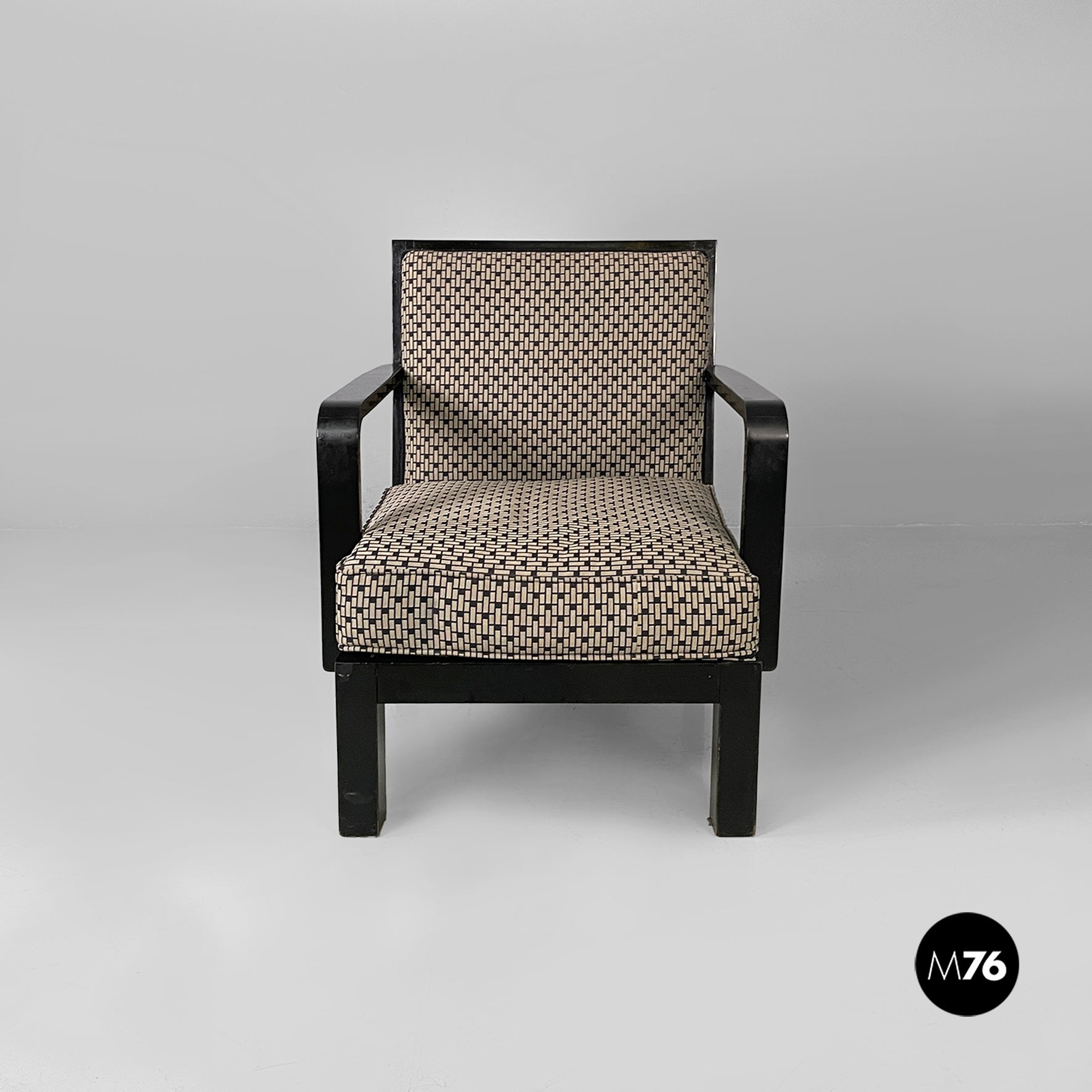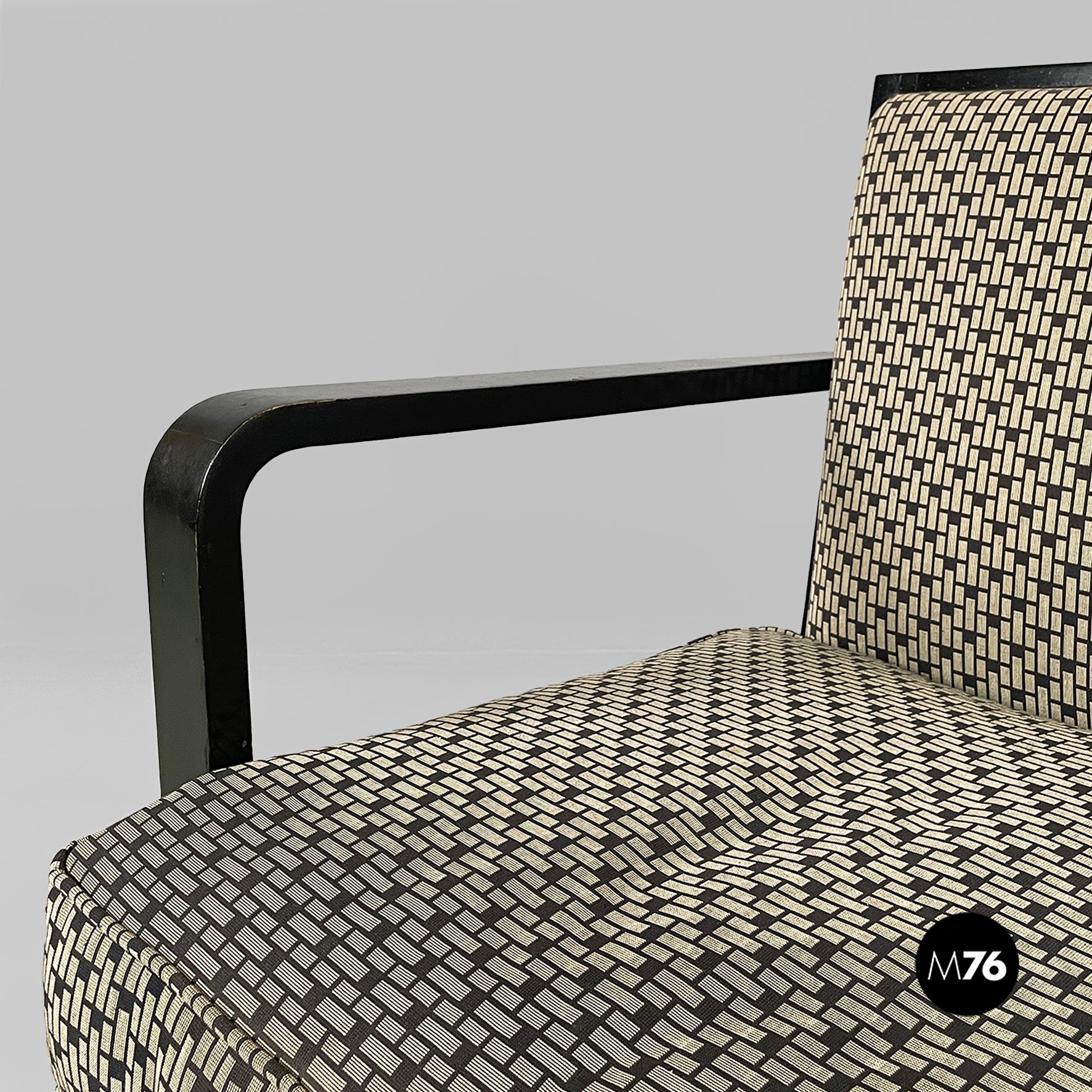 Pair of armchairs with square seats and backrests, padded and upholstered in a gray and black geometric patterned fabric. Black trimming present on the profile of the backrest cushion. The armrests are made of curved black painted wood strips. The structure and legs are made of black painted wood. Art Deco.
