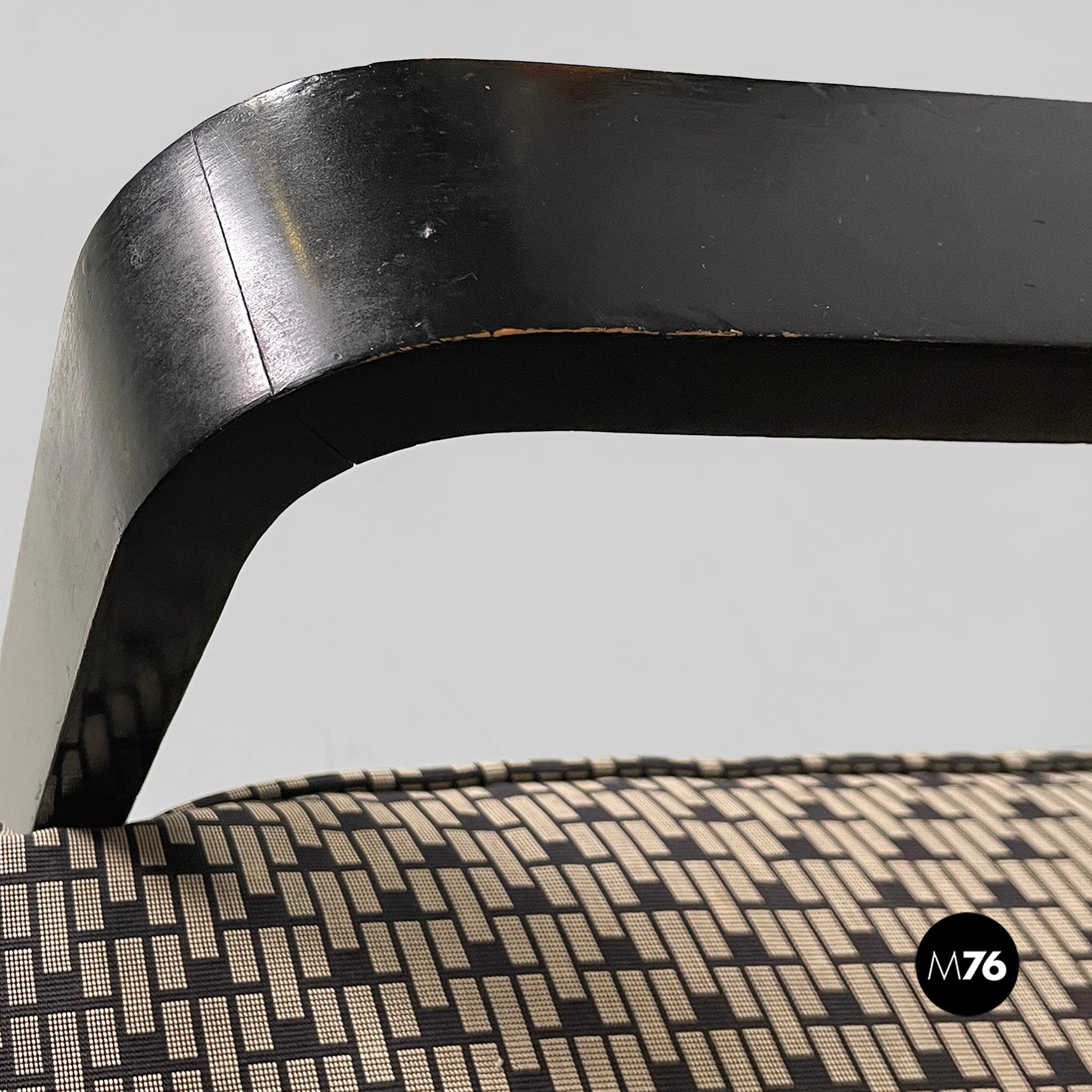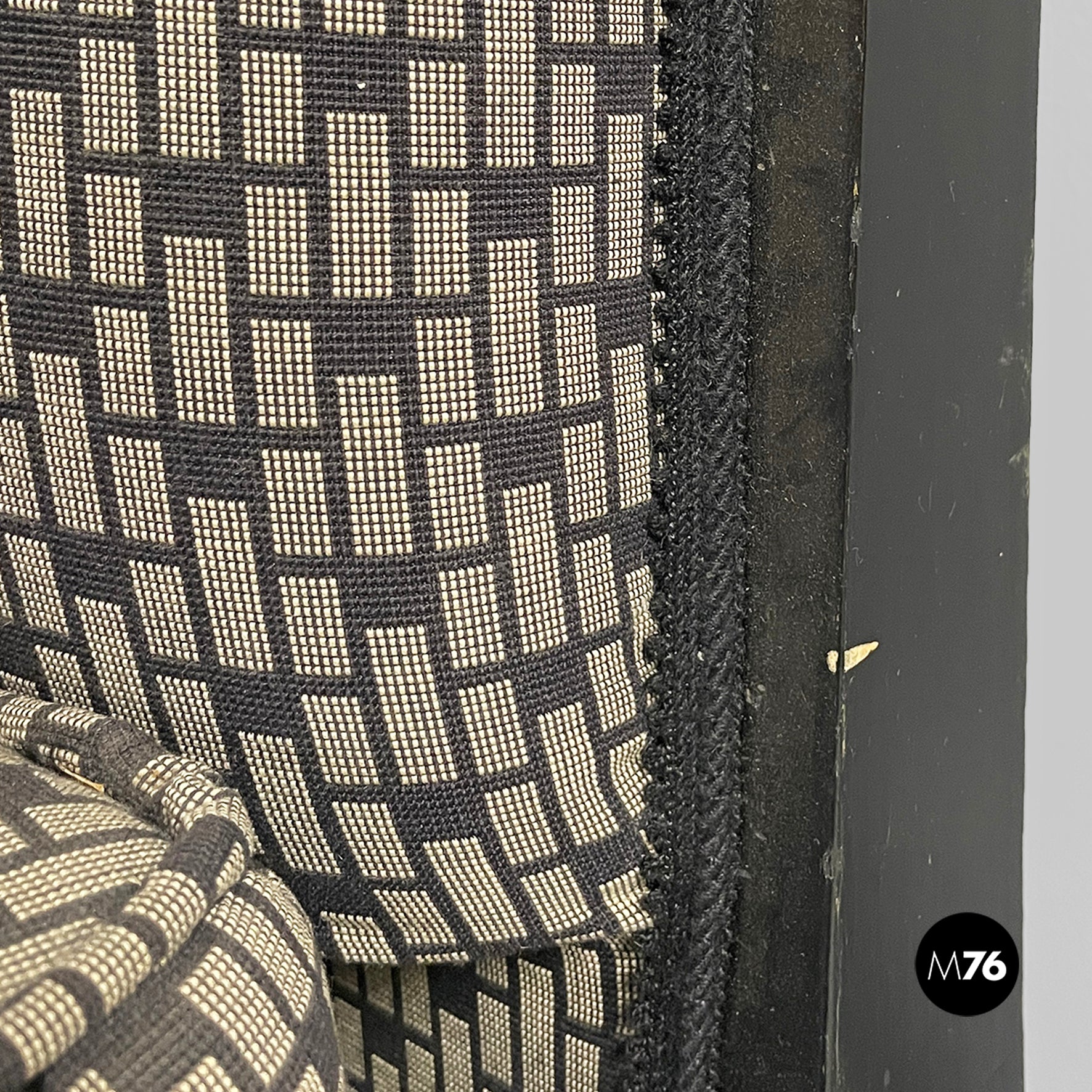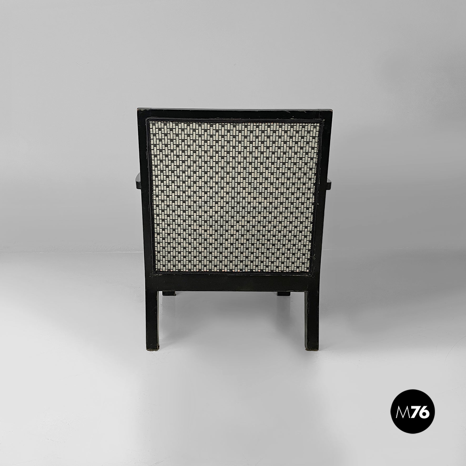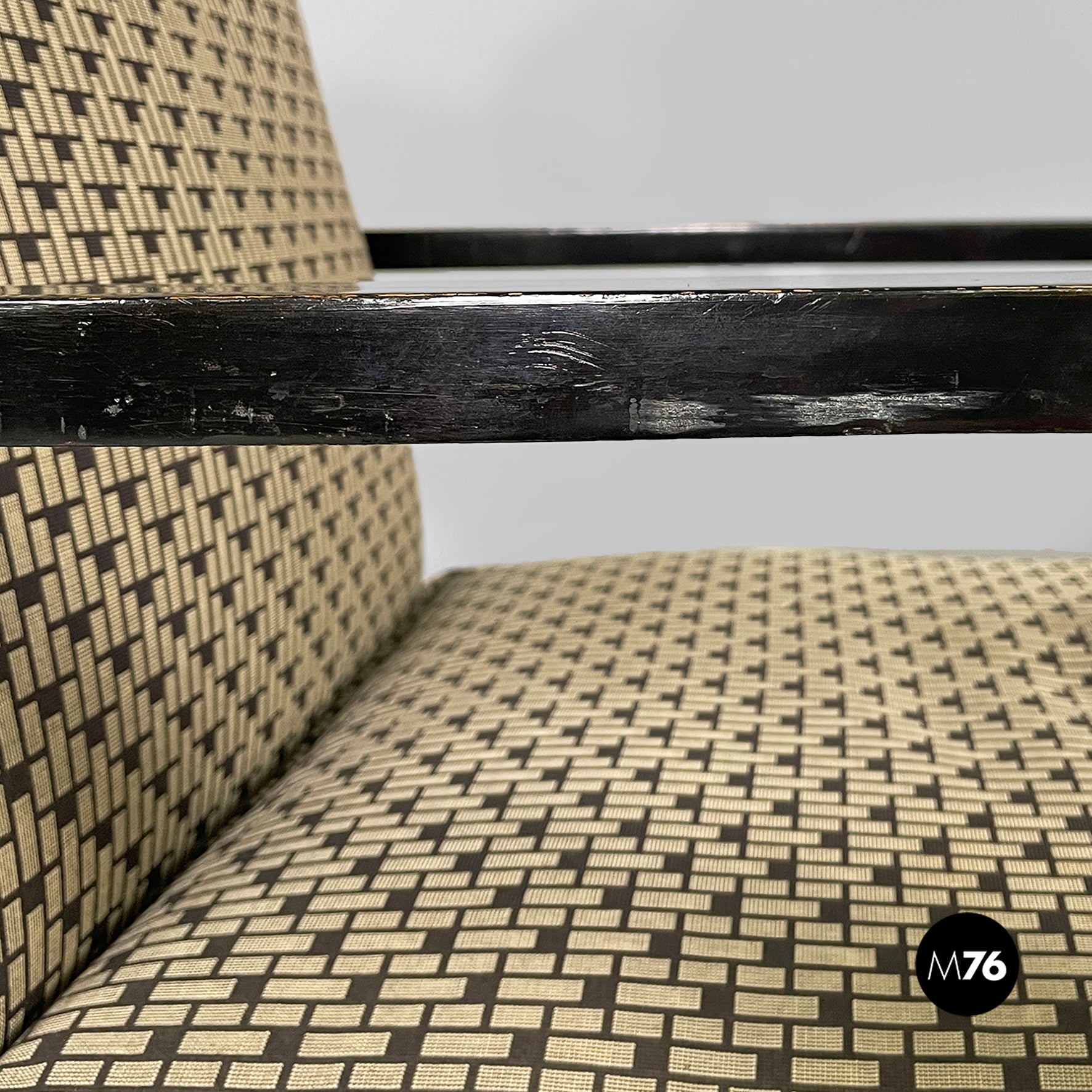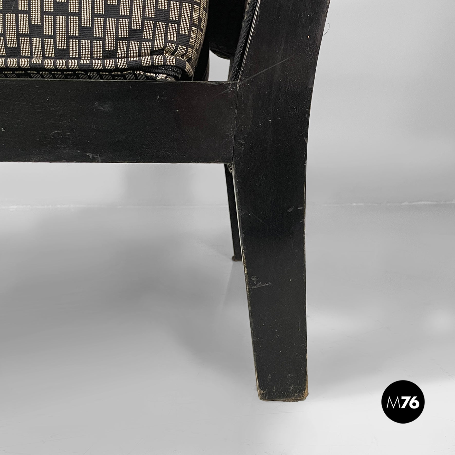 Pair of armchairs with square seats and backrests, padded and upholstered in a gray and black geometric patterned fabric. Black trimming present on the profile of the backrest cushion. The armrests are made of curved black painted wood strips. The structure and legs are made of black painted wood. Art Deco.