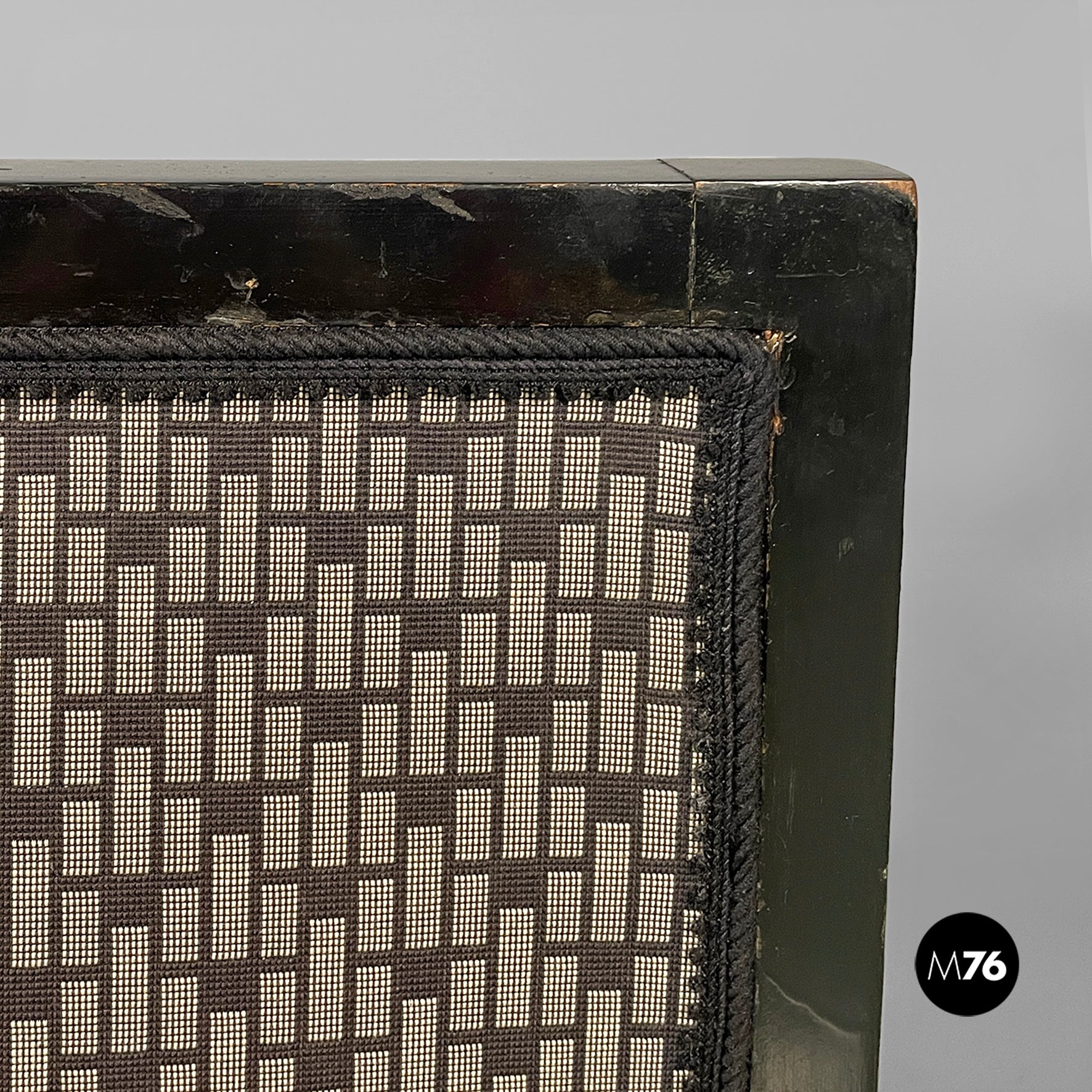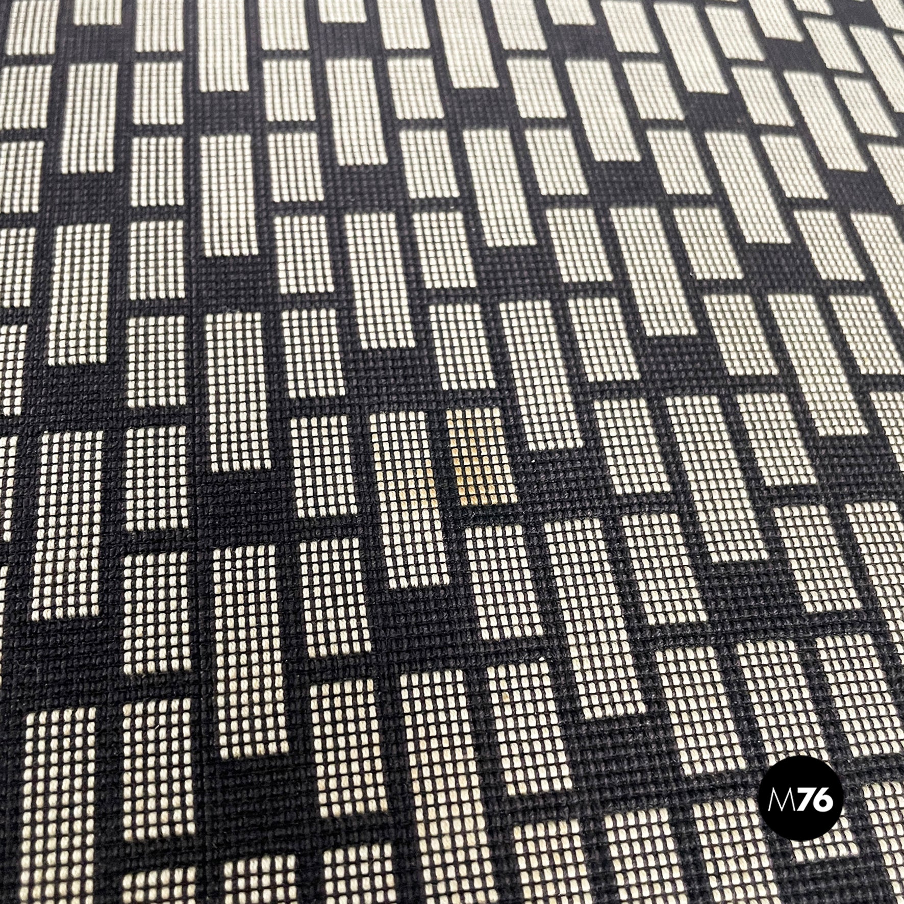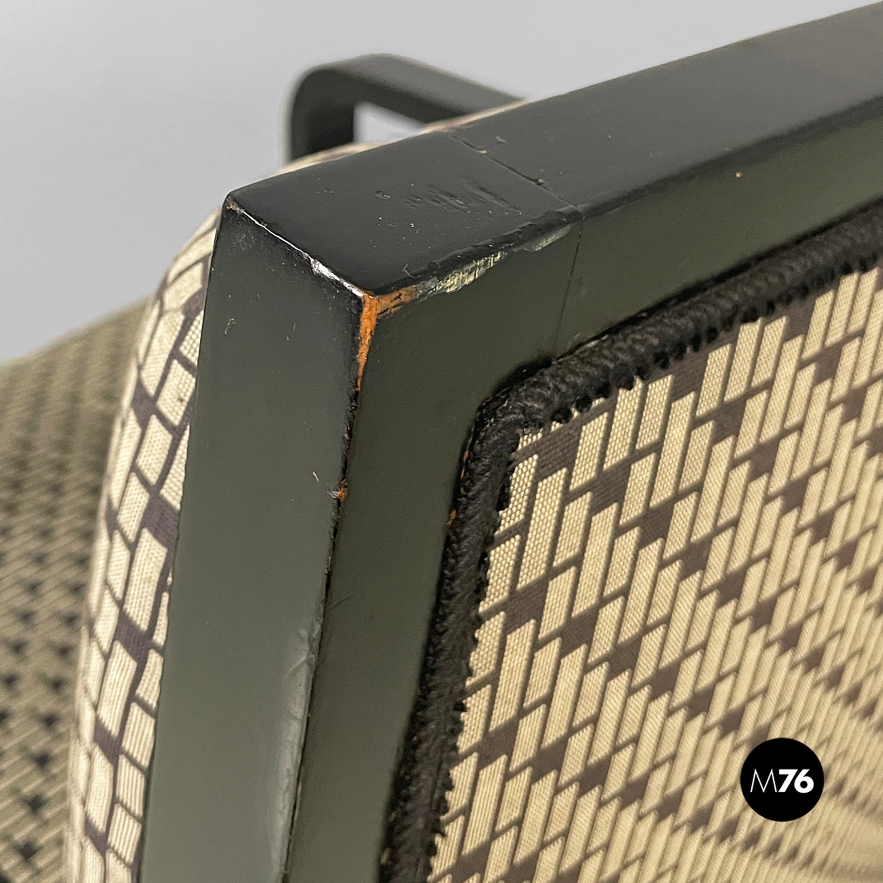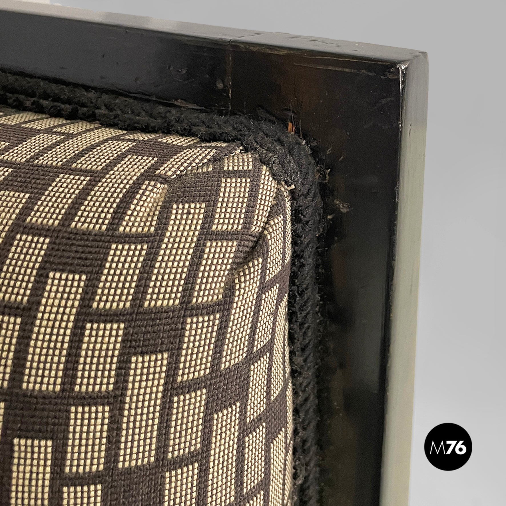 Pair of armchairs with square seats and backrests, padded and upholstered in a gray and black geometric patterned fabric. Black trimming present on the profile of the backrest cushion. The armrests are made of curved black painted wood strips. The structure and legs are made of black painted wood. Art Deco.