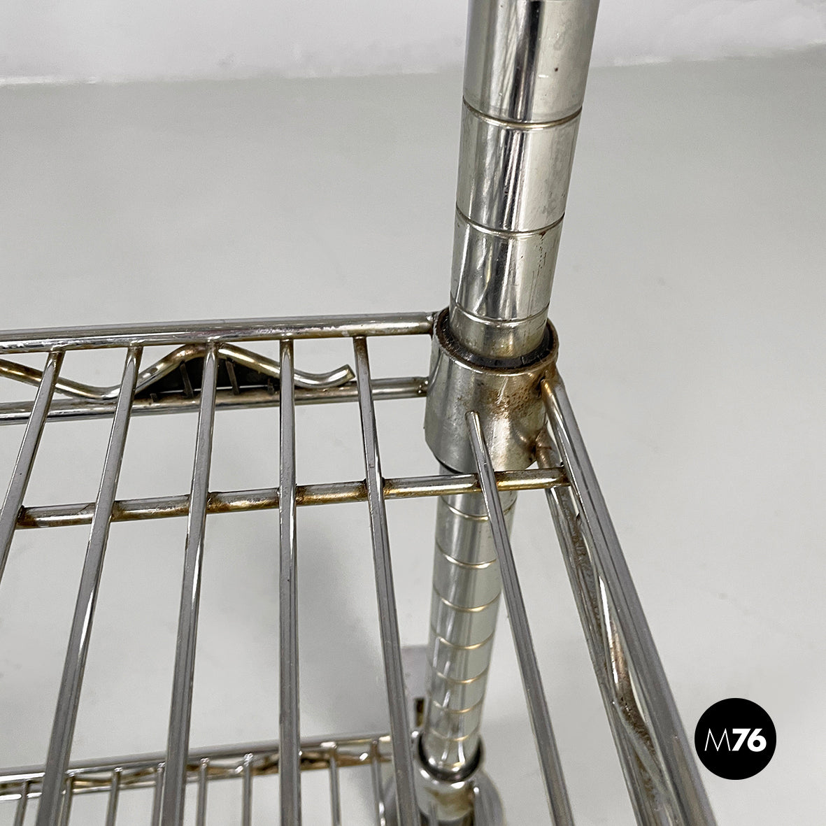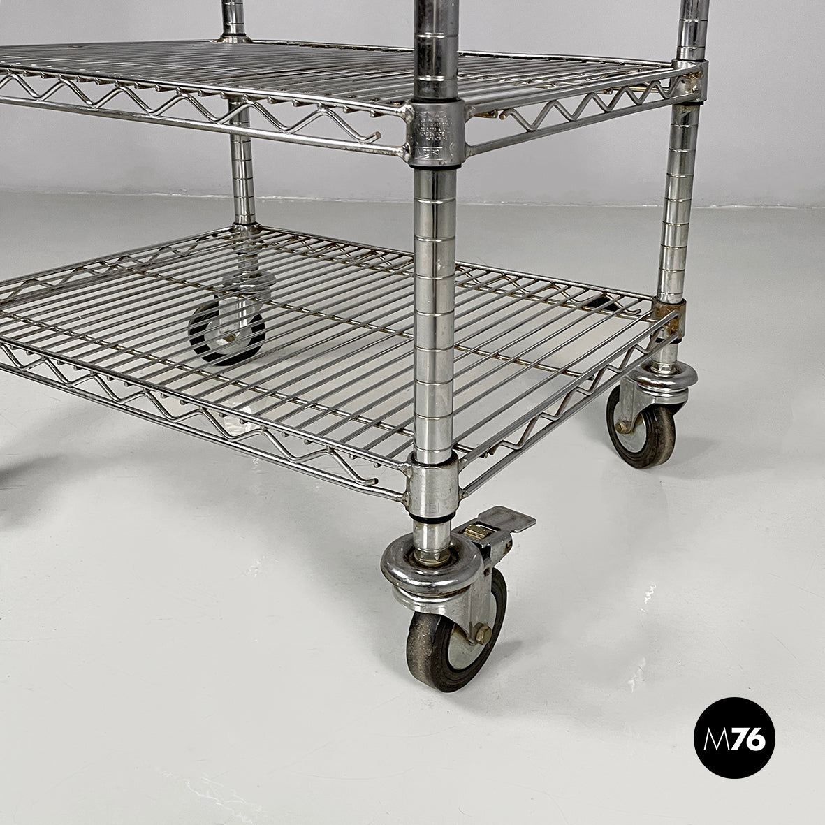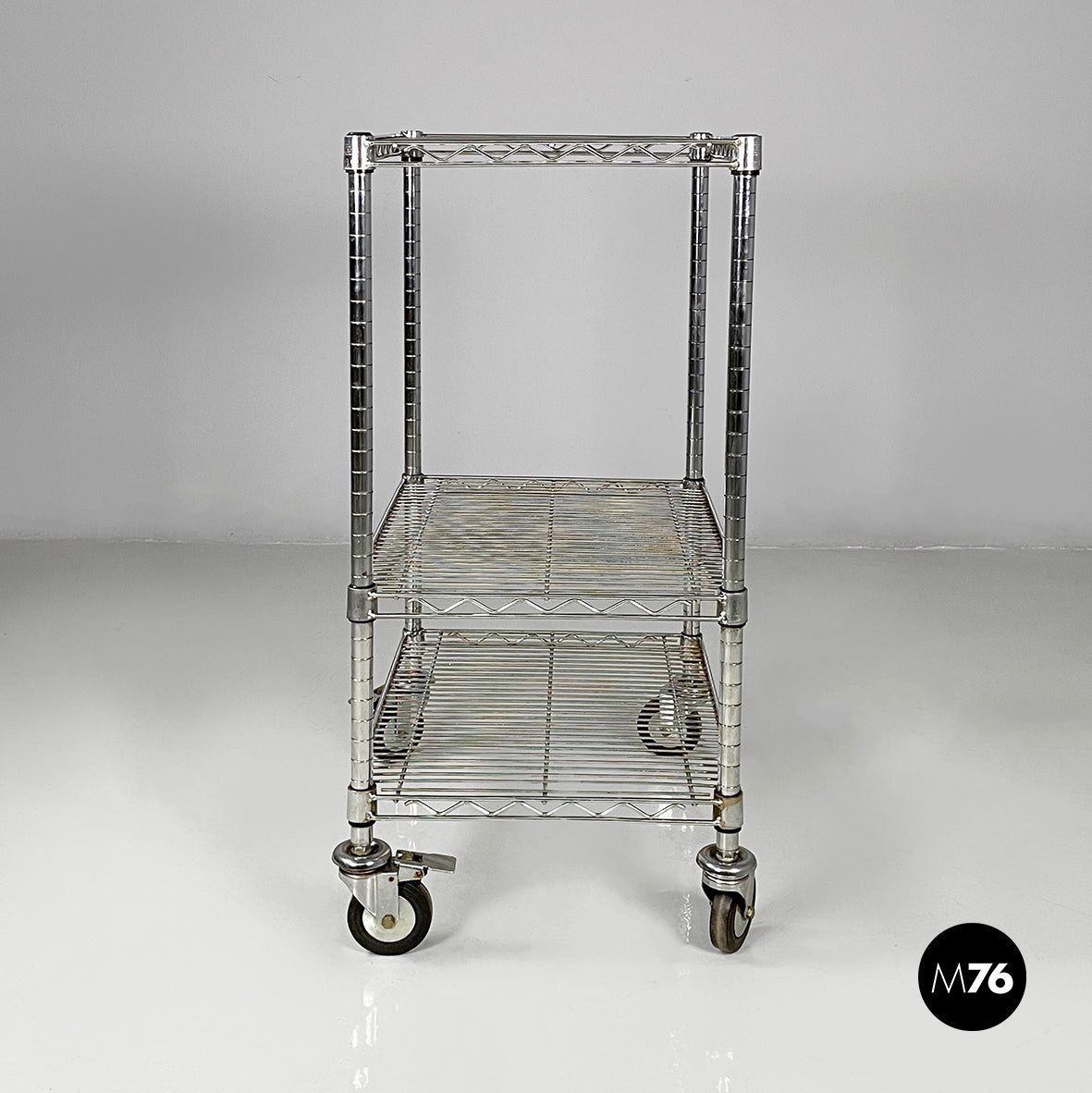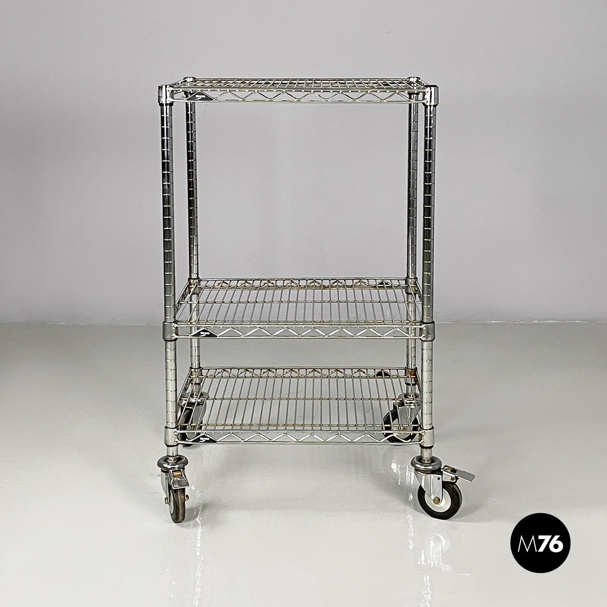 Cart wit three shelves made of vertical, horizontal, and diagonal steel rods. The trolley structure is composed of four metal tubes and four castors.