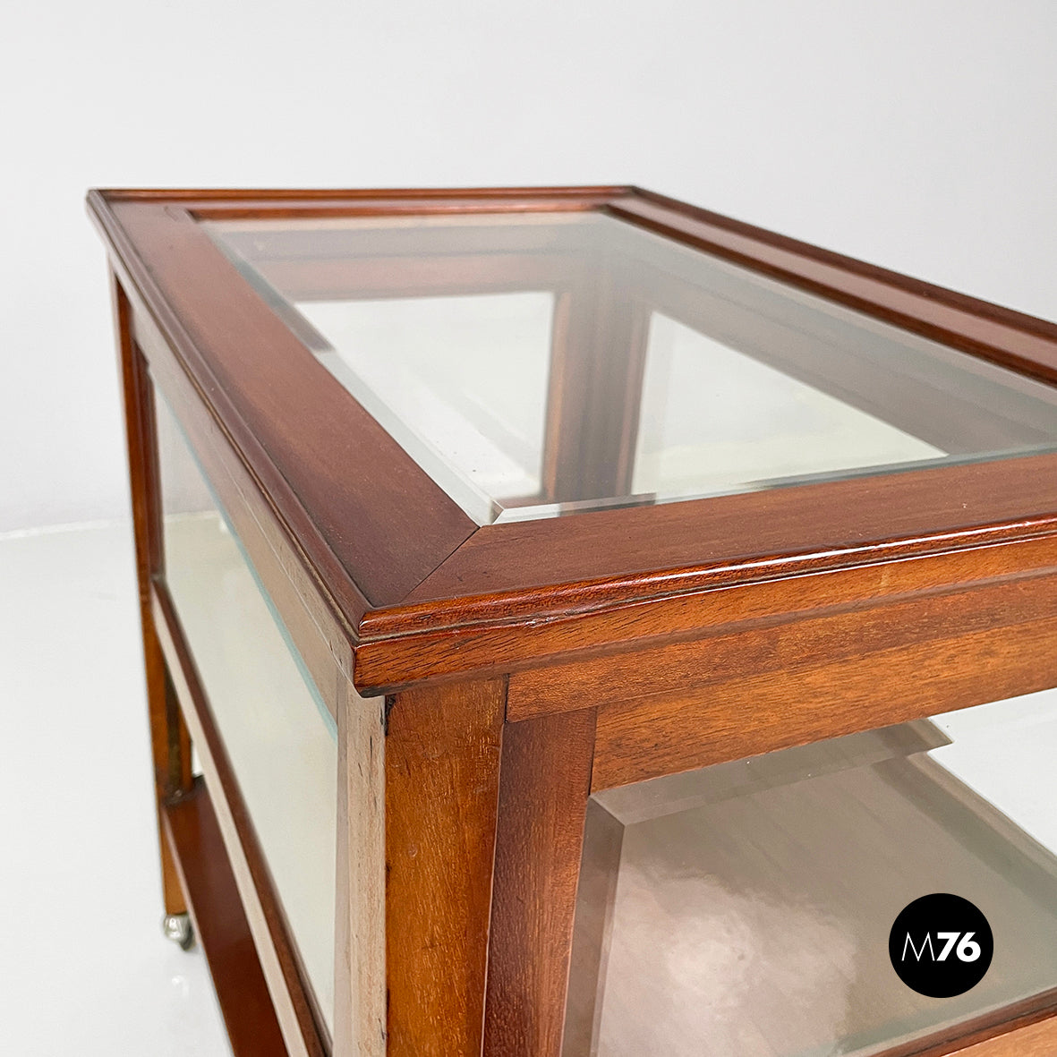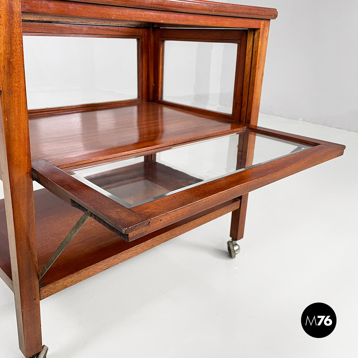 Cart with bar compartment in wood and glass. In the upper part there is a compartment with wooden profiles and glass interiors and each side has a flap opening. It has a rectangular lower wooden shelf. Square-section wooden legs. Wheels at the base.