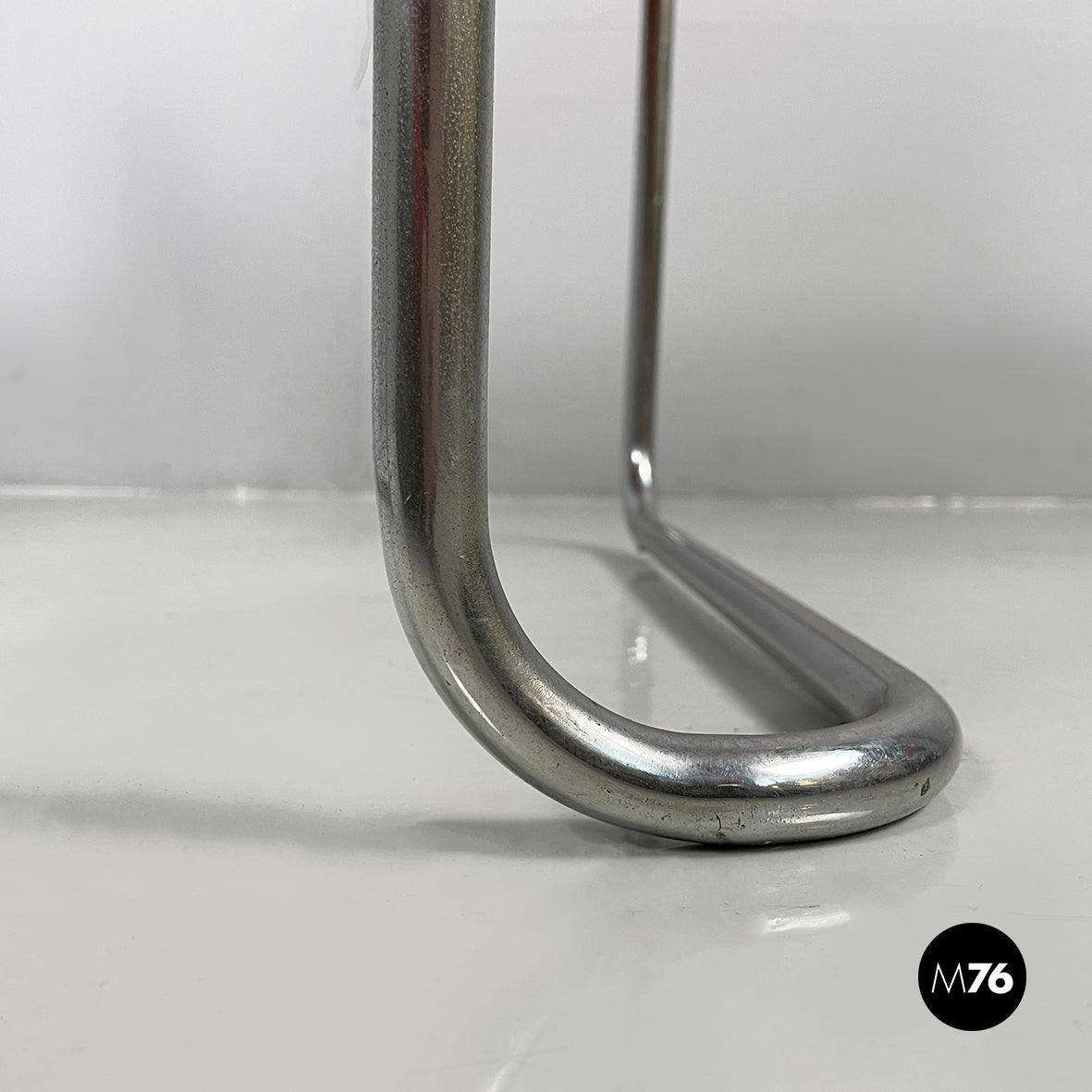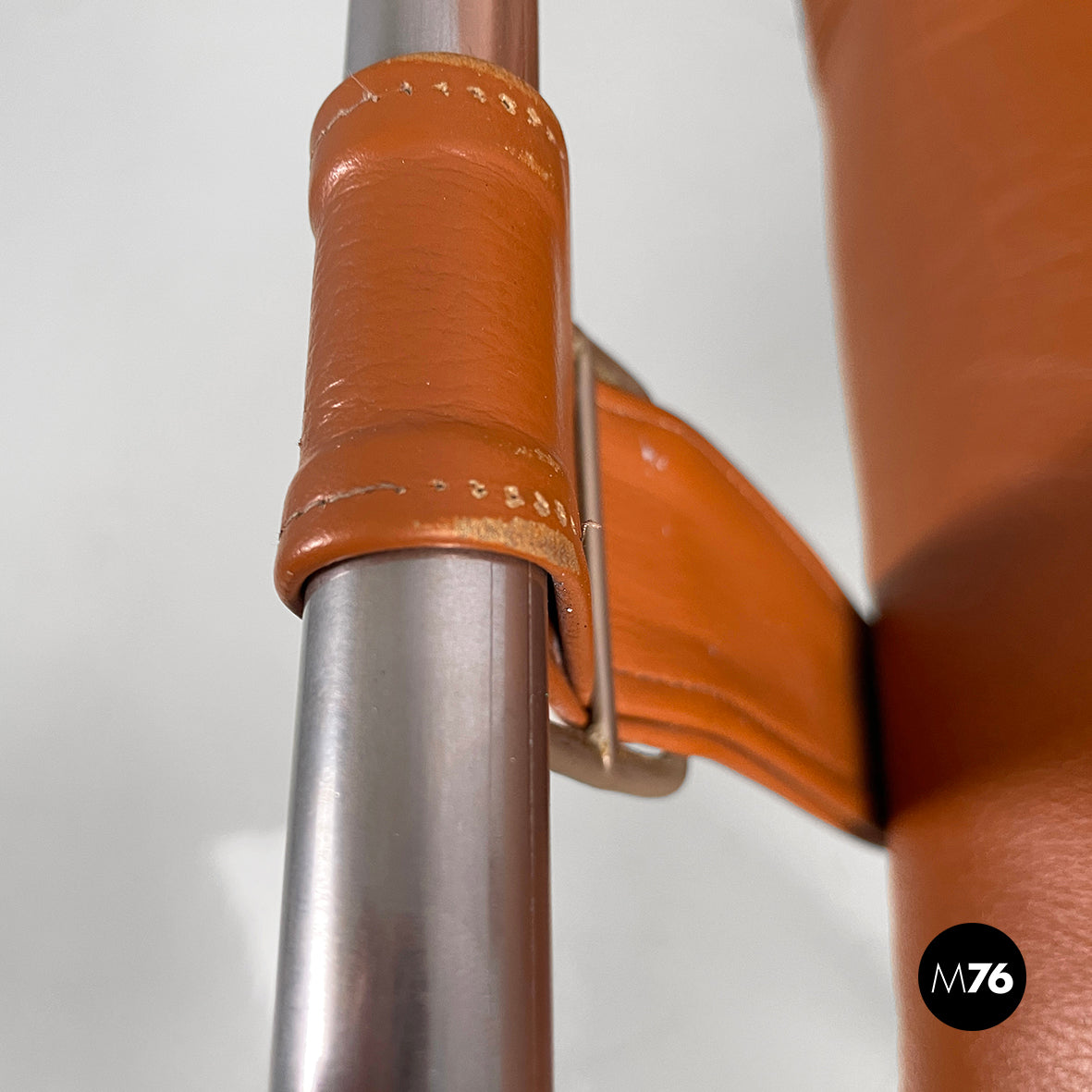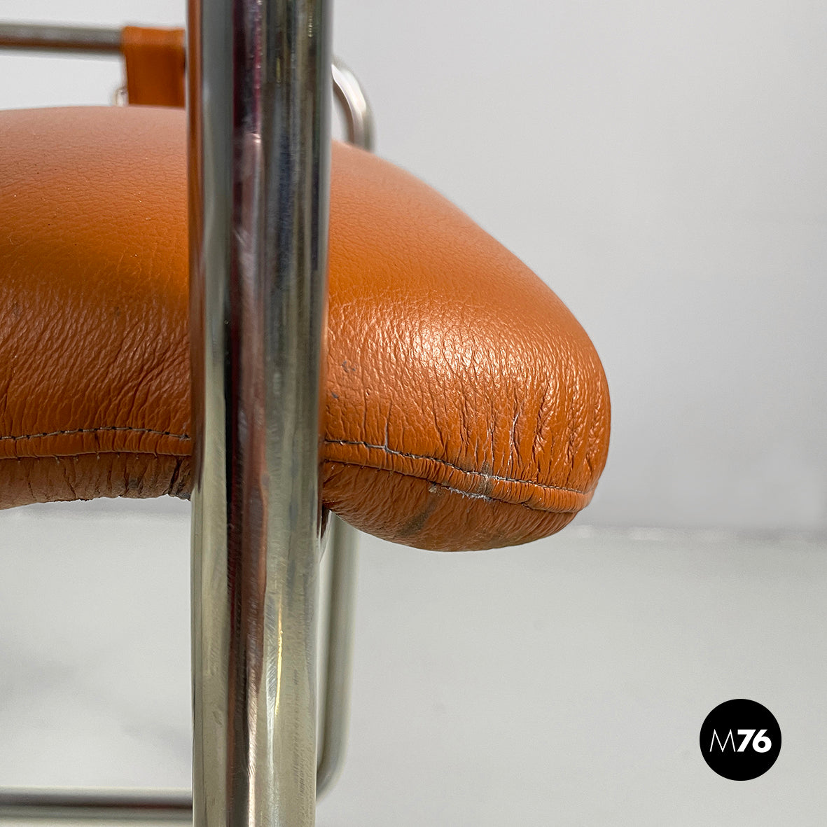 Chair with a square seat and backrest, padded and upholstered in brown leather. The backrest features two brown leather-covered buttons. The structure, armrests and legs are made of a single chrome-plated metal tube. The seat is connected to the armrest with leather straps and a metal buckle. It can be used as a small armchair.