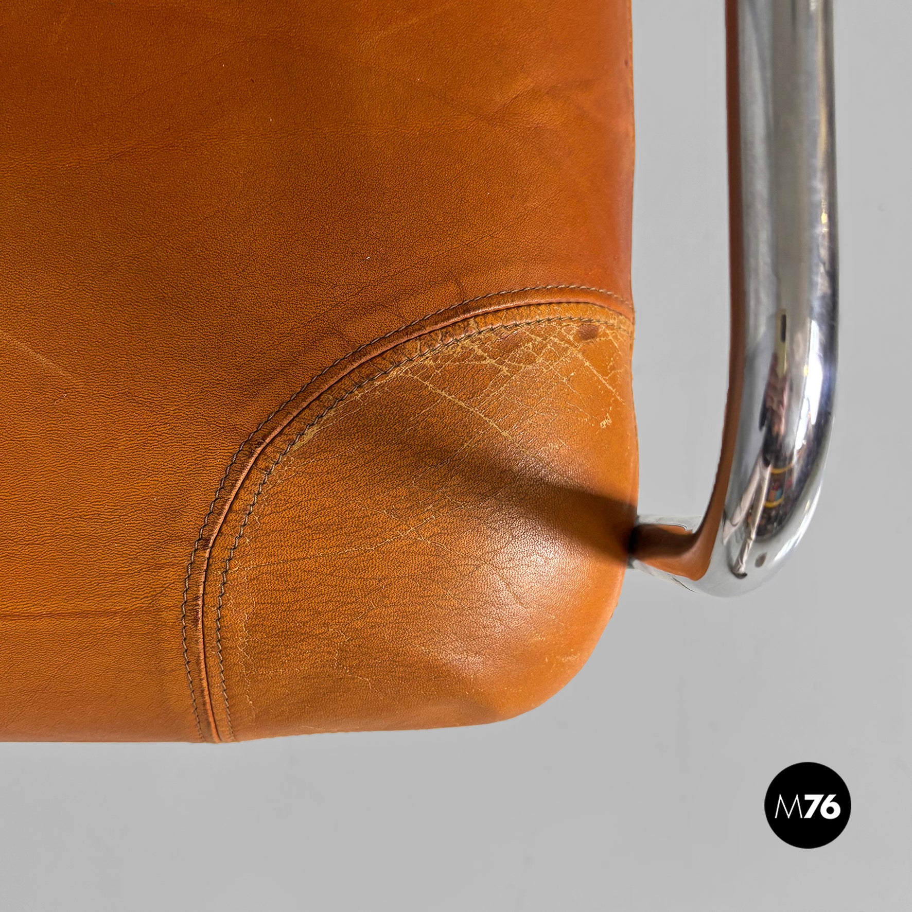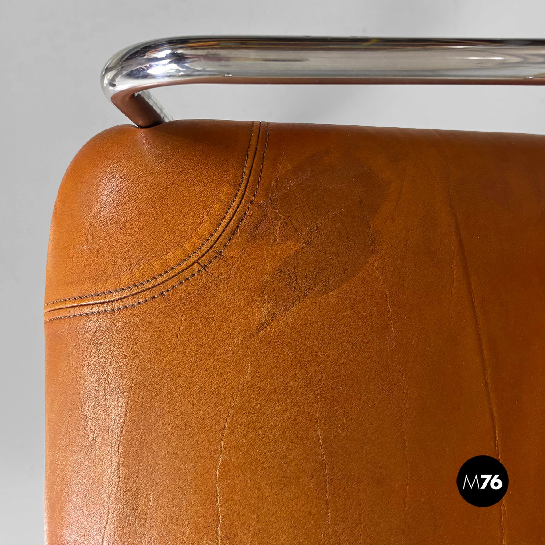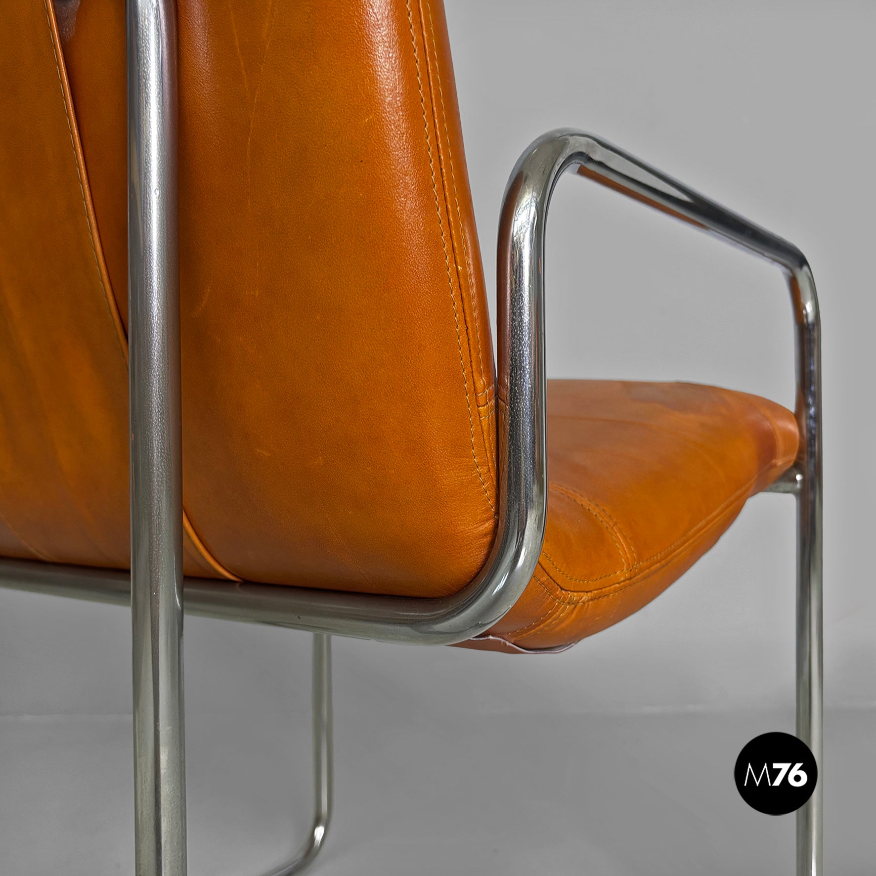Pair of chairs with square seats and backrests, padded and upholstered in brown leather. The backrest features two brown leather-covered buttons. The frame, armrests, and legs are made of a single chromed metal tube. Can be used as a small armchair.