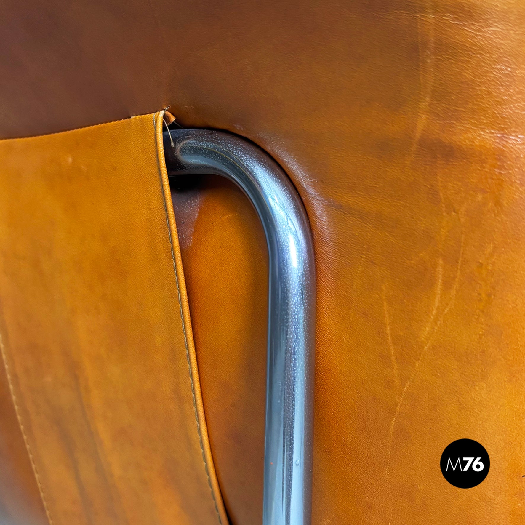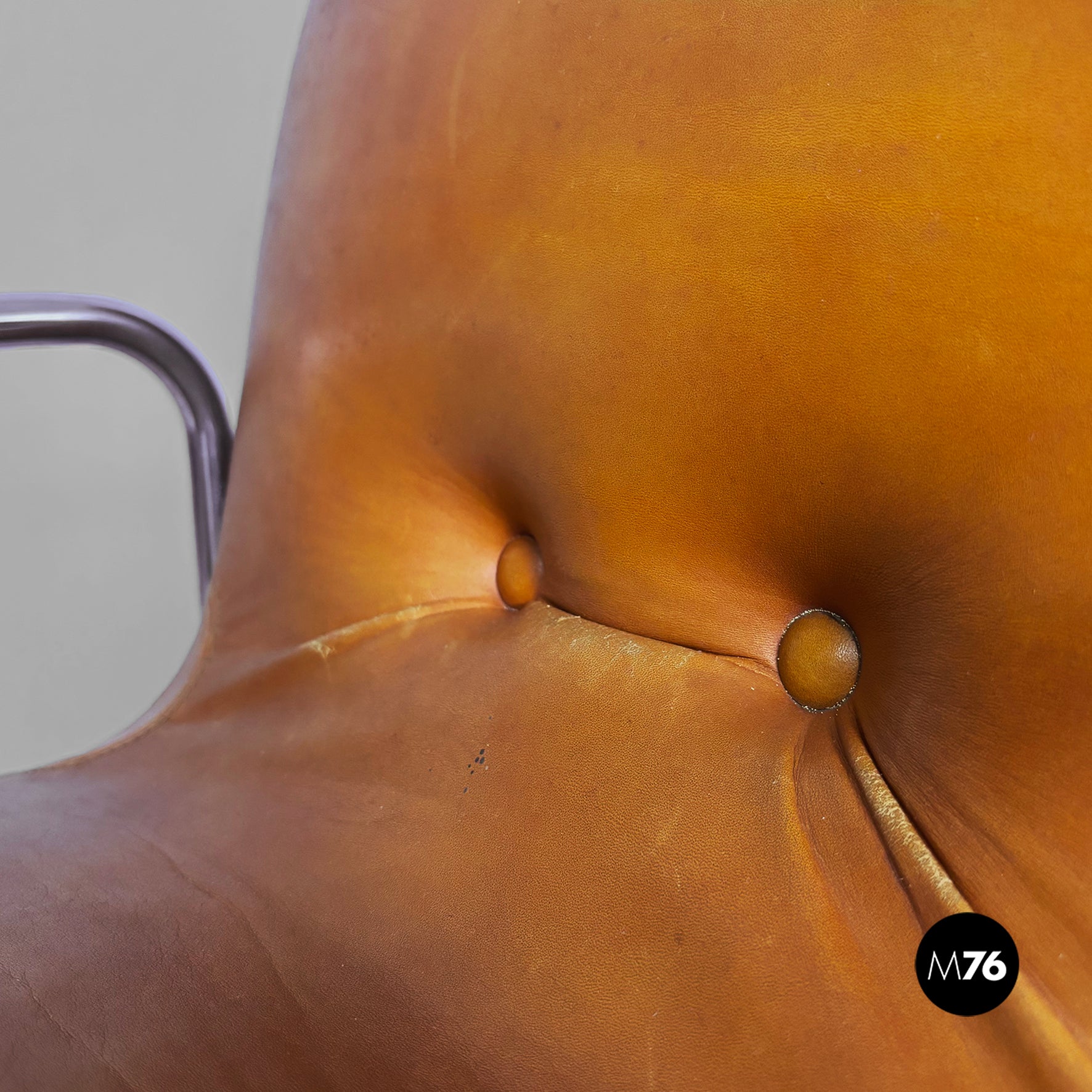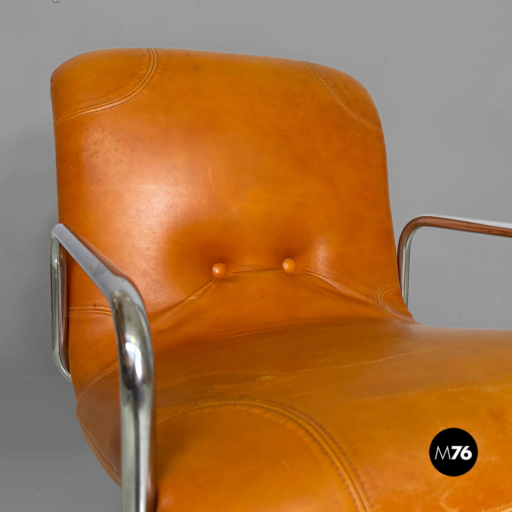 Pair of chairs with square seats and backrests, padded and upholstered in brown leather. The backrest features two brown leather-covered buttons. The frame, armrests, and legs are made of a single chromed metal tube. Can be used as a small armchair.