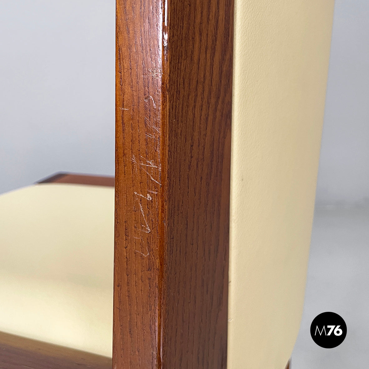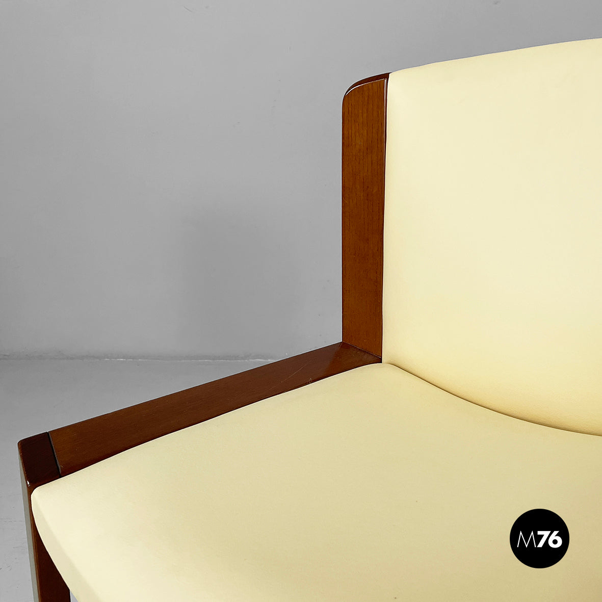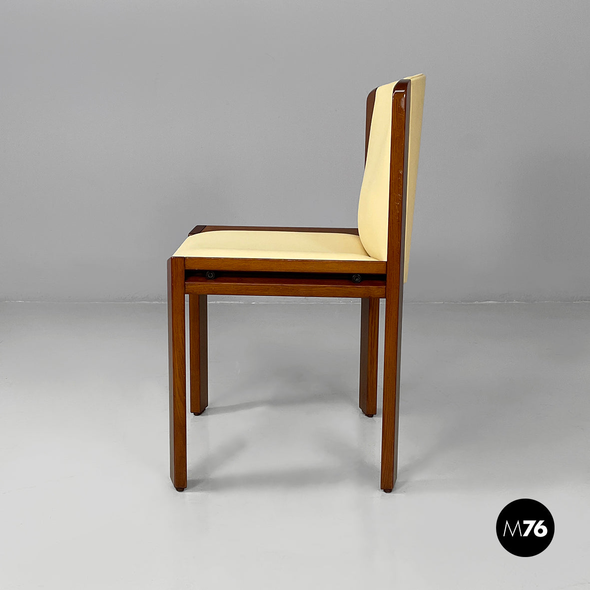 Set of six chairs model 300 with squared seats and backrests, padded and upholstered in yellow-beige leatherette with wooden profile. The slatted legs are made of wood.