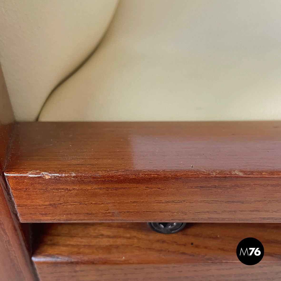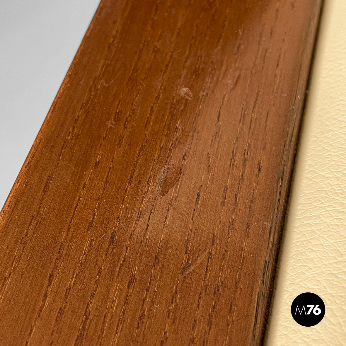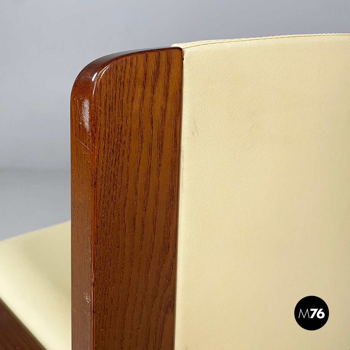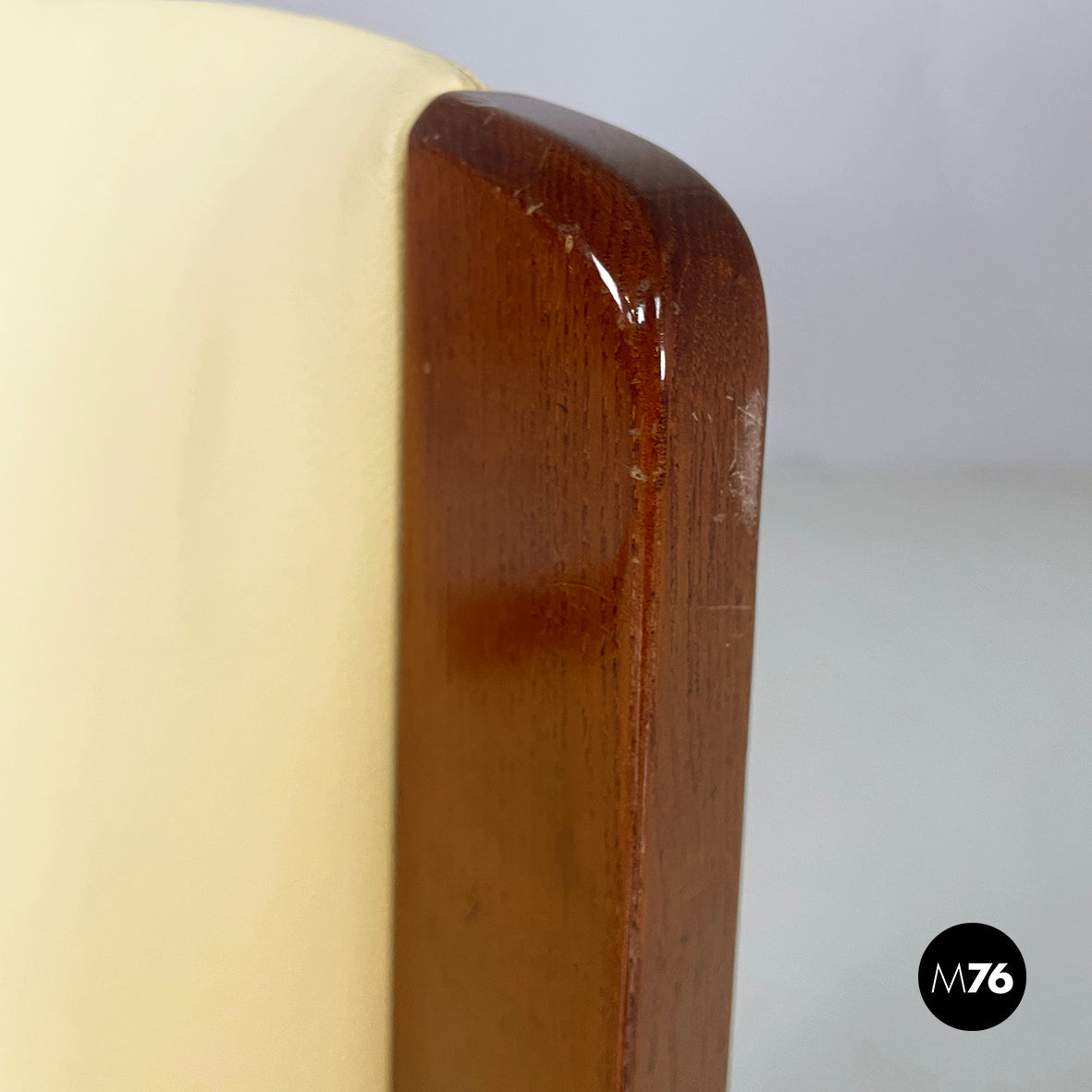 Set of six chairs model 300 with squared seats and backrests, padded and upholstered in yellow-beige leatherette with wooden profile. The slatted legs are made of wood.