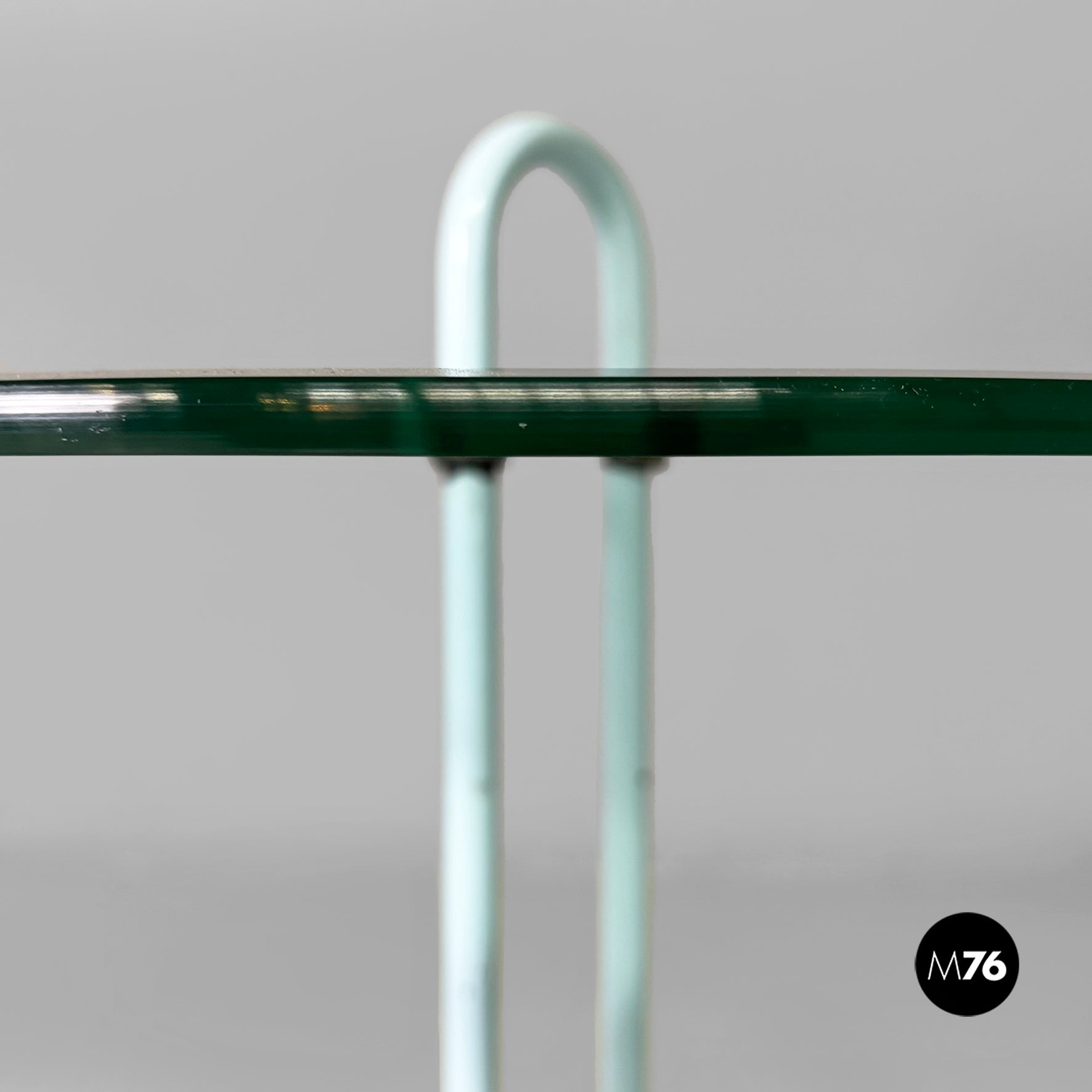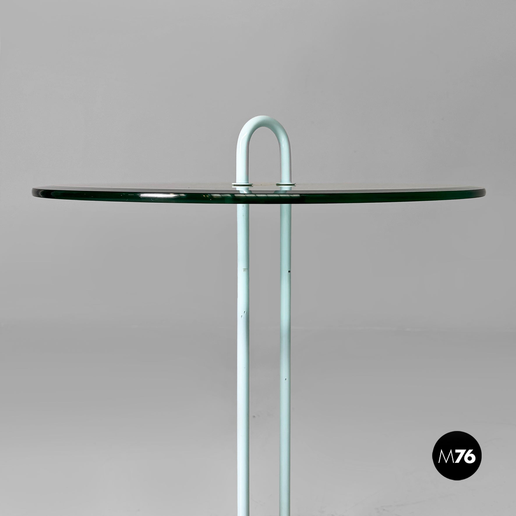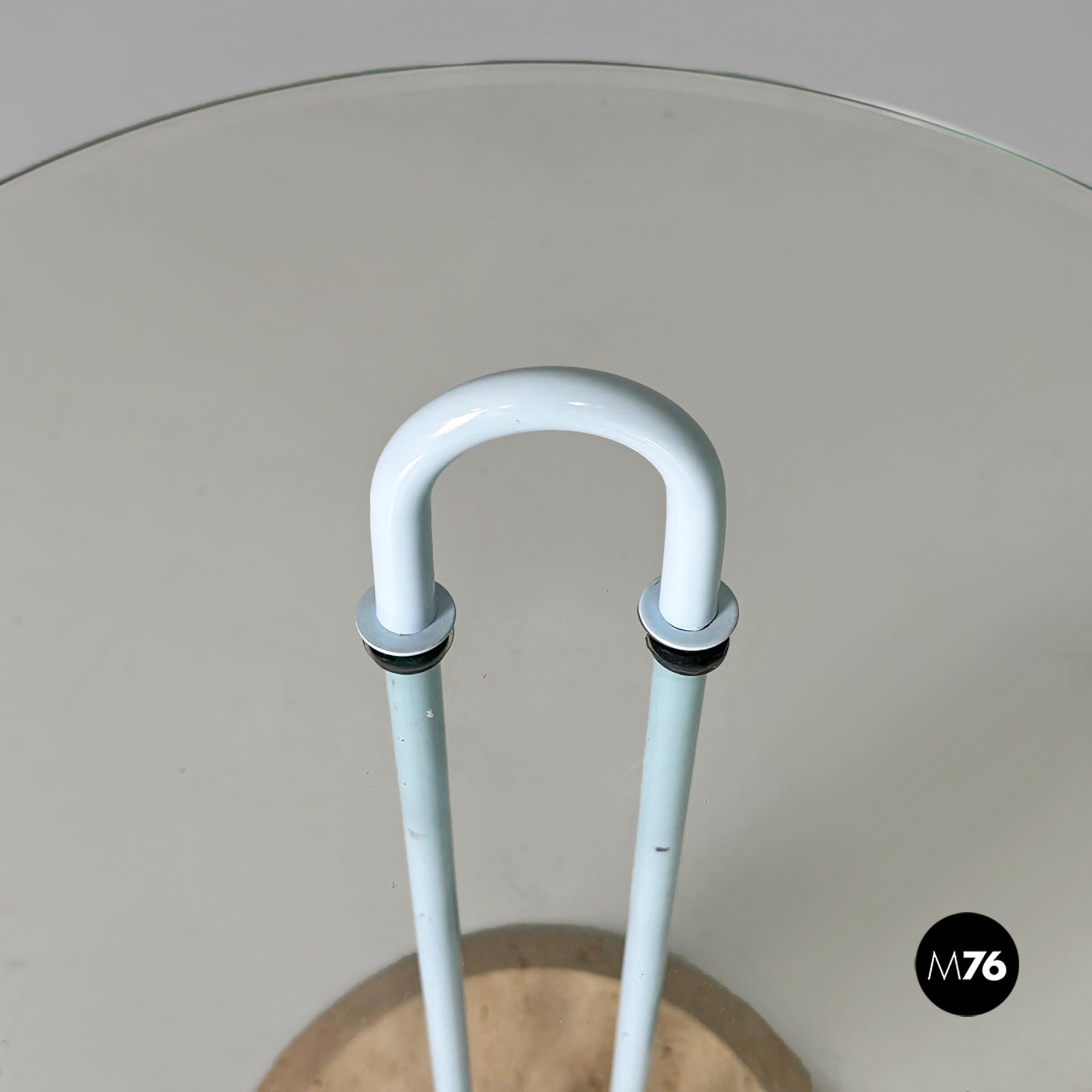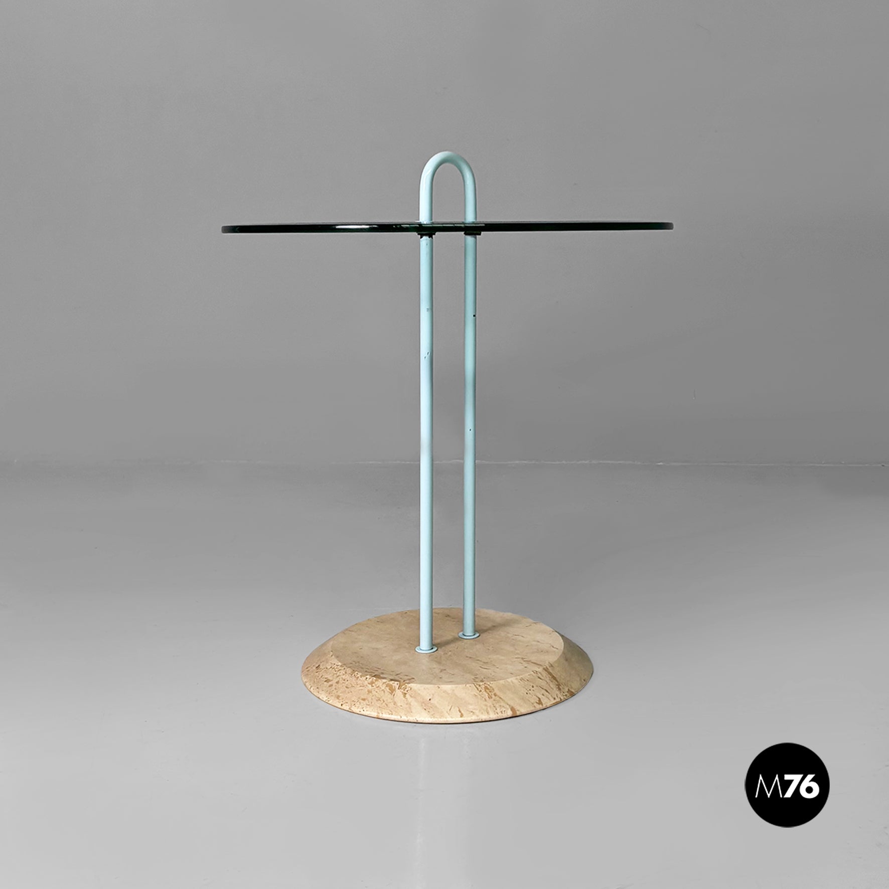 Coffee table in metal, glass, and travertine. The frame is made of light blue painted metal. The top is round and made of thick glass. The round base is made of travertine.