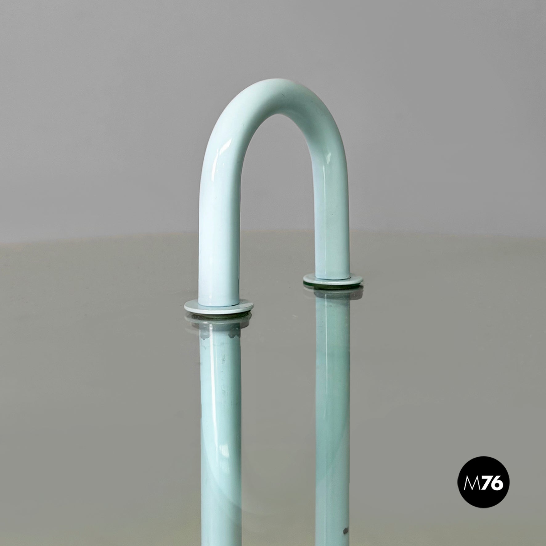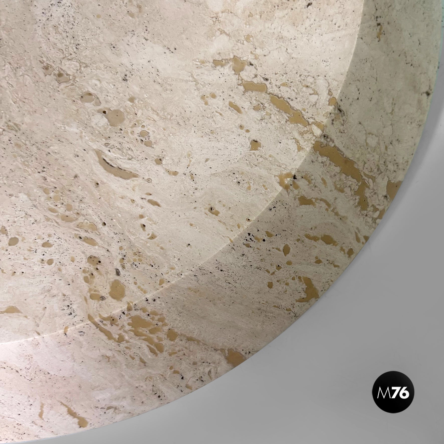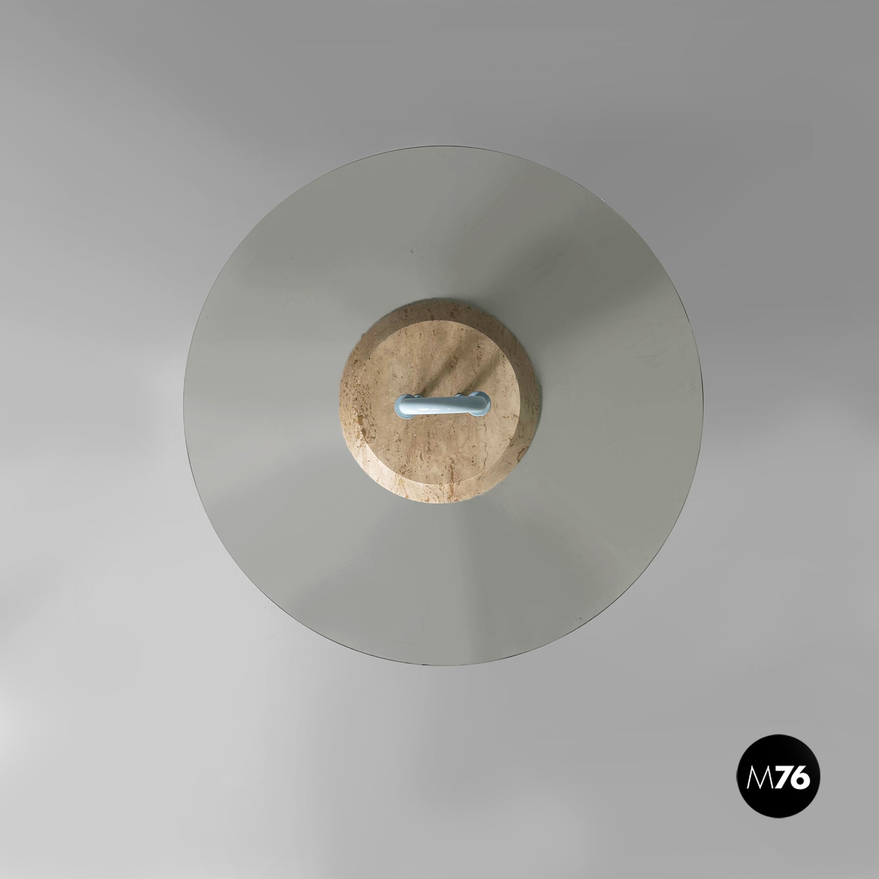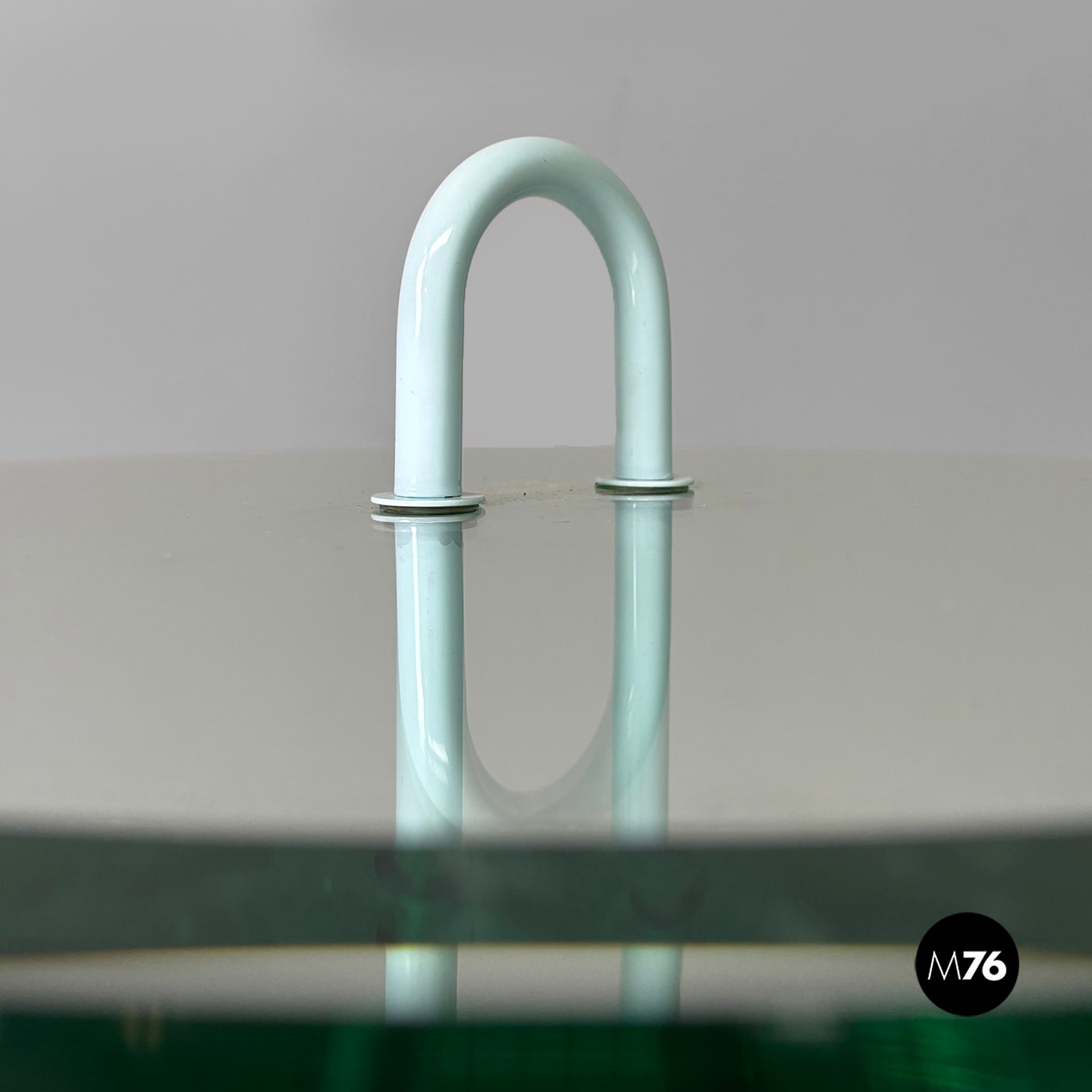 Coffee table in metal, glass, and travertine. The frame is made of light blue painted metal. The top is round and made of thick glass. The round base is made of travertine.