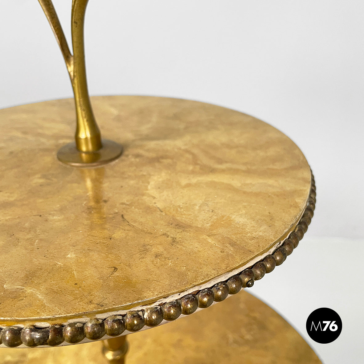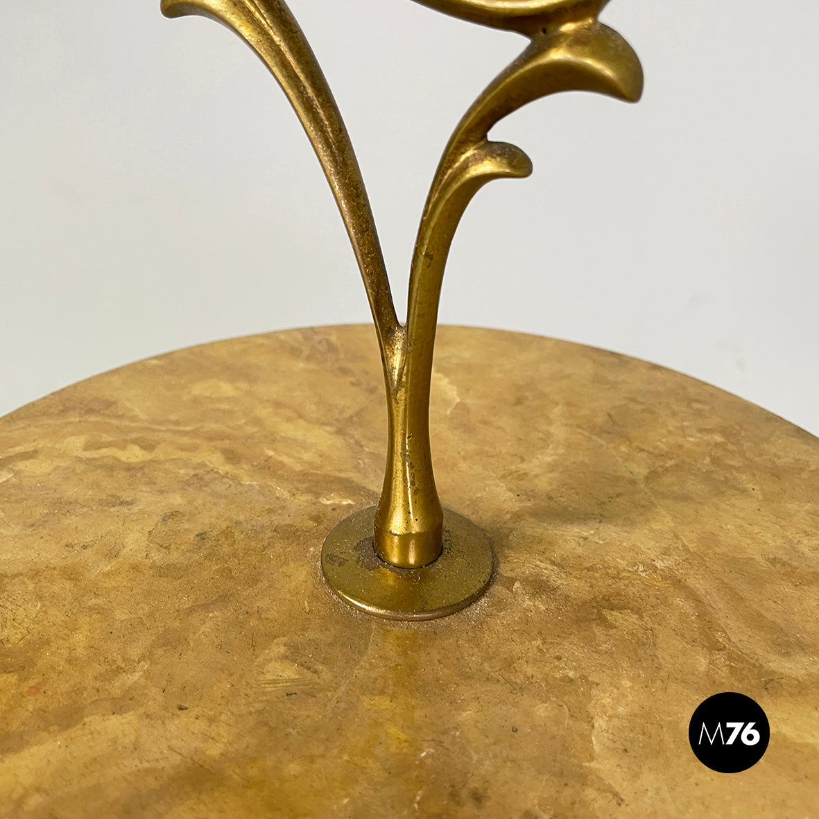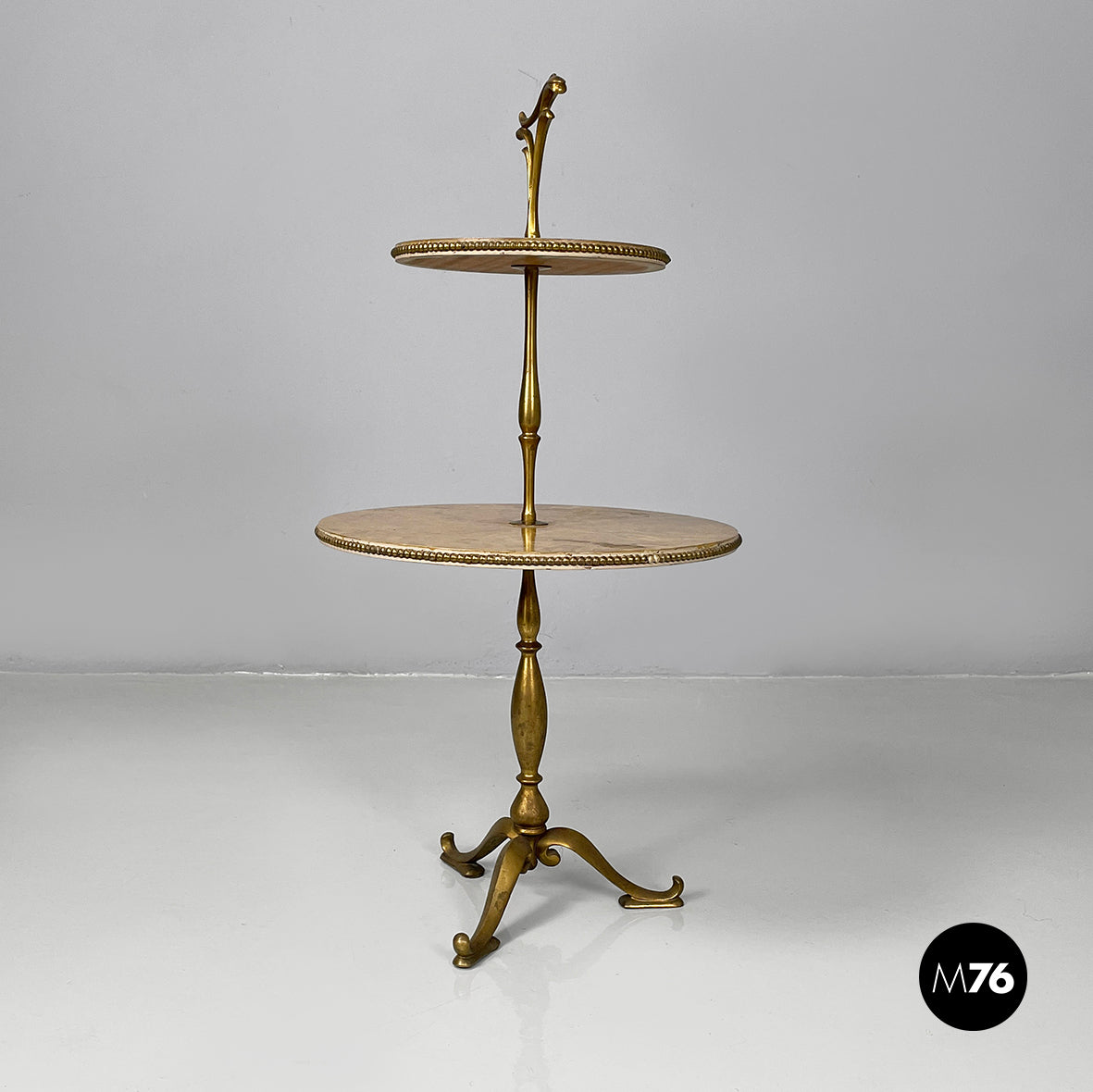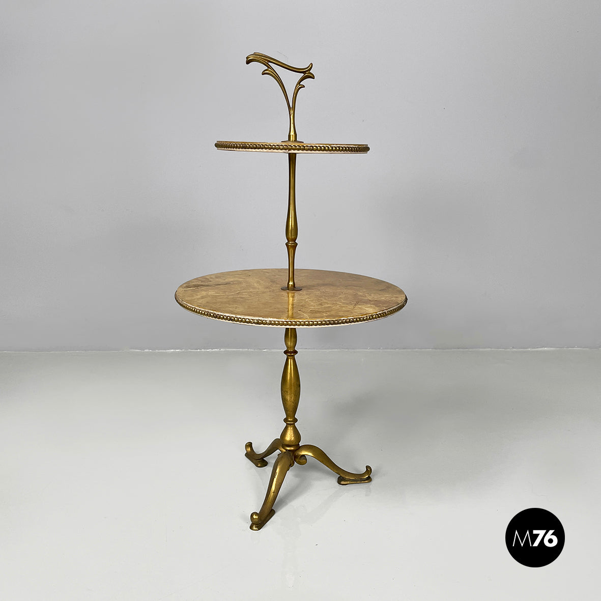 Coffee table with double round top in yellow painted wood with marble effect. On the profile of the two tops there are round brass details. On the upper part there is a triangular brass handle. The central shaped structure and the three shaped legs are in brass.