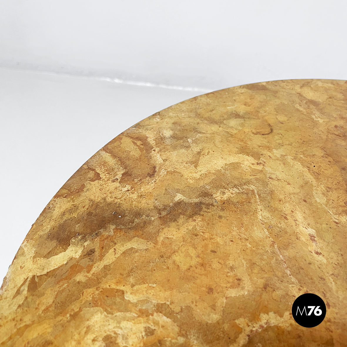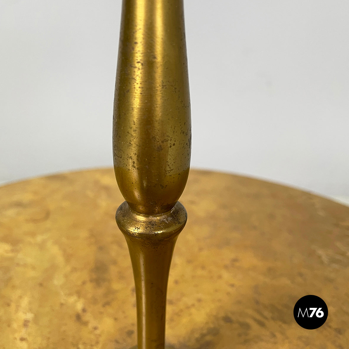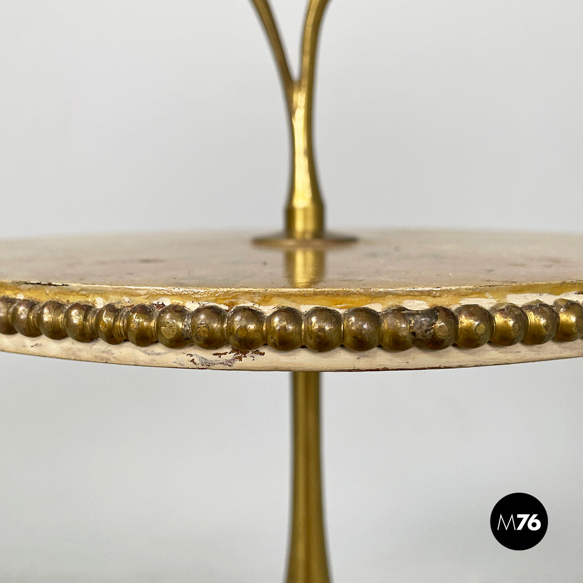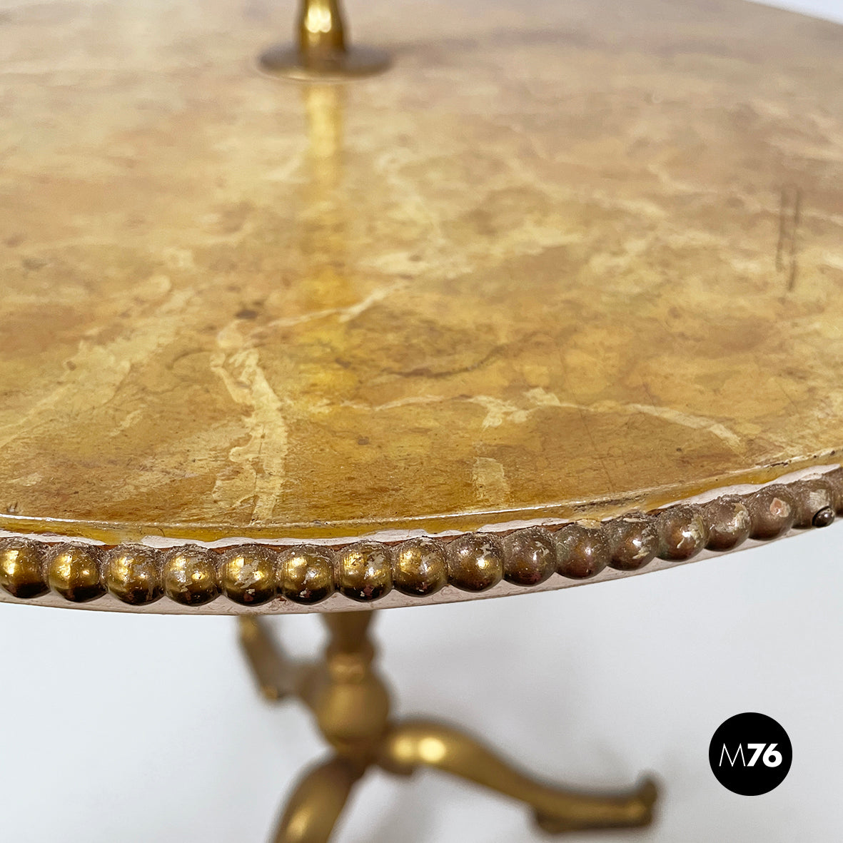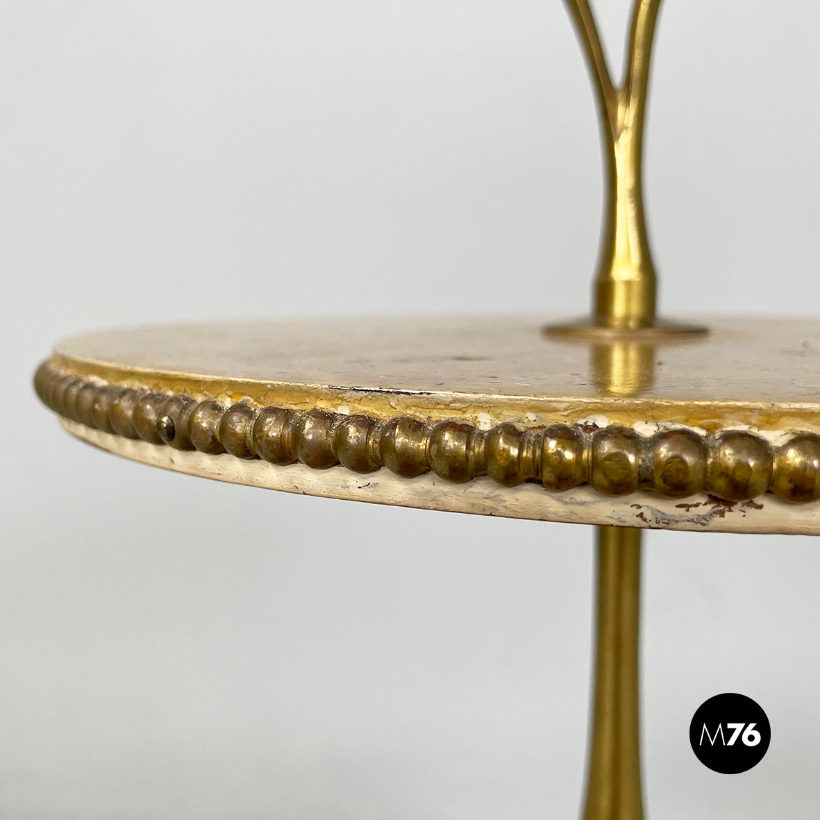 Coffee table with double round top in yellow painted wood with marble effect. On the profile of the two tops there are round brass details. On the upper part there is a triangular brass handle. The central shaped structure and the three shaped legs are in brass.