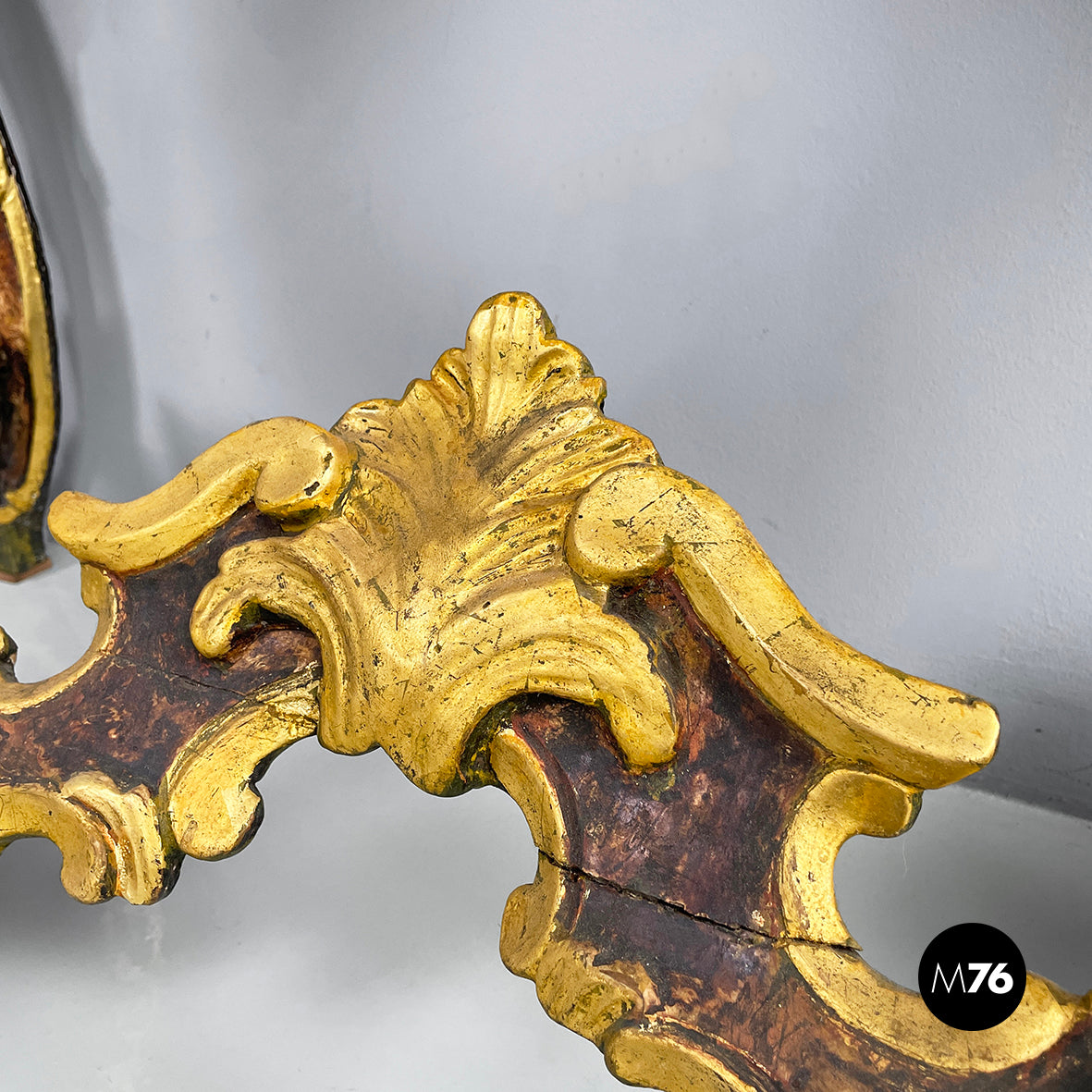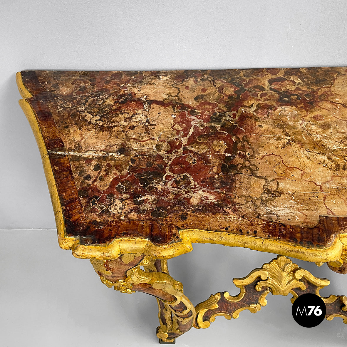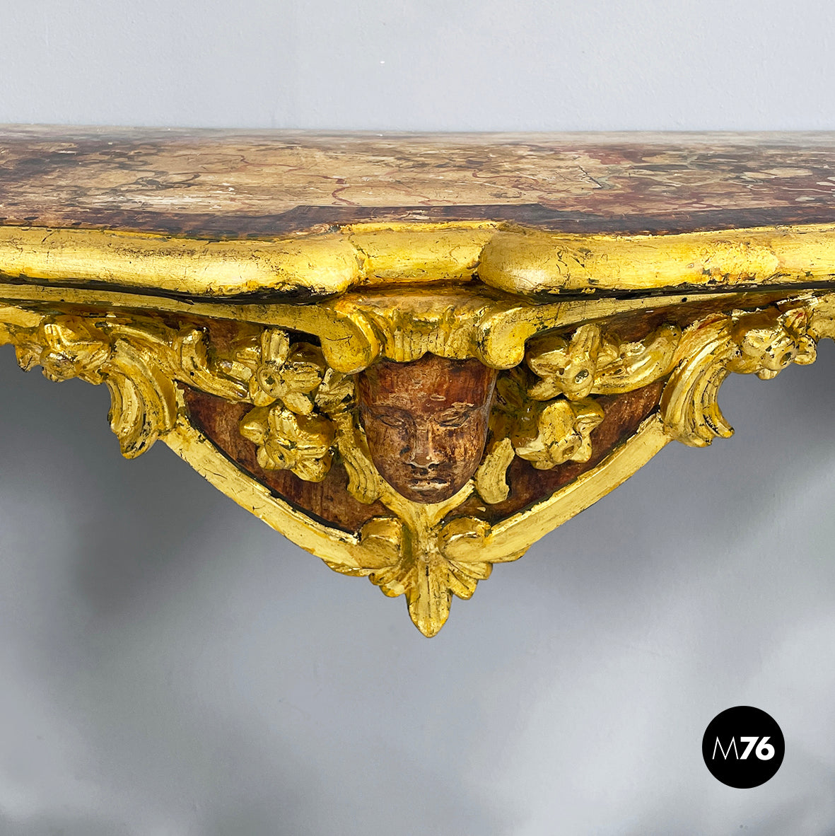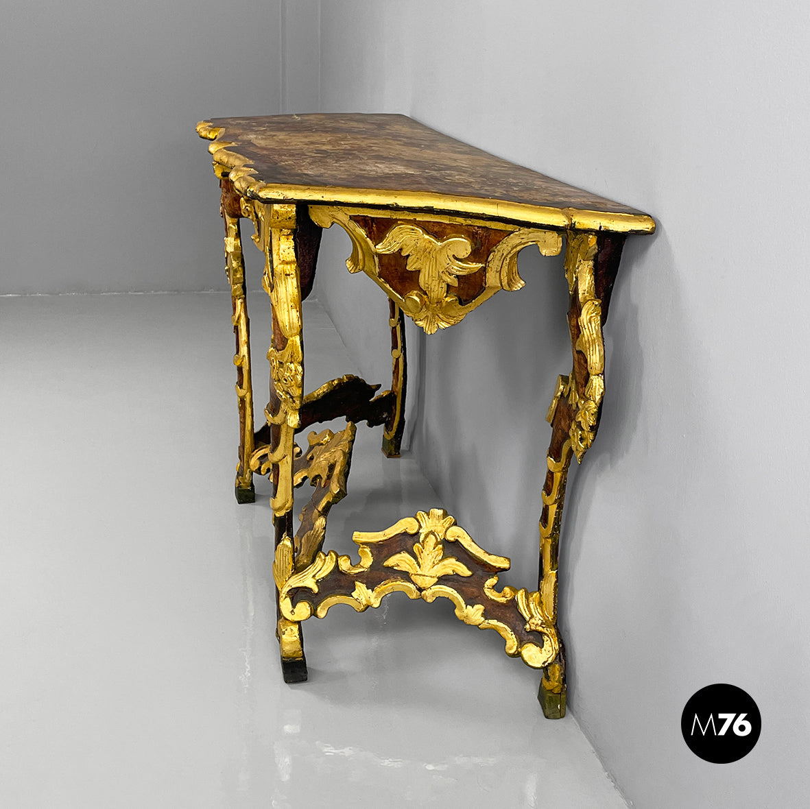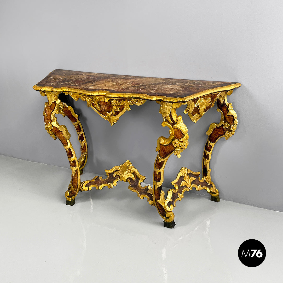 Console table entirely in finely crafted wood. The shaped top is in painted wood with a marble effect and golden profiles. The shaped legs and the shaped parts at the base have numerous gold inserts in the shape of flowers and curls. Square feet in black painted wood.