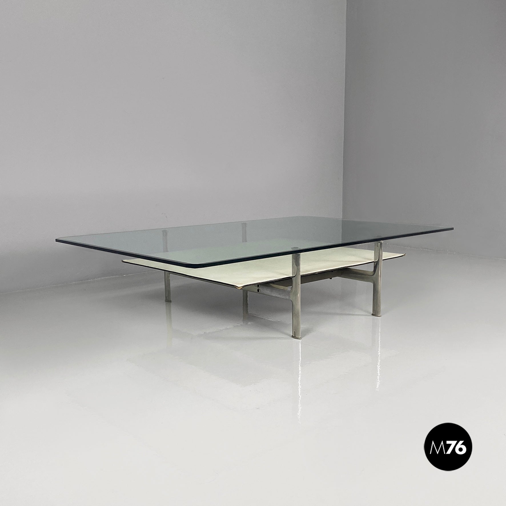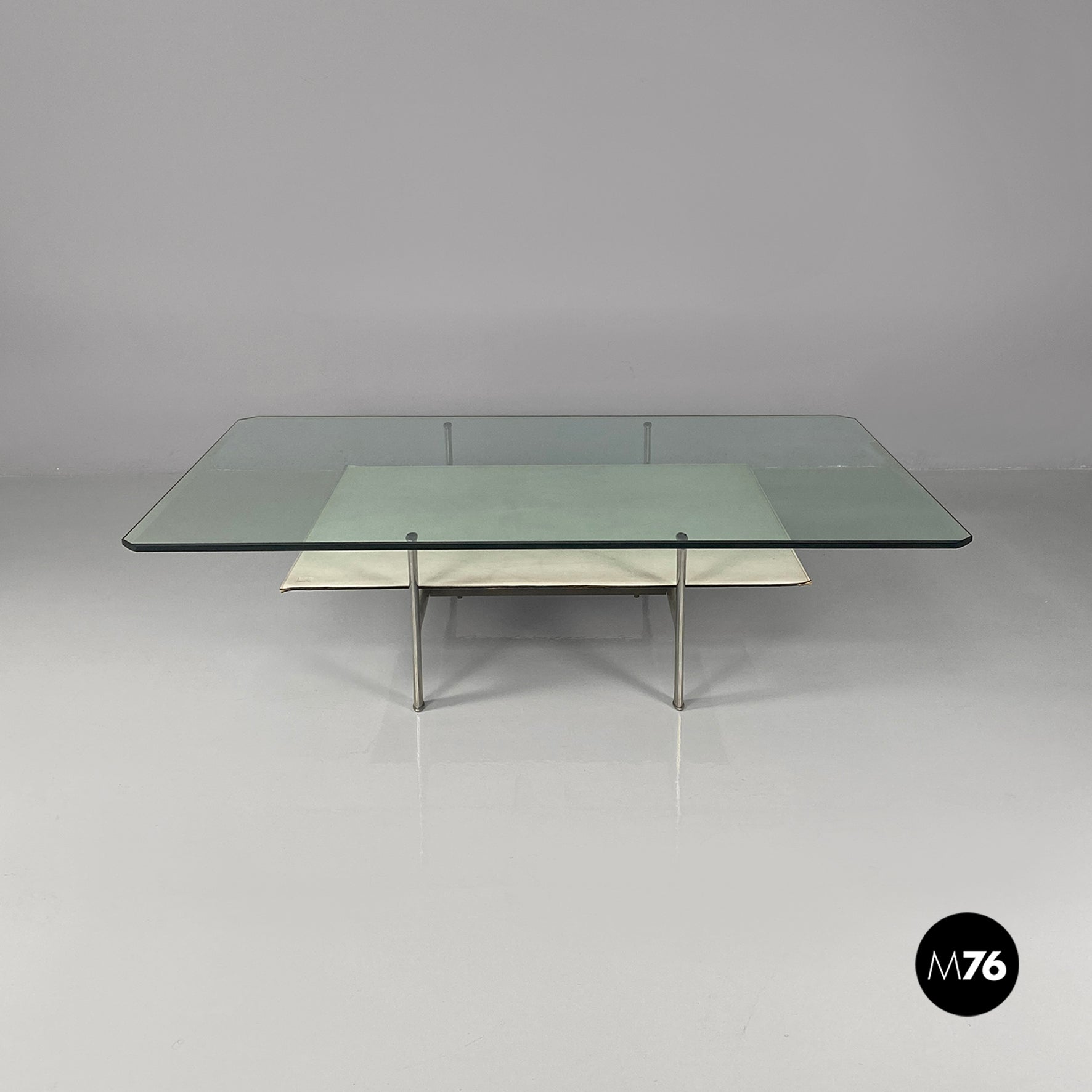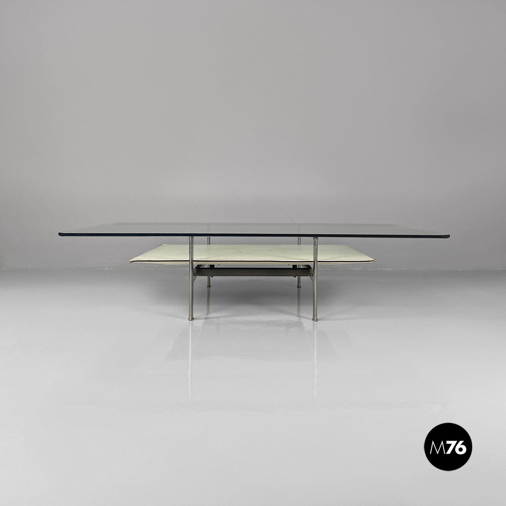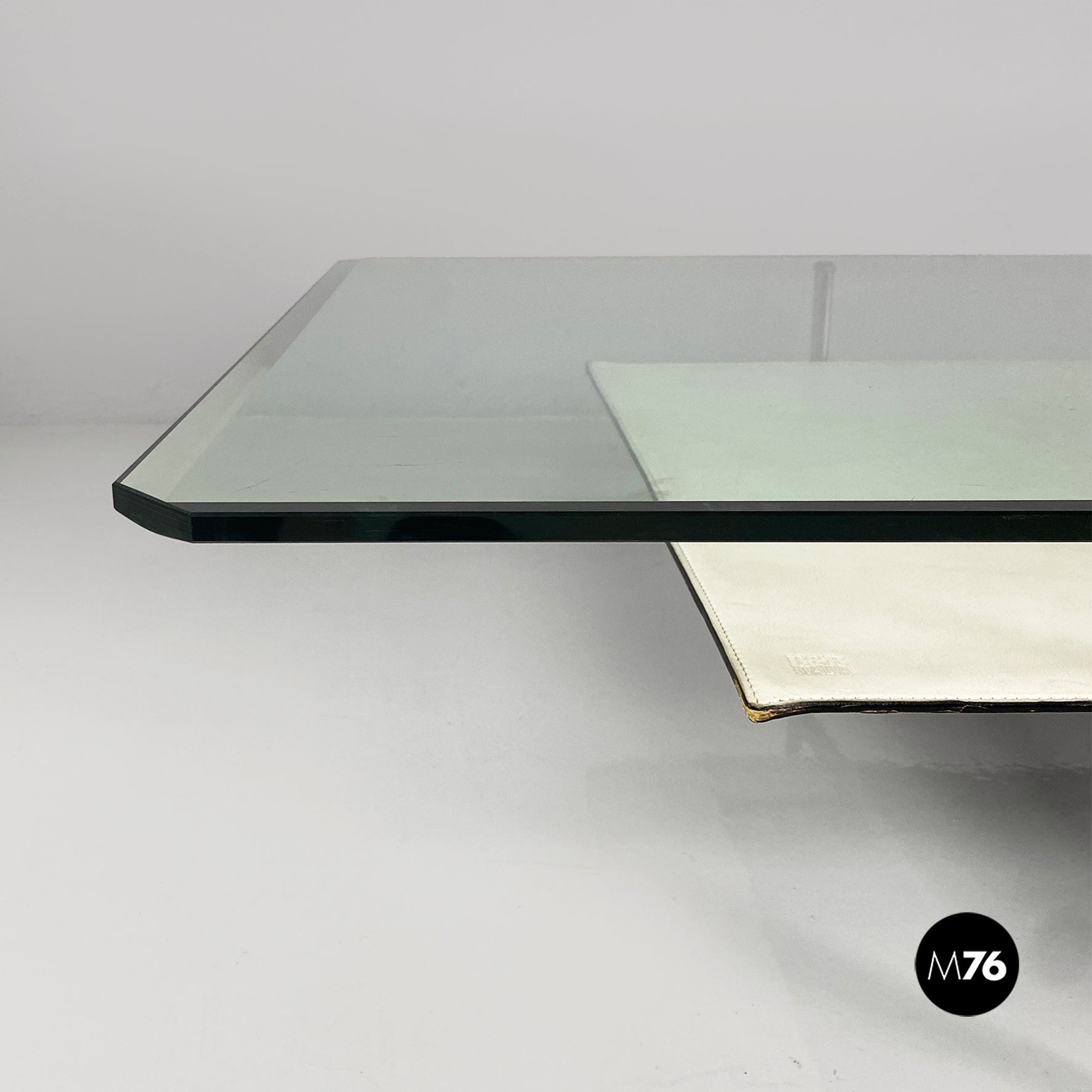 Coffee table model Diesis with two tops, one in clear cut glass and the other covered in white leather and with steel legs.