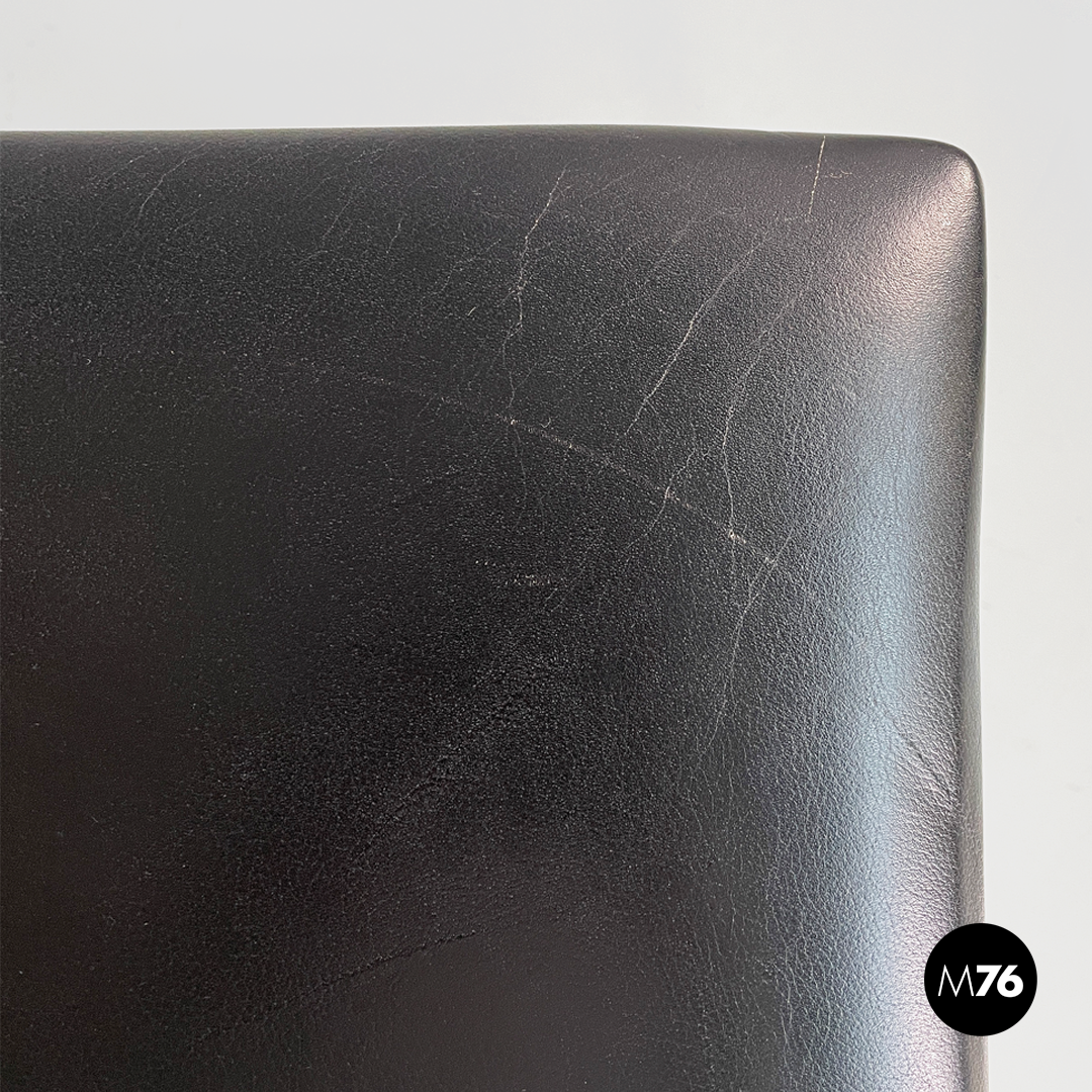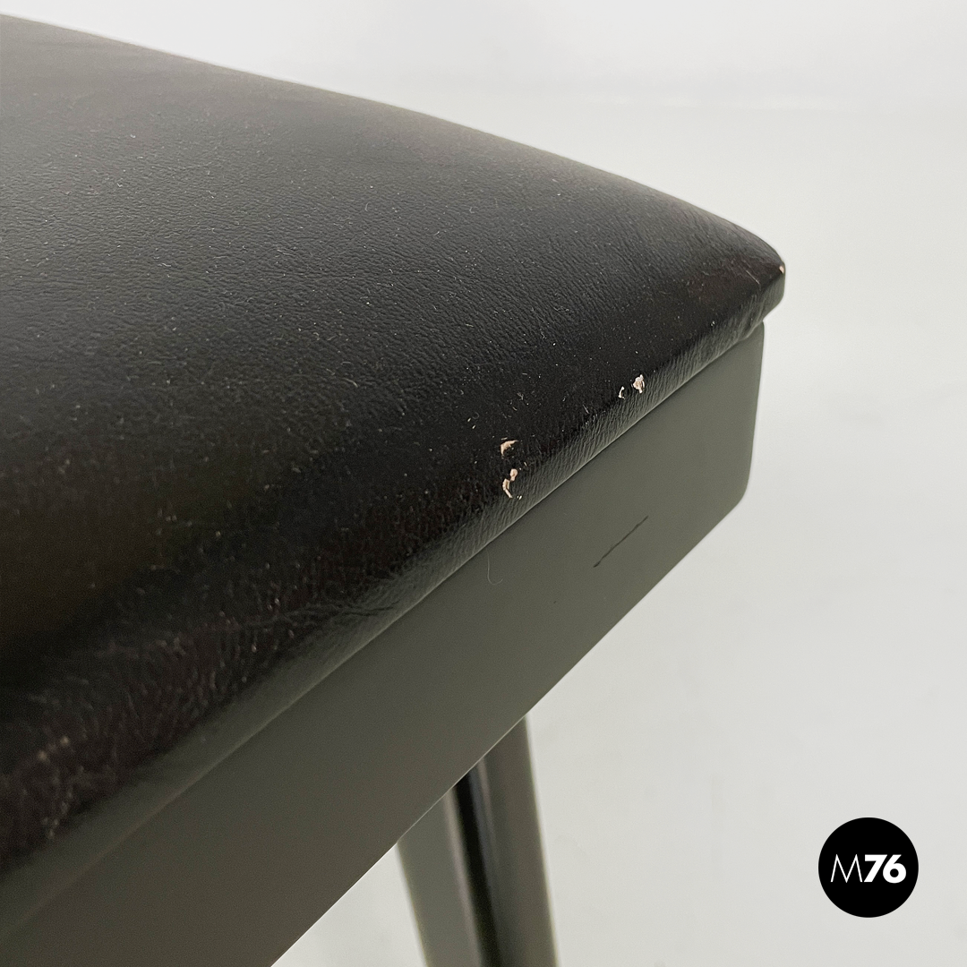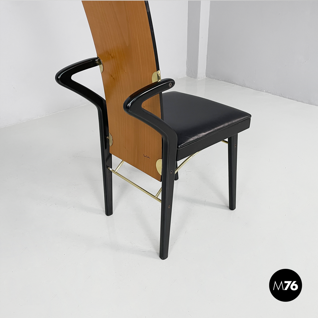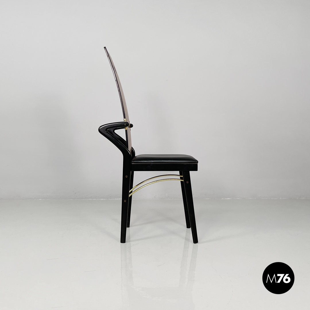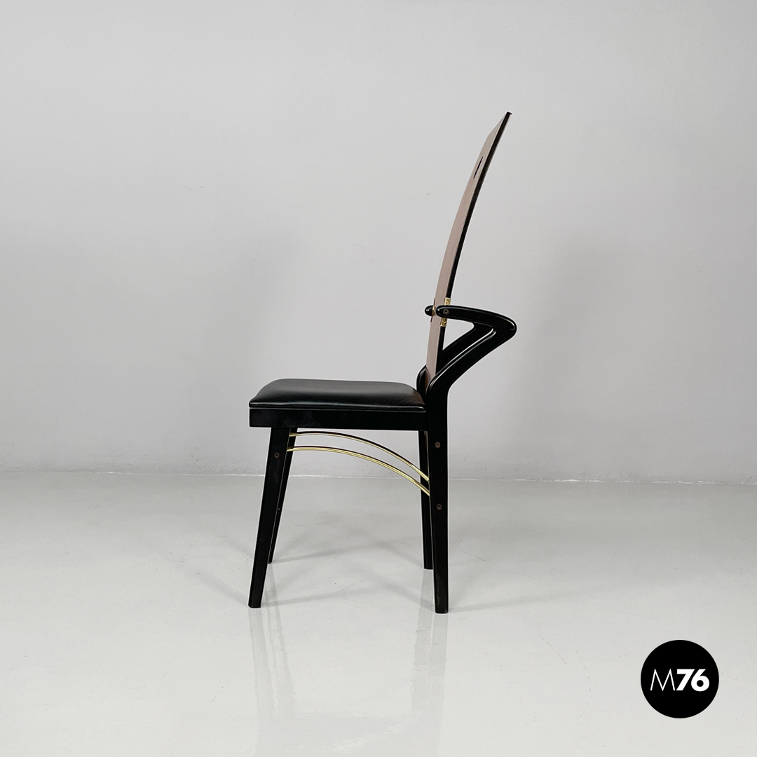 Set of four cherry wood chairs. The backrest is made of curved wood with a decorative cut and hole. The rectangular seat is padded and upholstered in black leather with black-painted wood accents. The legs are made of black-painted wood with tubular brass inserts.