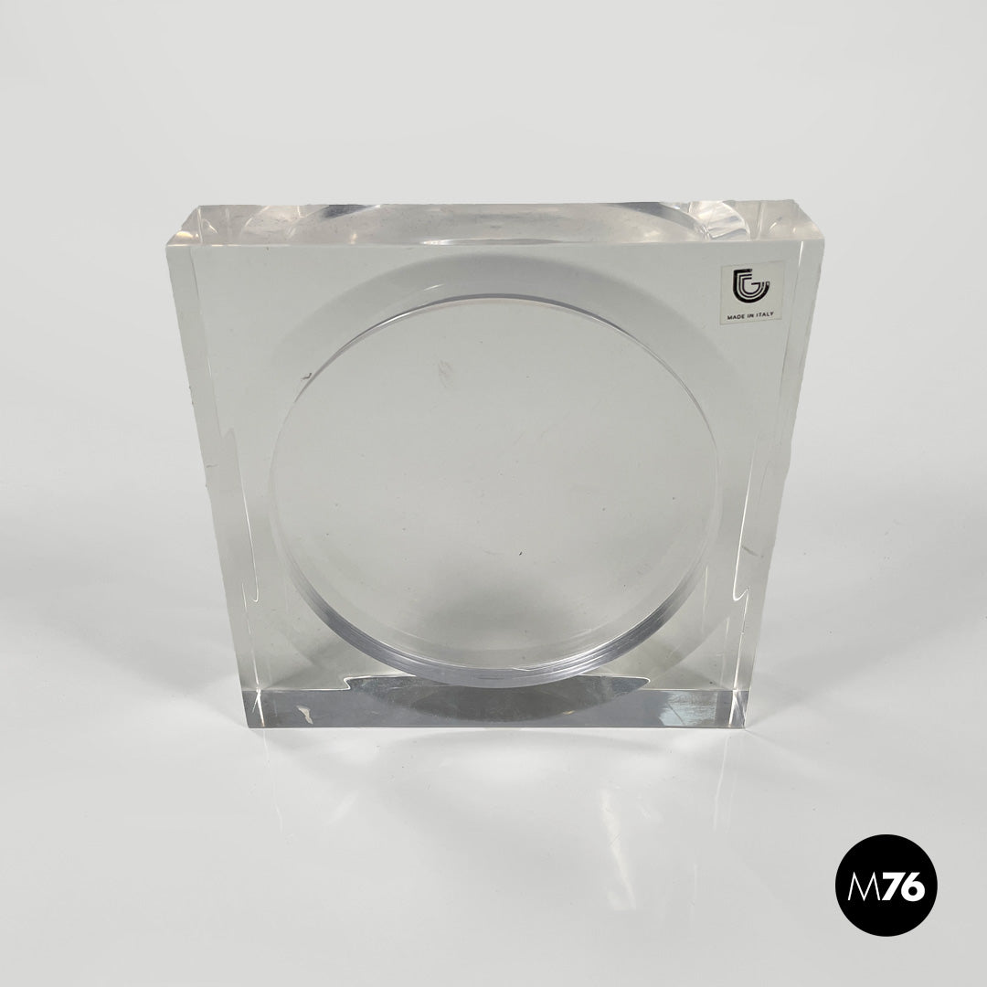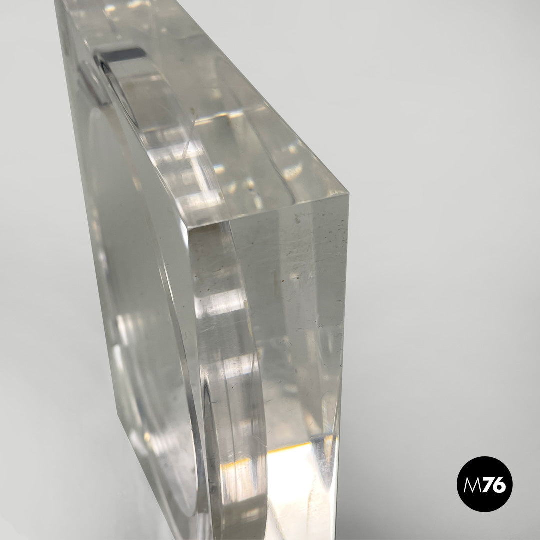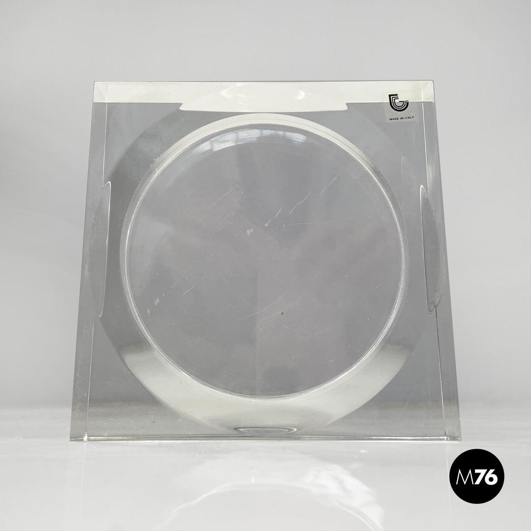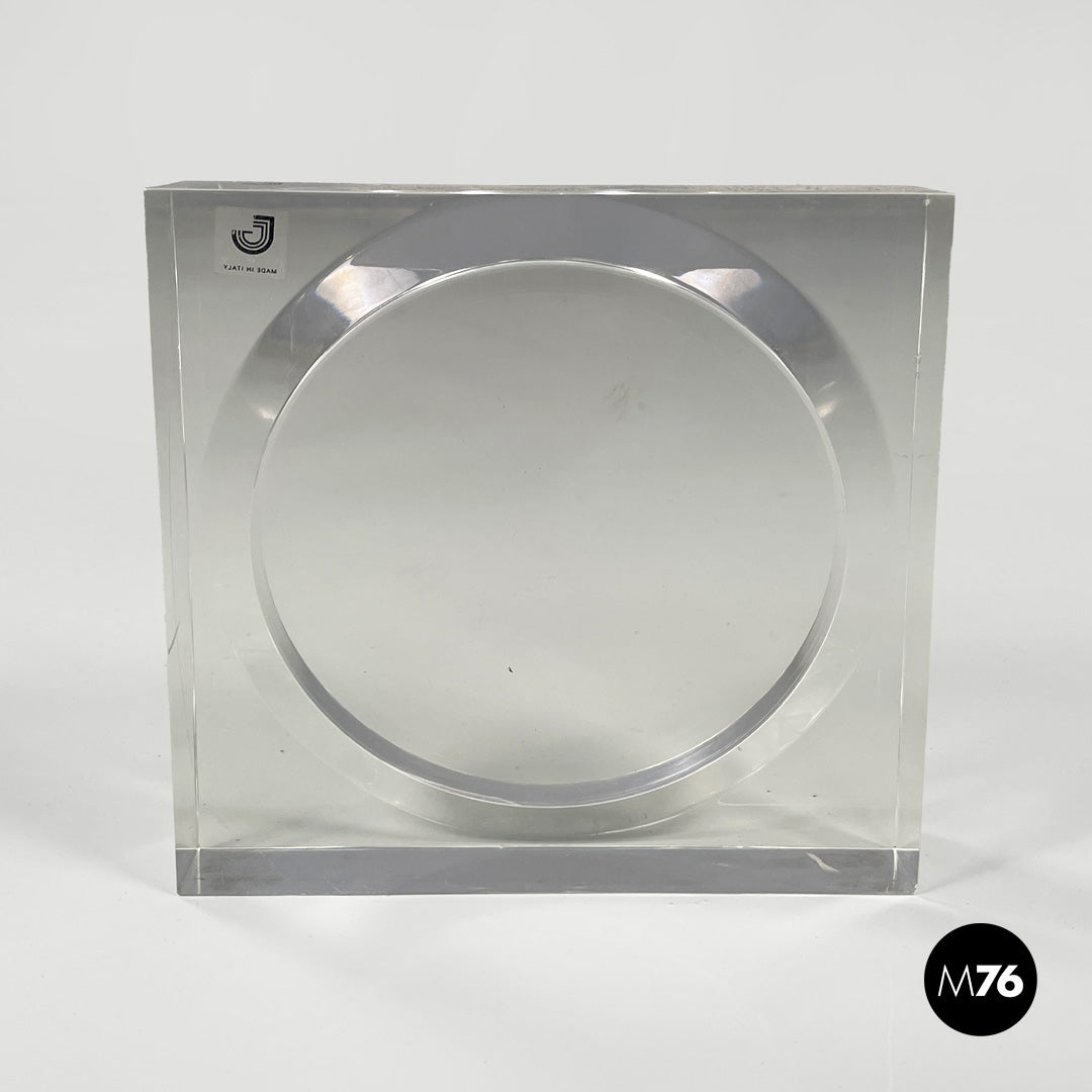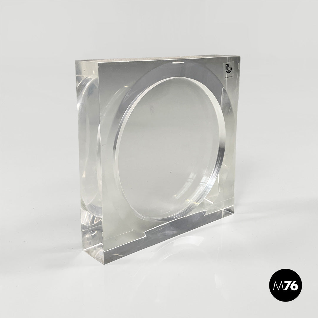 Transparent lucite frame composed of two pieces, a square base with a recess into which a round is inserted.