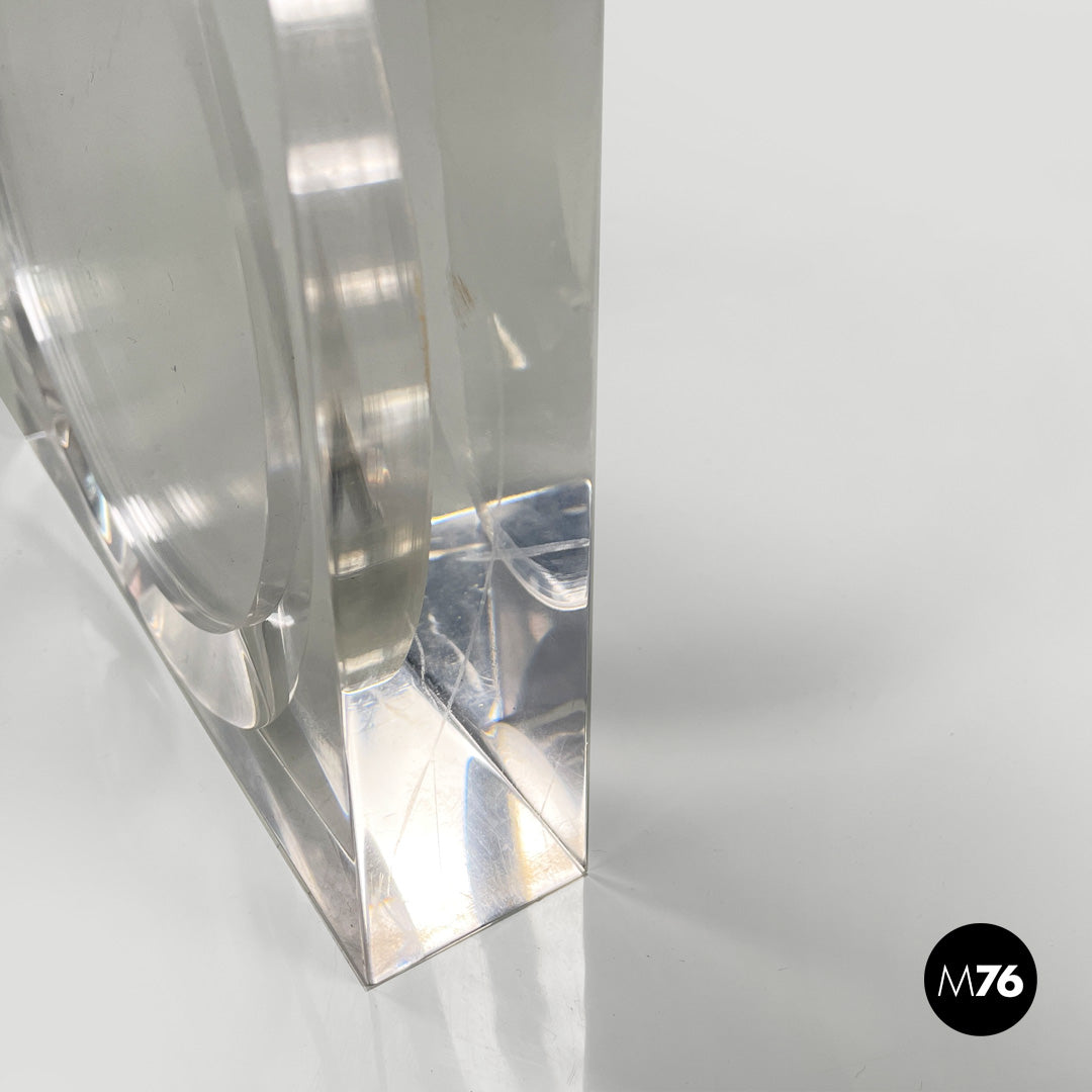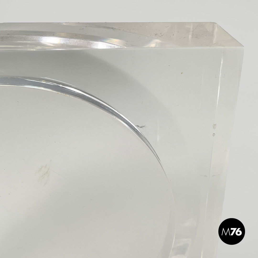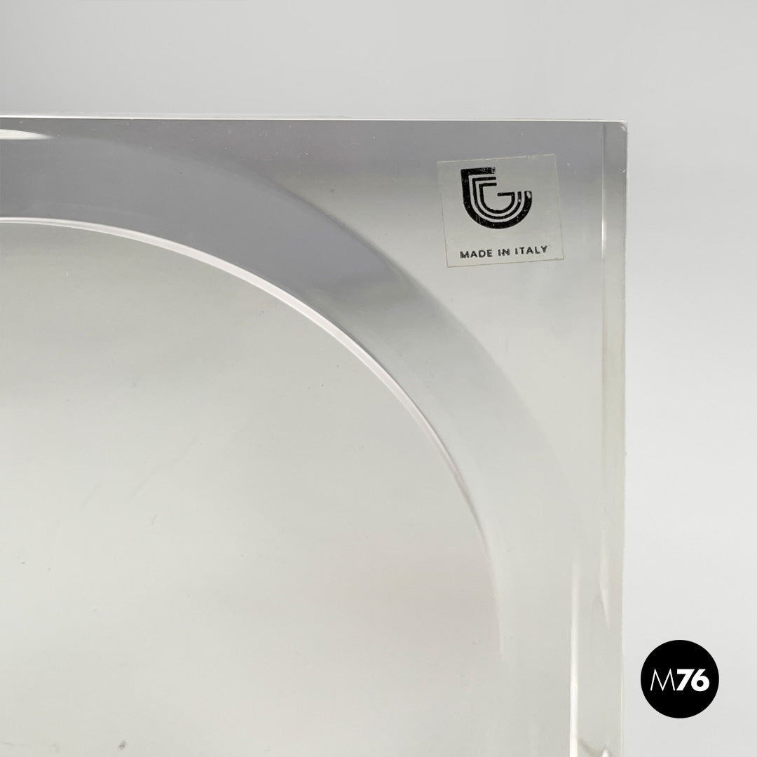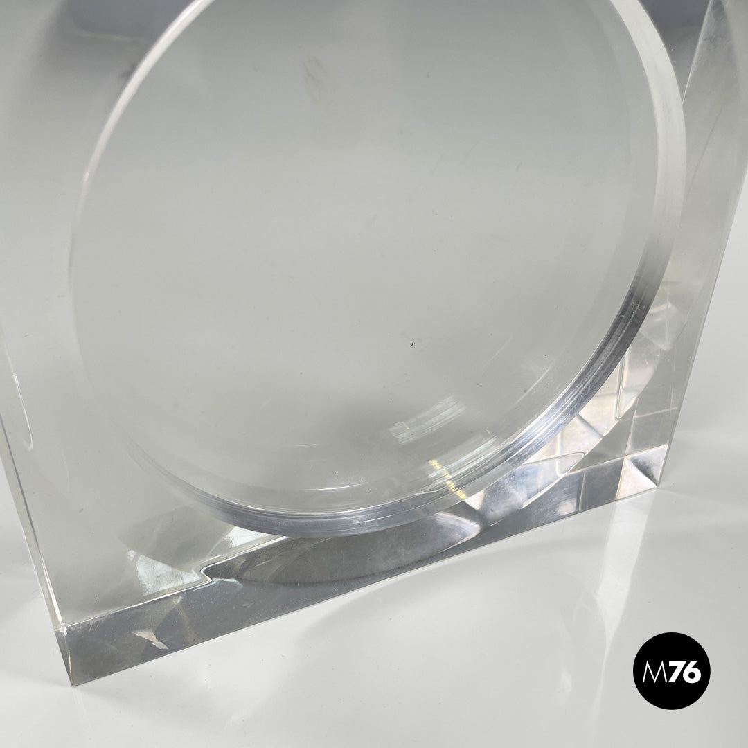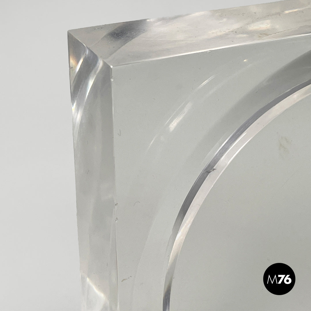 Transparent lucite frame composed of two pieces, a square base with a recess into which a round is inserted.