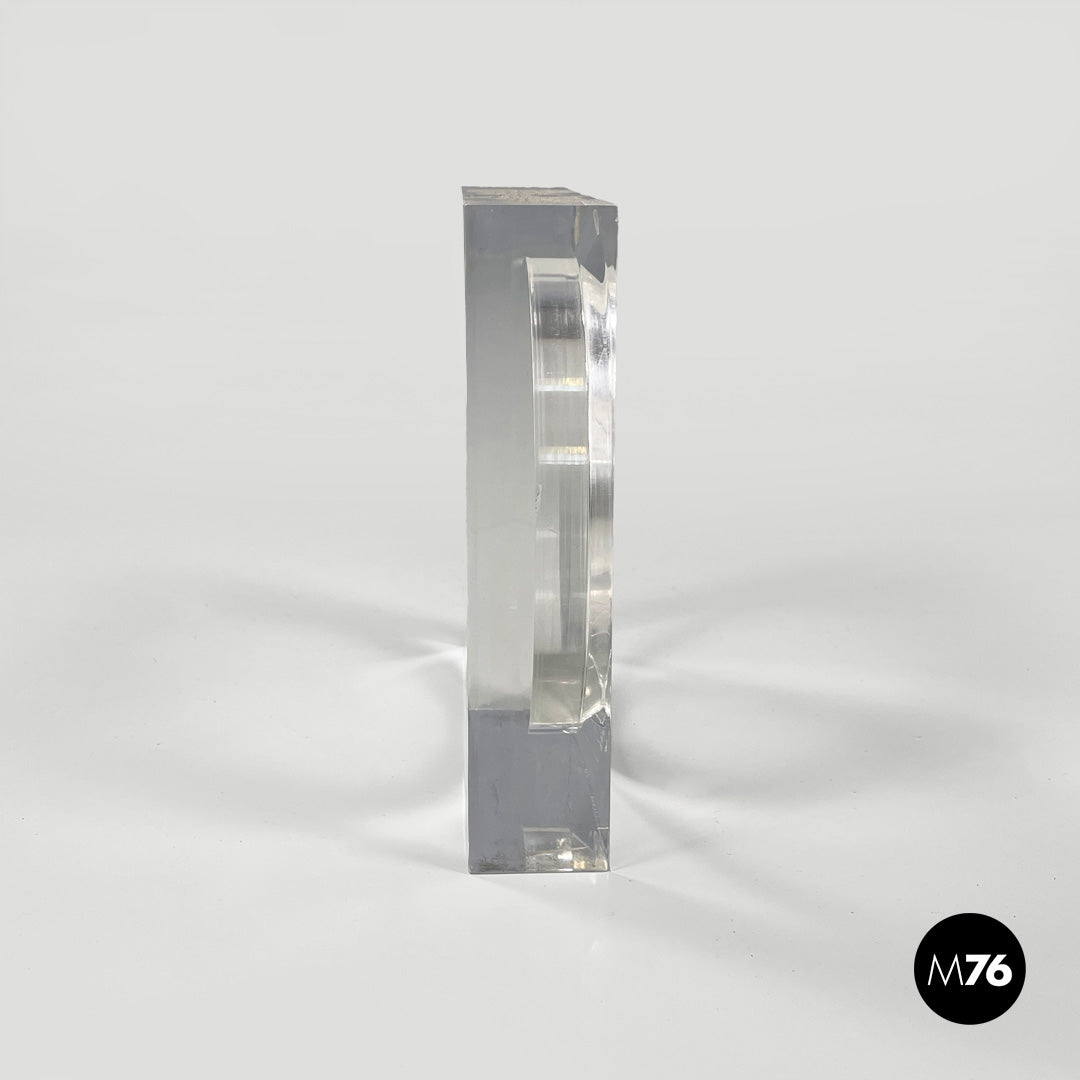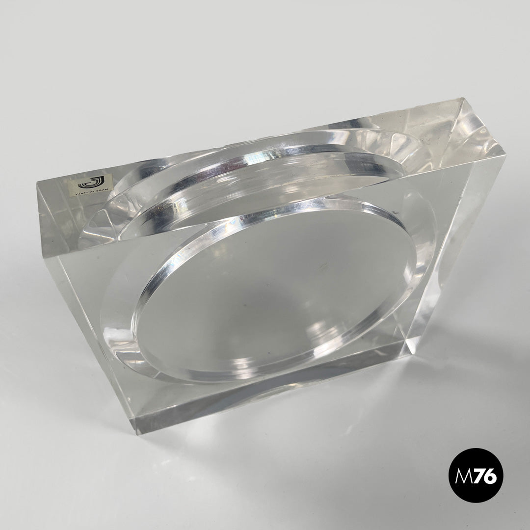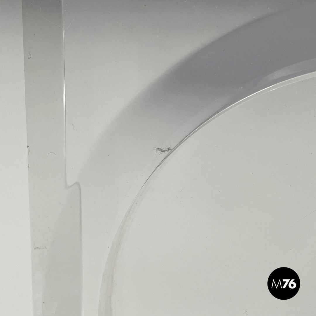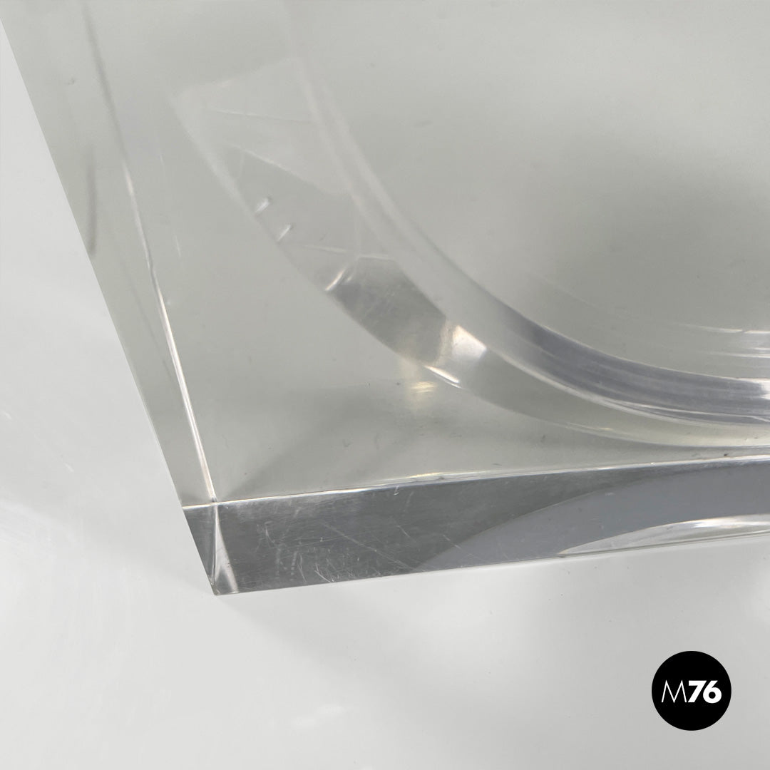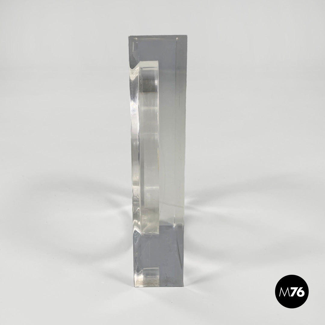 Transparent lucite frame composed of two pieces, a square base with a recess into which a round is inserted.