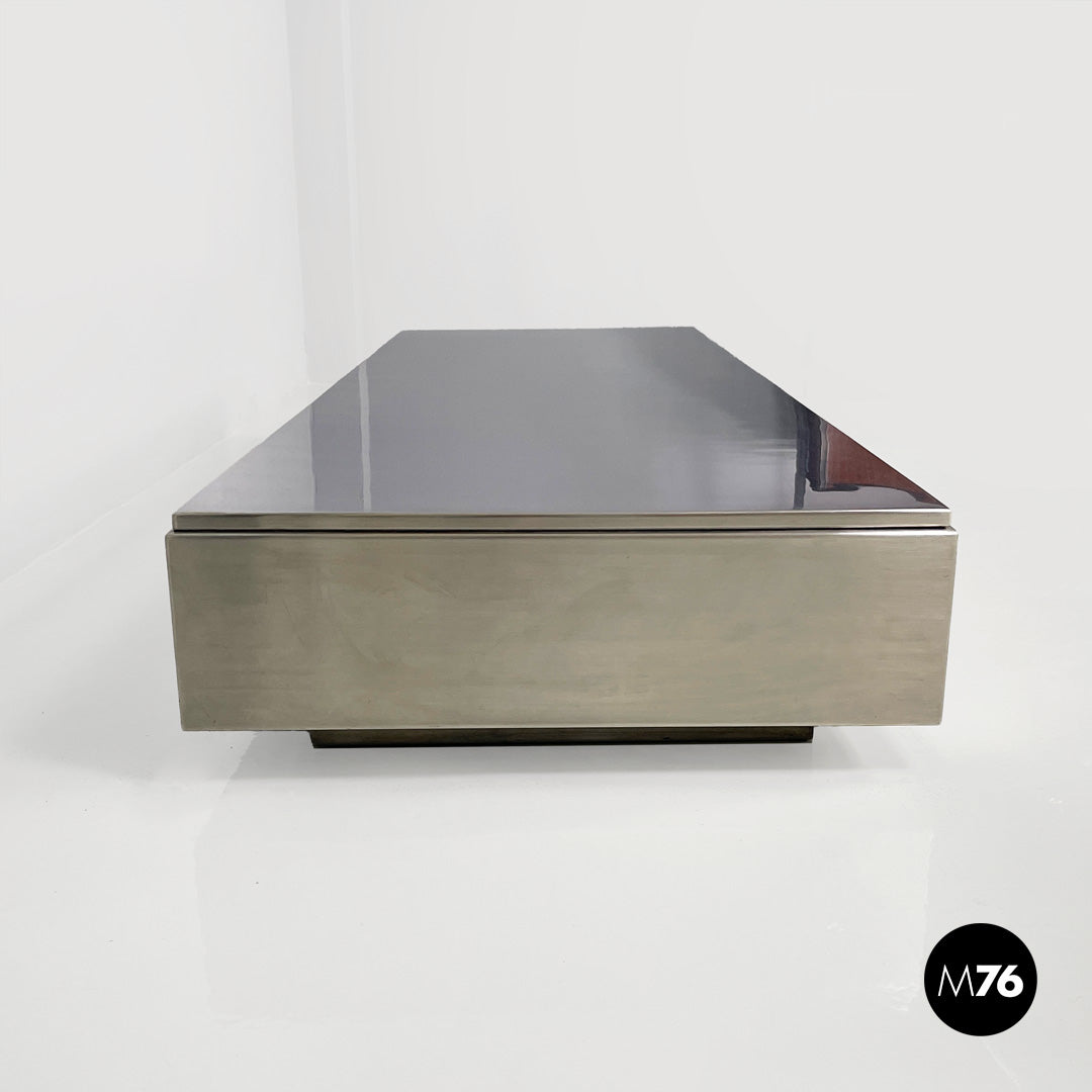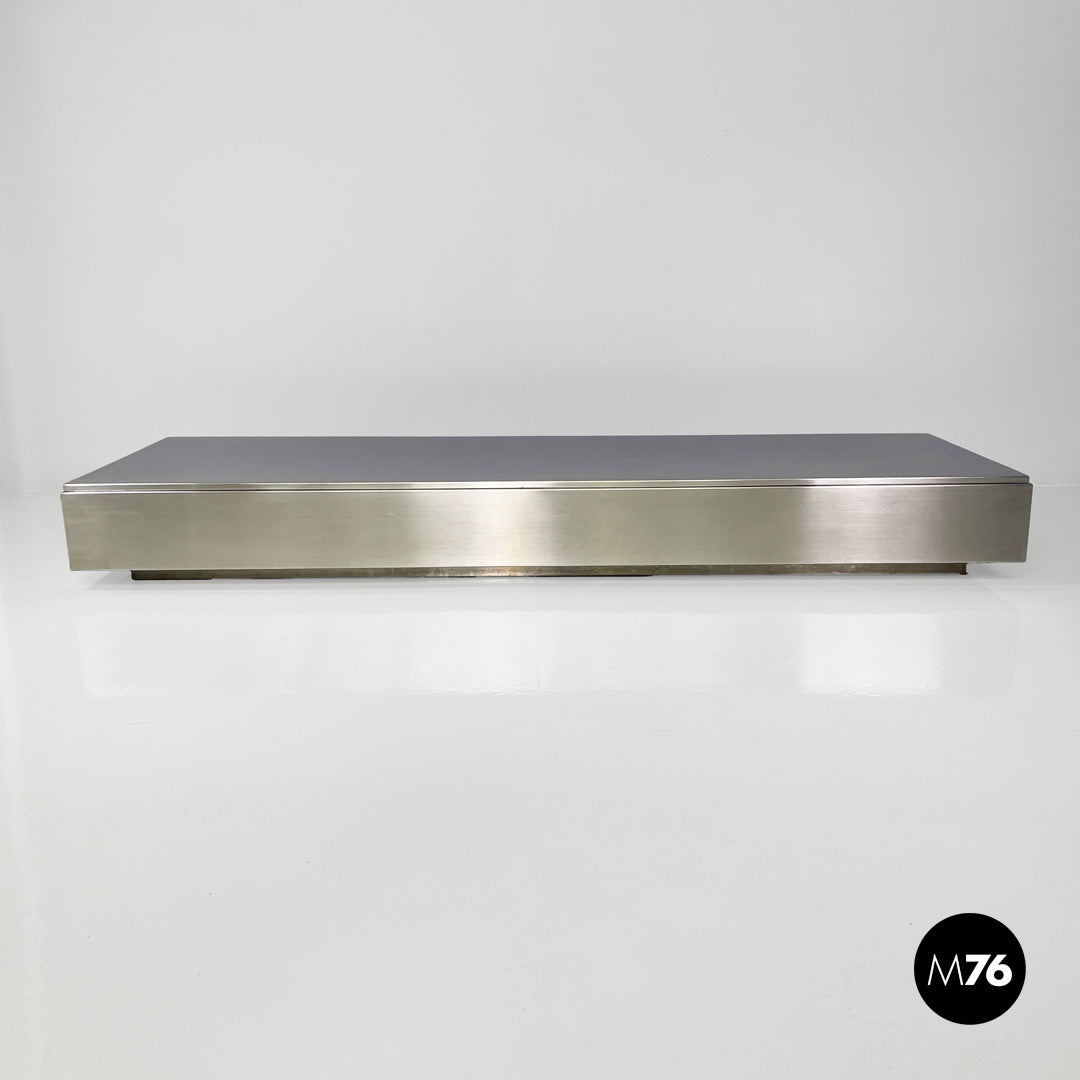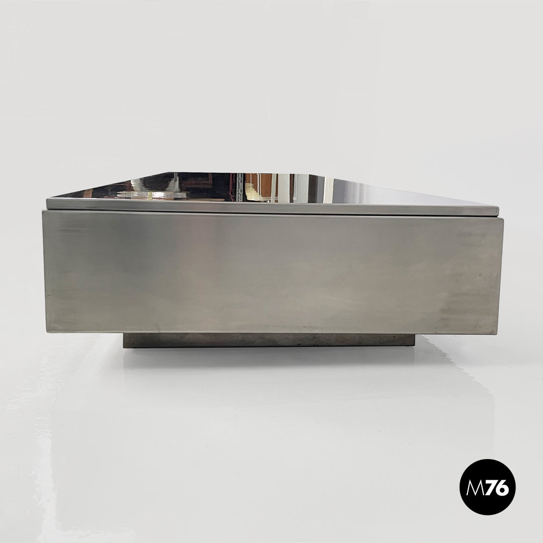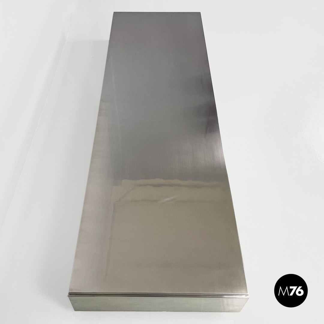 Rectangular coffee table made entirely of steel. The metal base is narrower. The corners are rounded.