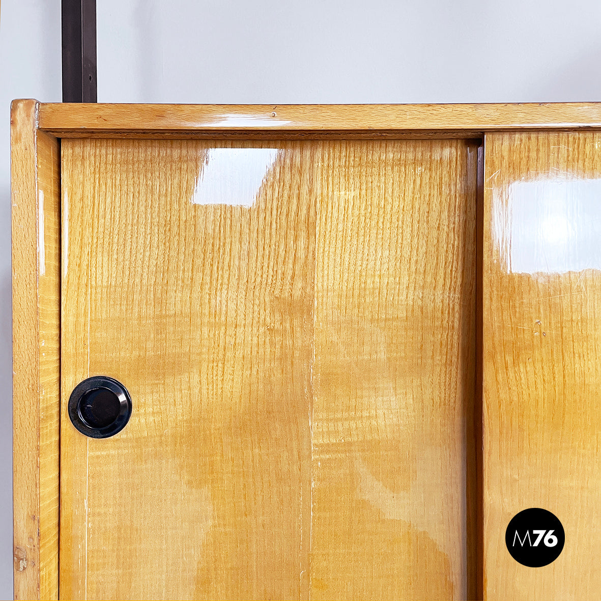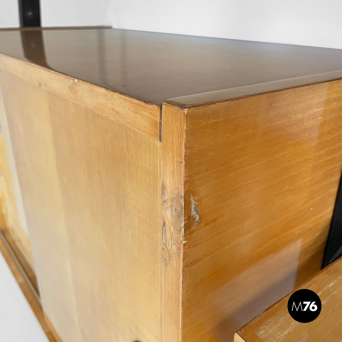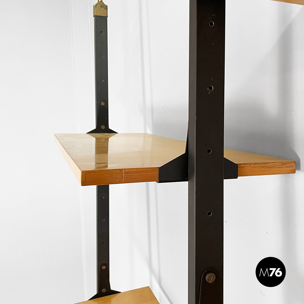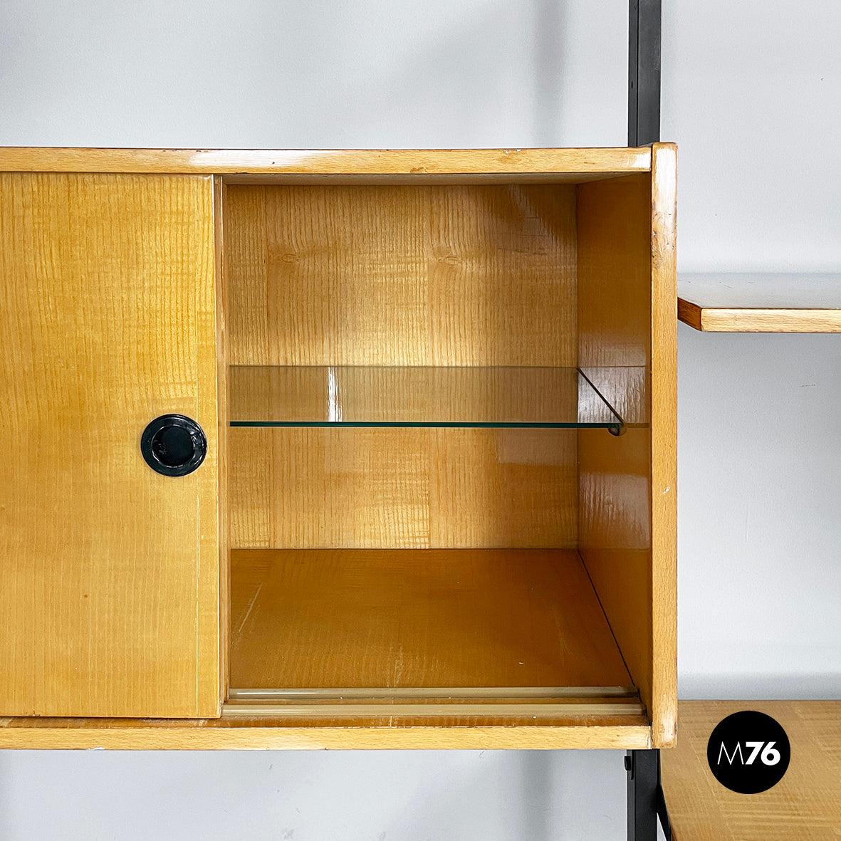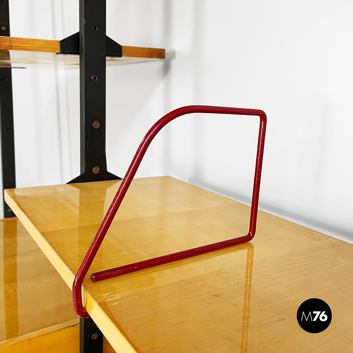 Modular floor-to-ceiling bookcase in light wood and black painted metal, composed of nine rectangular shelves and two storage modules. The compartments have a sliding opening with a round black handle and an internal glass shelf. There are two bookends in red metal rod, which can be positioned as desired. The four square-section uprights in black painted metal have round brass tips, which can be extended. All the modules are positionable as desired.