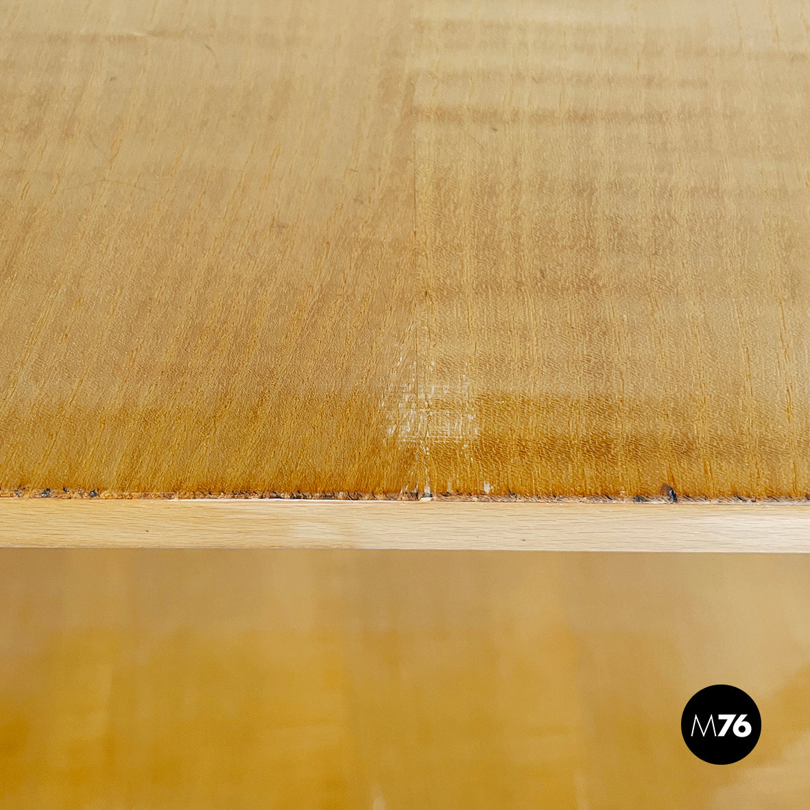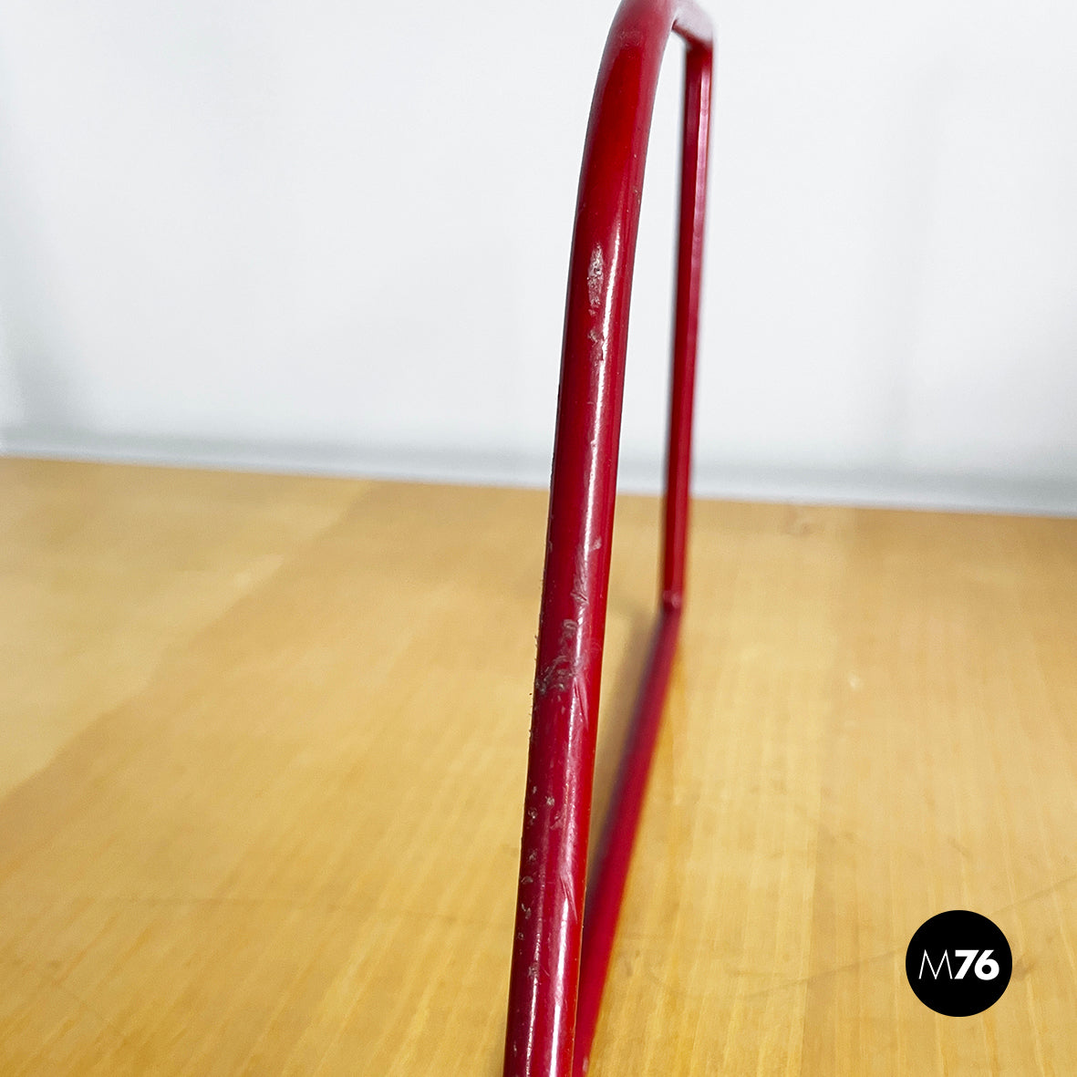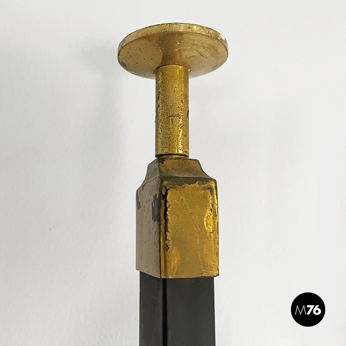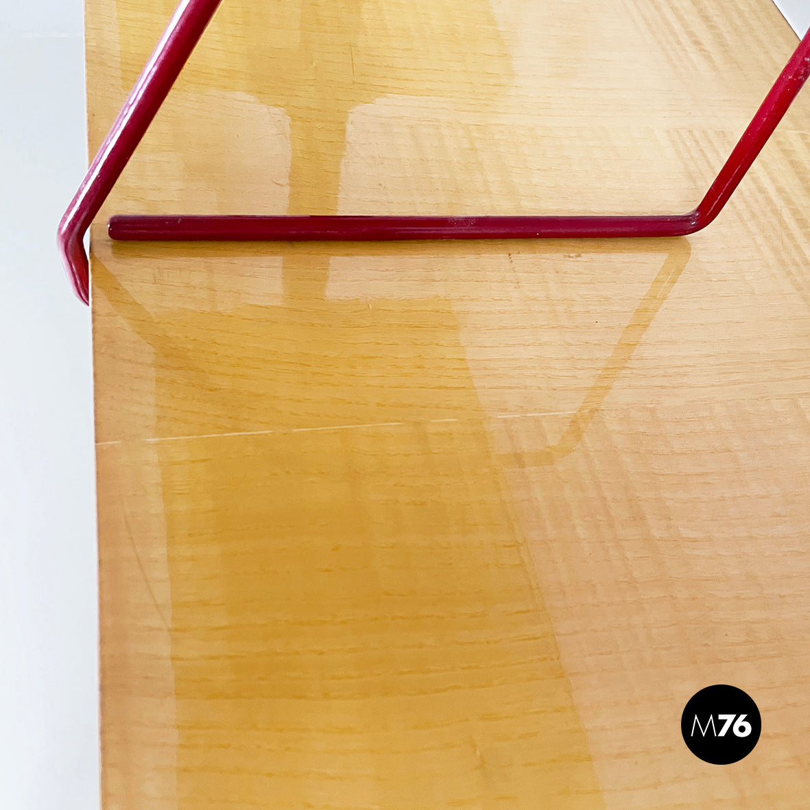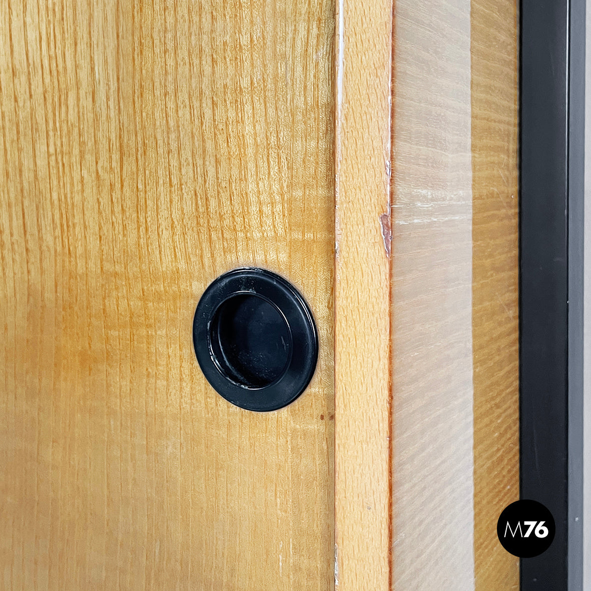 Modular floor-to-ceiling bookcase in light wood and black painted metal, composed of nine rectangular shelves and two storage modules. The compartments have a sliding opening with a round black handle and an internal glass shelf. There are two bookends in red metal rod, which can be positioned as desired. The four square-section uprights in black painted metal have round brass tips, which can be extended. All the modules are positionable as desired.