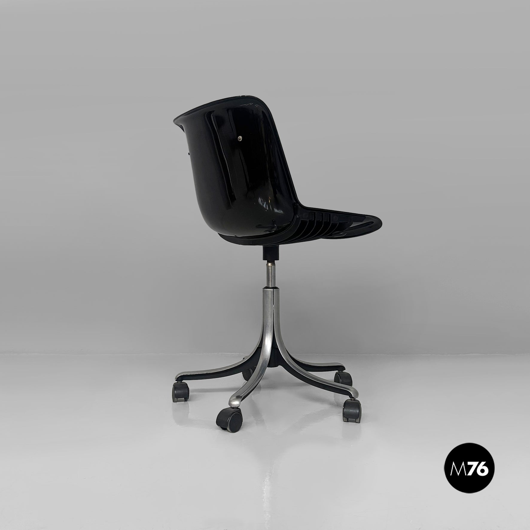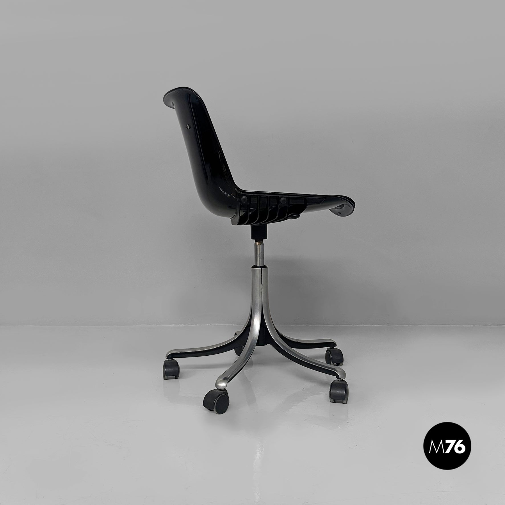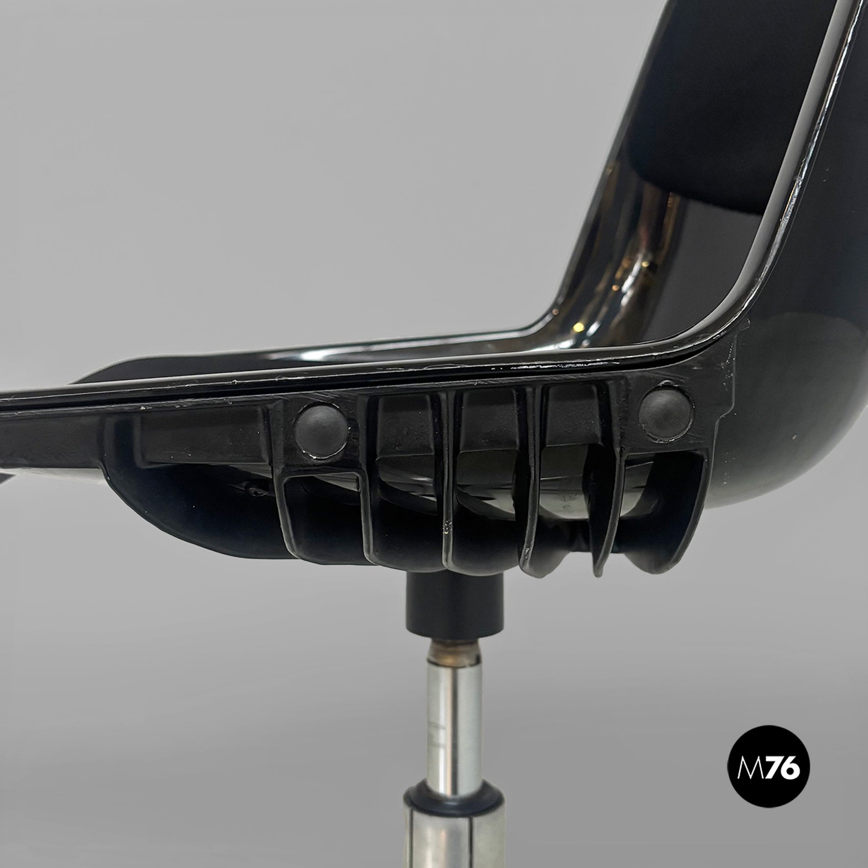 Office or desk chair model Modus with a black plastic monocoque seat and backrest, with padded cushions upholstered in black fabric. Under the seat there is a black-painted metal structure with a lever for adjusting the seat height. The base is made of tubular metal. The five-spokes base, made of metal and black-painted metal, is equipped with five black casters for feet.