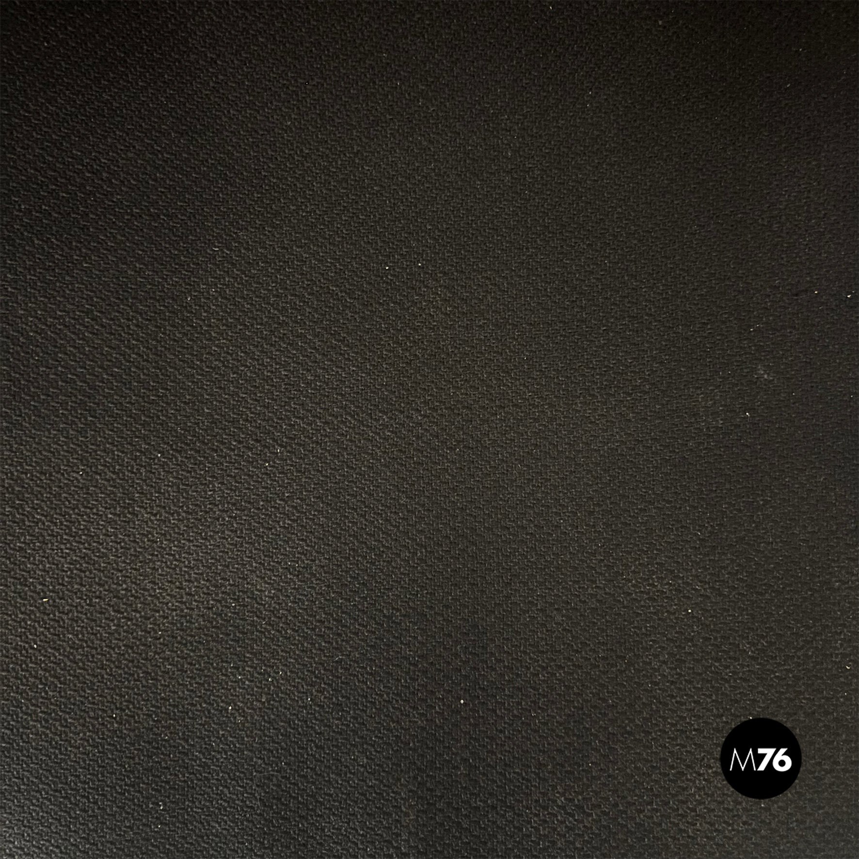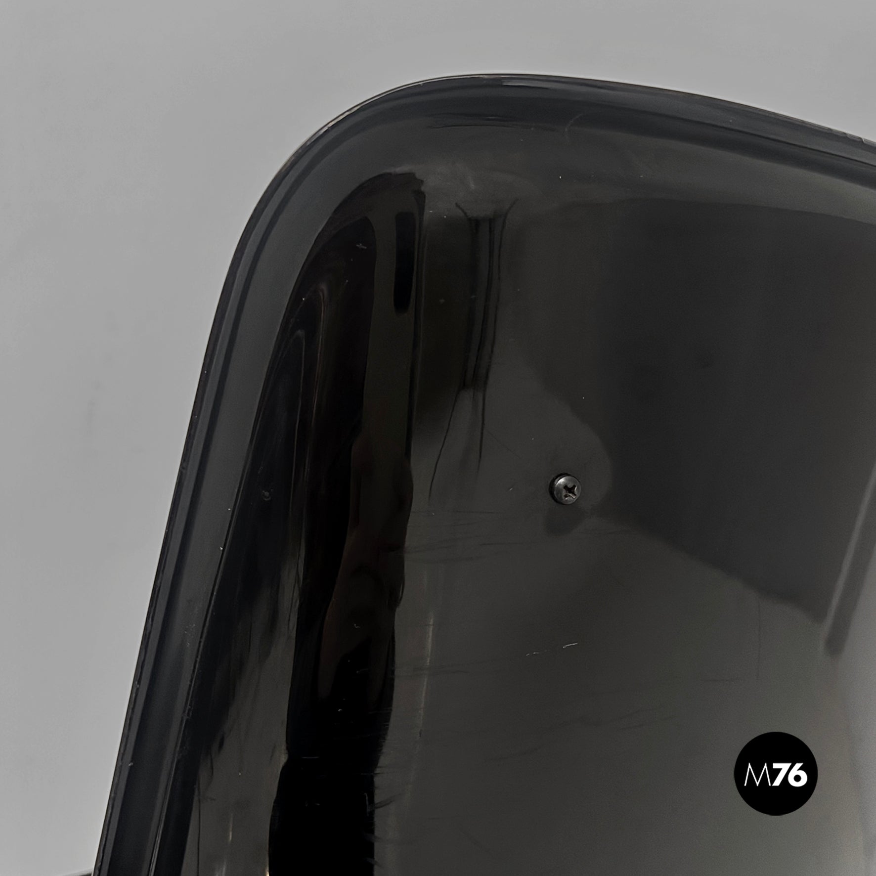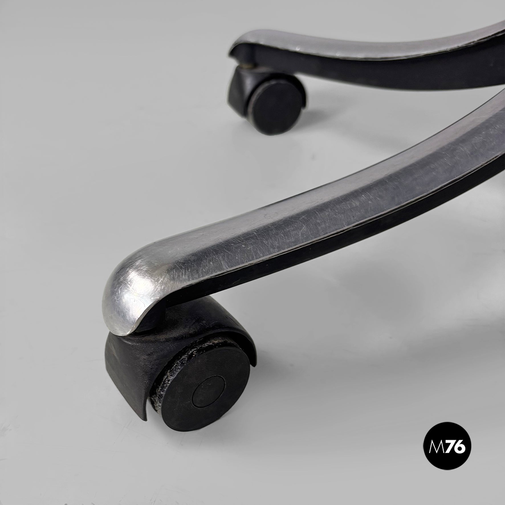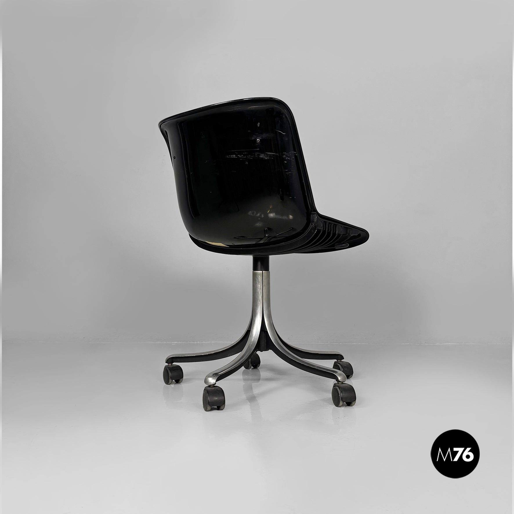 Office or desk chair model Modus with a black plastic monocoque seat and backrest, with padded cushions upholstered in black fabric. Under the seat there is a black-painted metal structure with a lever for adjusting the seat height. The base is made of tubular metal. The five-spokes base, made of metal and black-painted metal, is equipped with five black casters for feet.