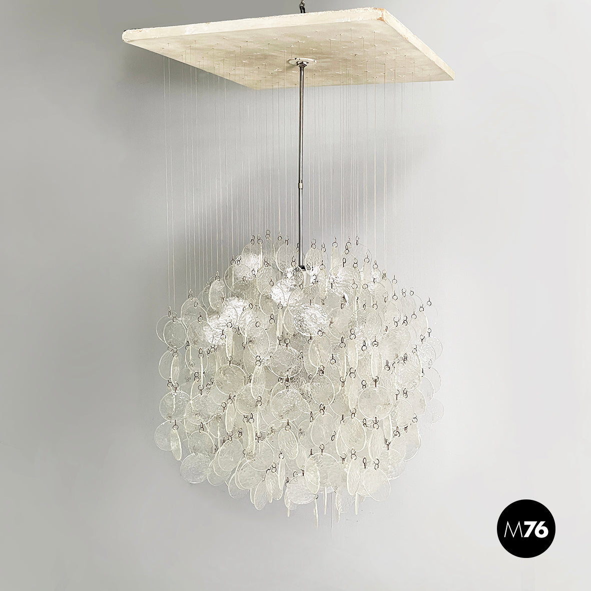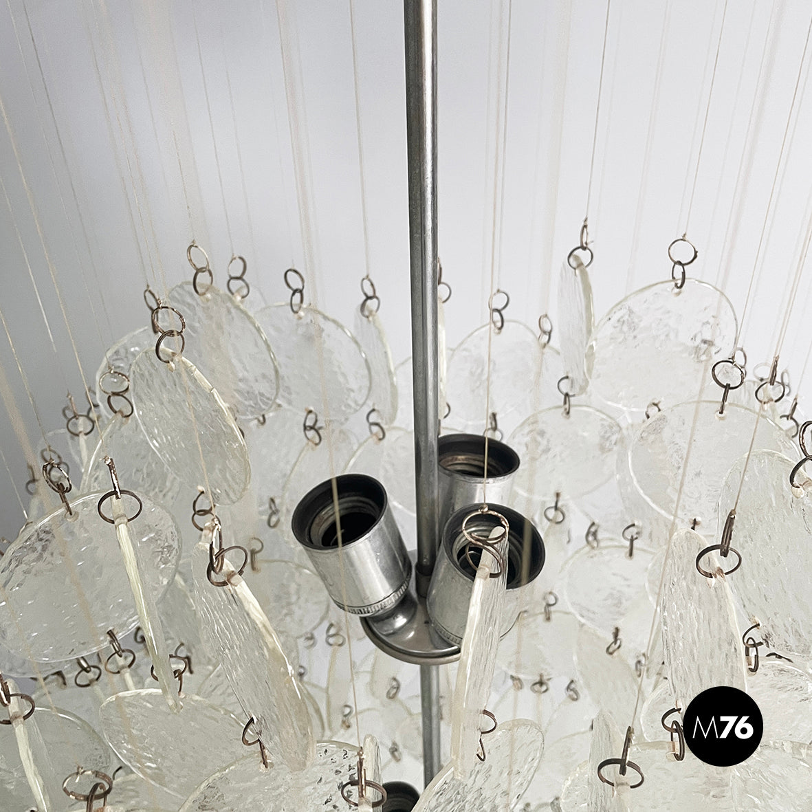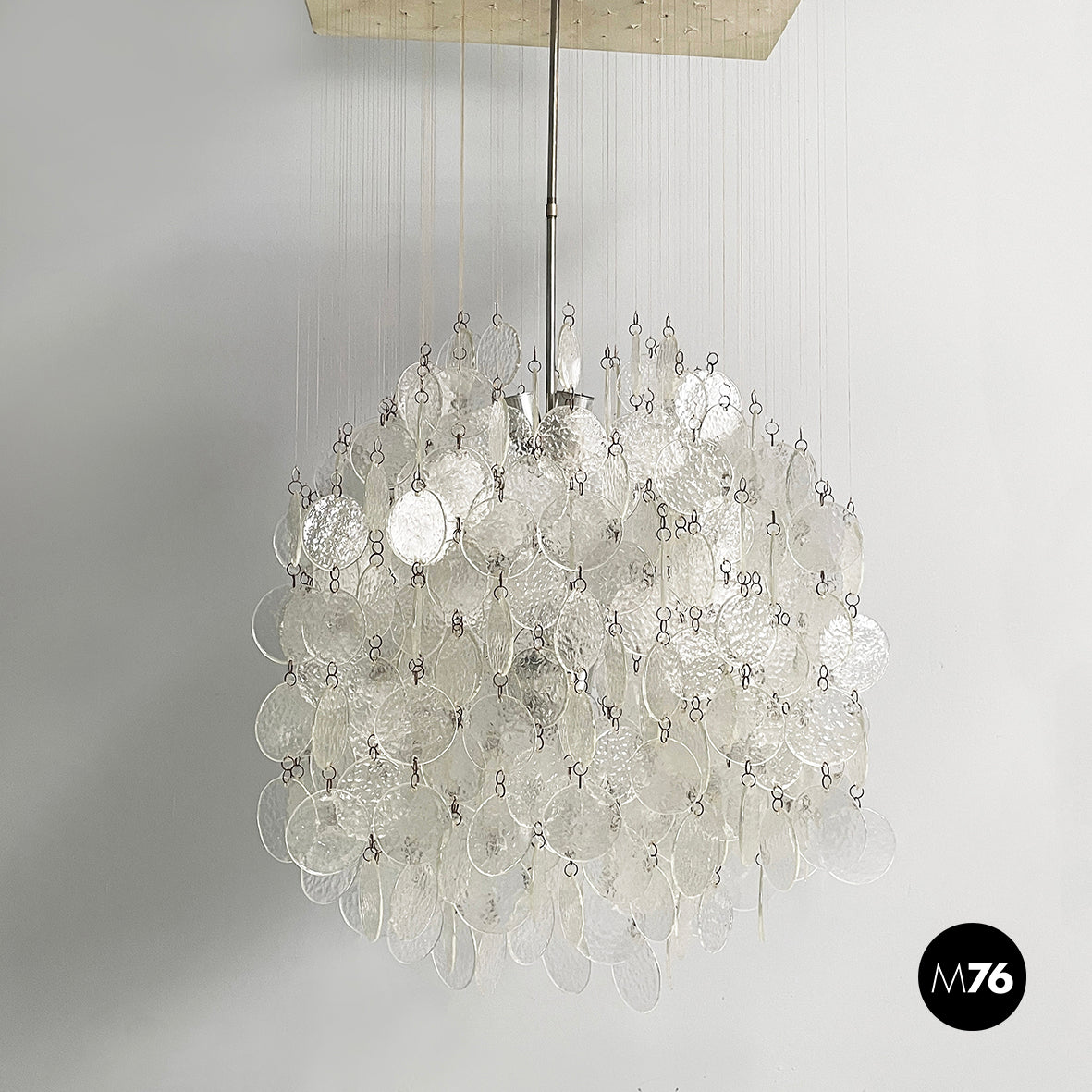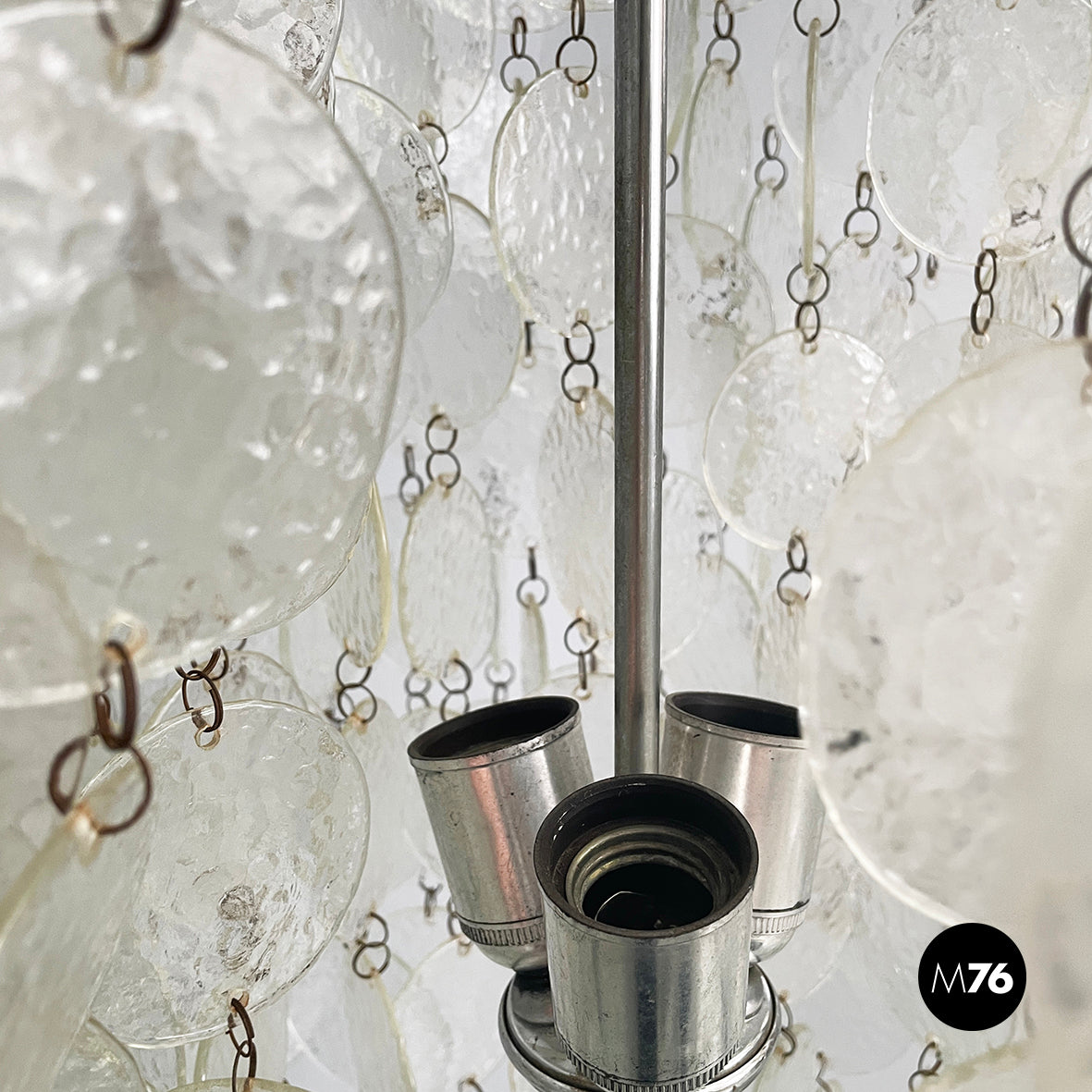 Chandelier or ceiling lamp with diffuser composed of textured Murano glass discs, joined by small metal elements and connected through transparent plastic wires to the square ceiling attachment in white painted wood. The central aluminum stem has six light bulbs.