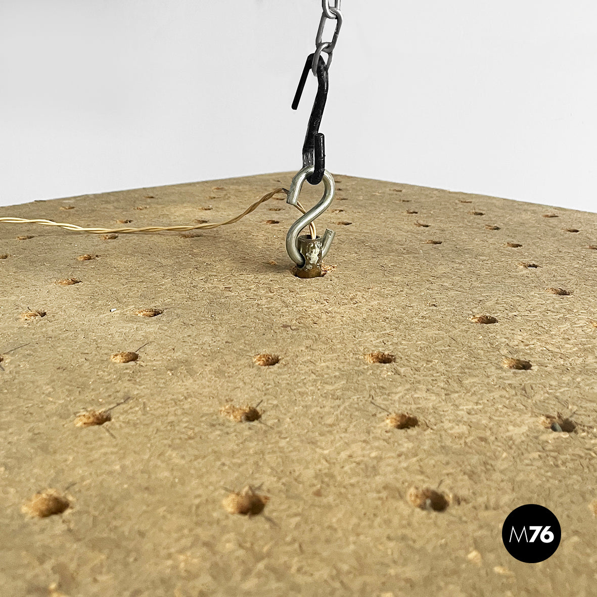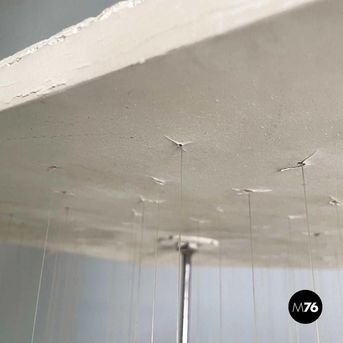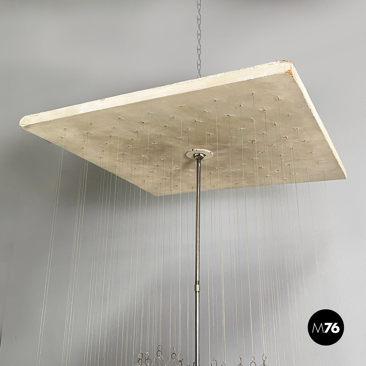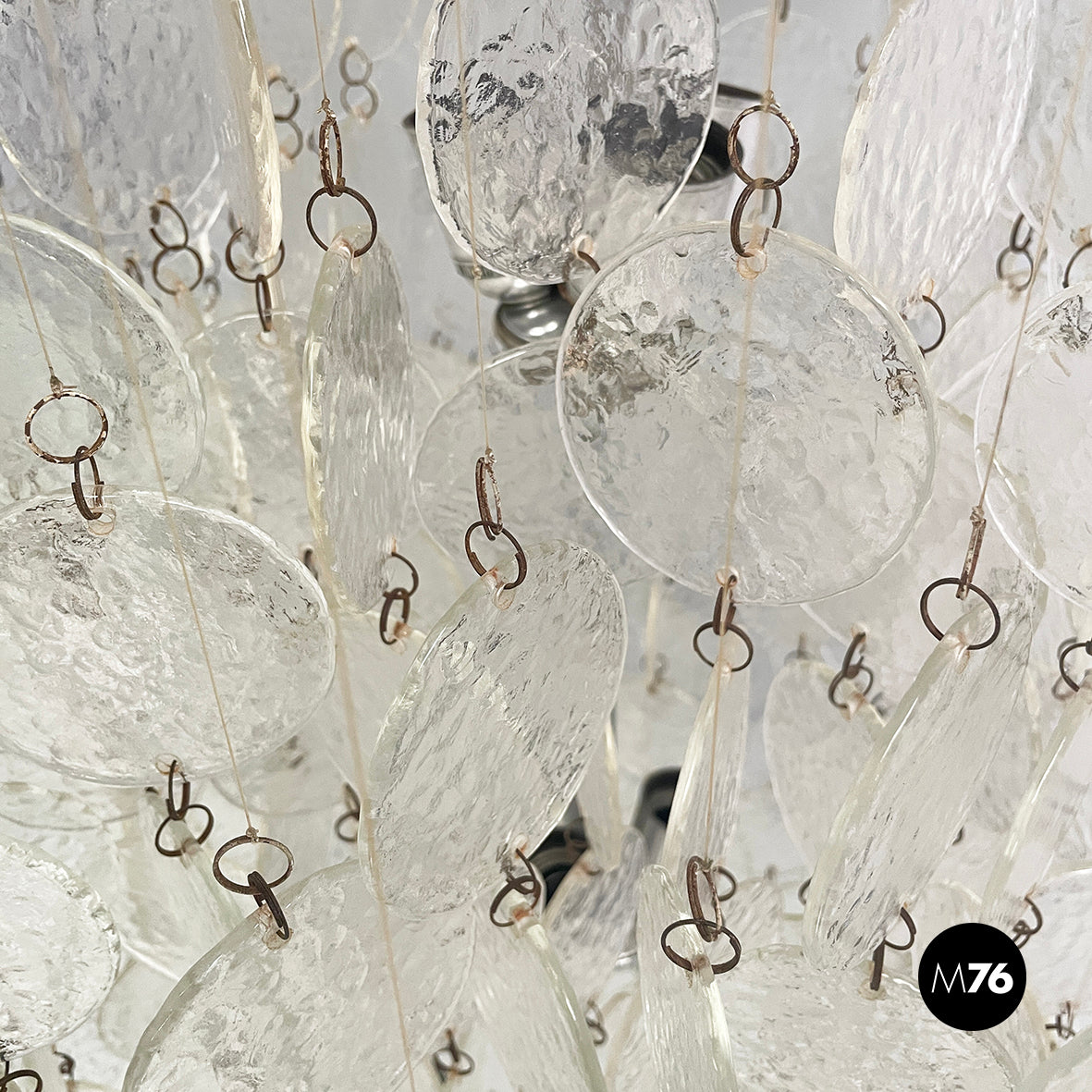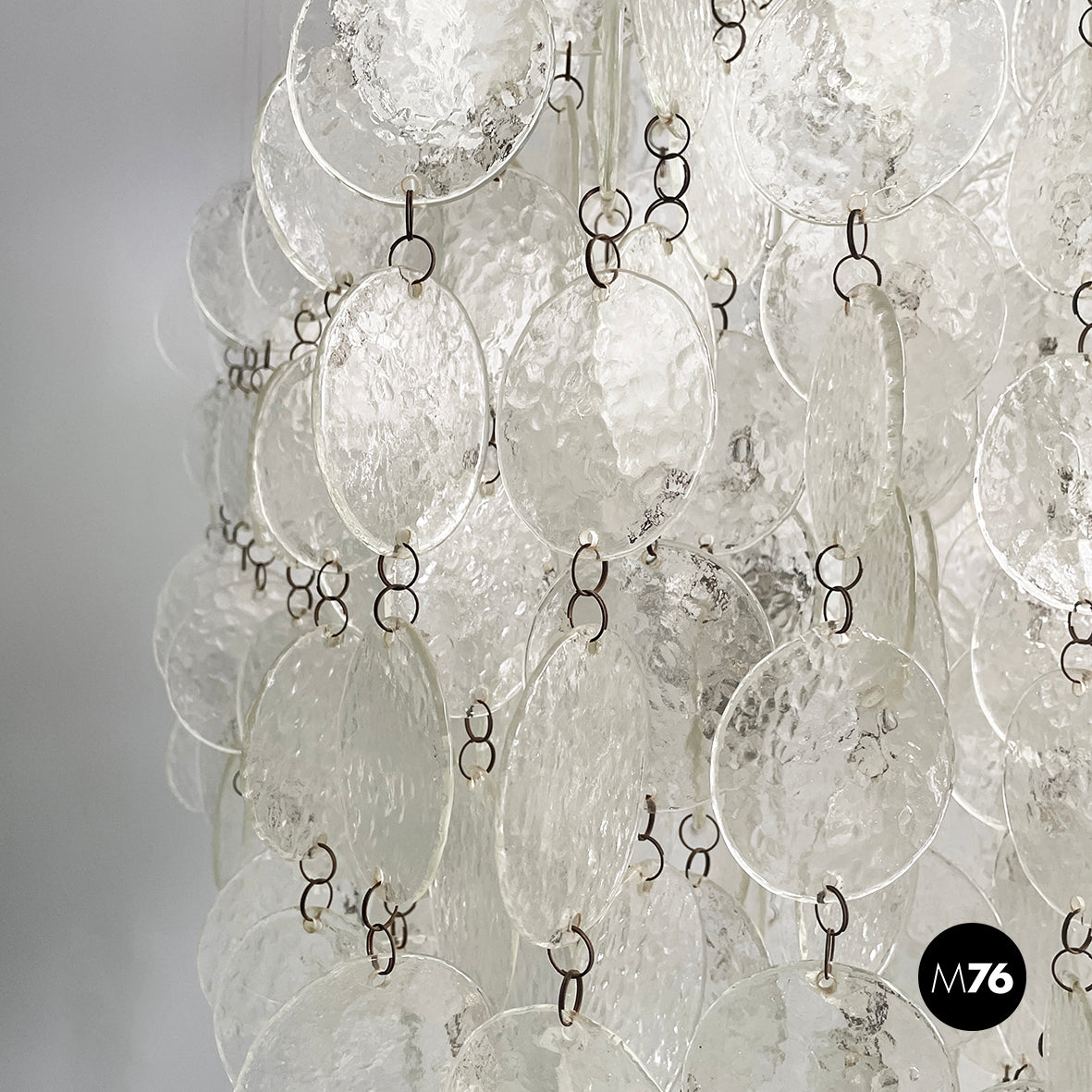 Chandelier or ceiling lamp with diffuser composed of textured Murano glass discs, joined by small metal elements and connected through transparent plastic wires to the square ceiling attachment in white painted wood. The central aluminum stem has six light bulbs.