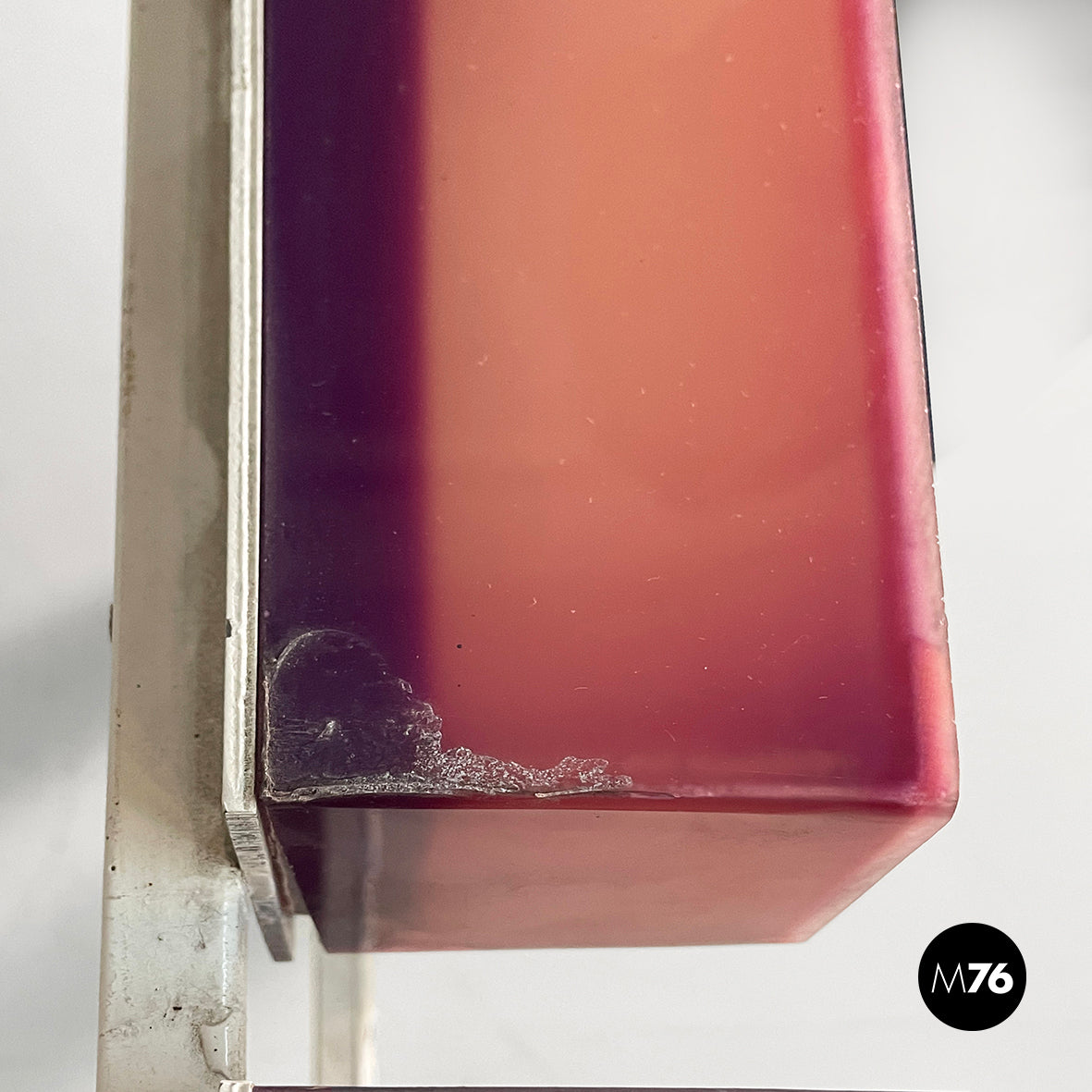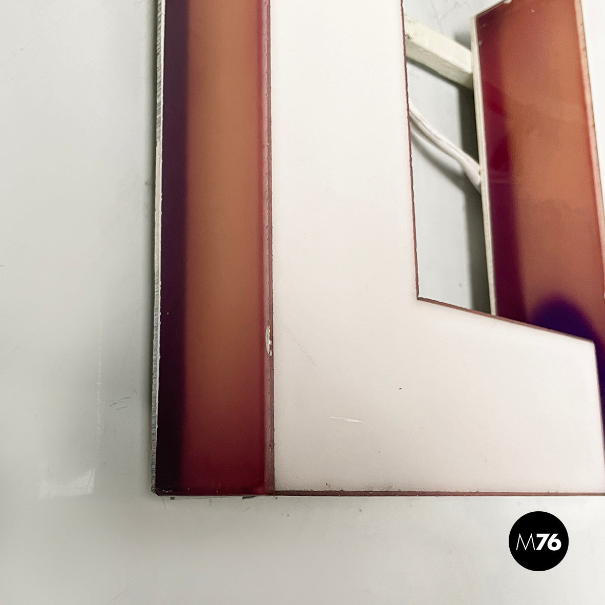 Lufthansa wall sign made of plexiglass and metal. The white plexiglass letters with blue and red-pink outlines are connected by a white painted metal structure. It can also be used on a table or floor.