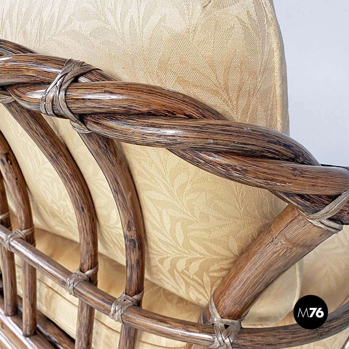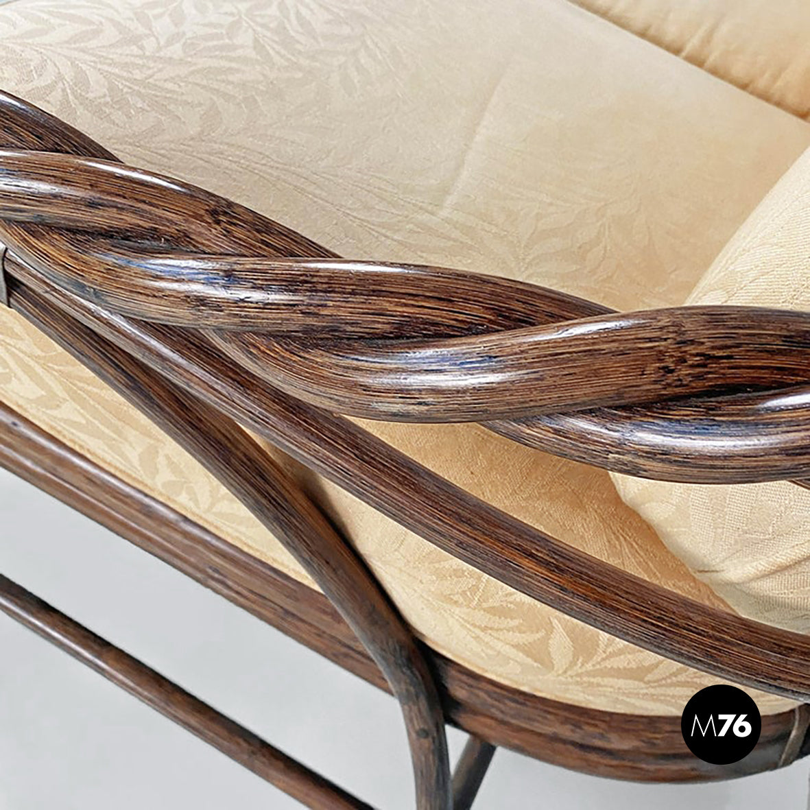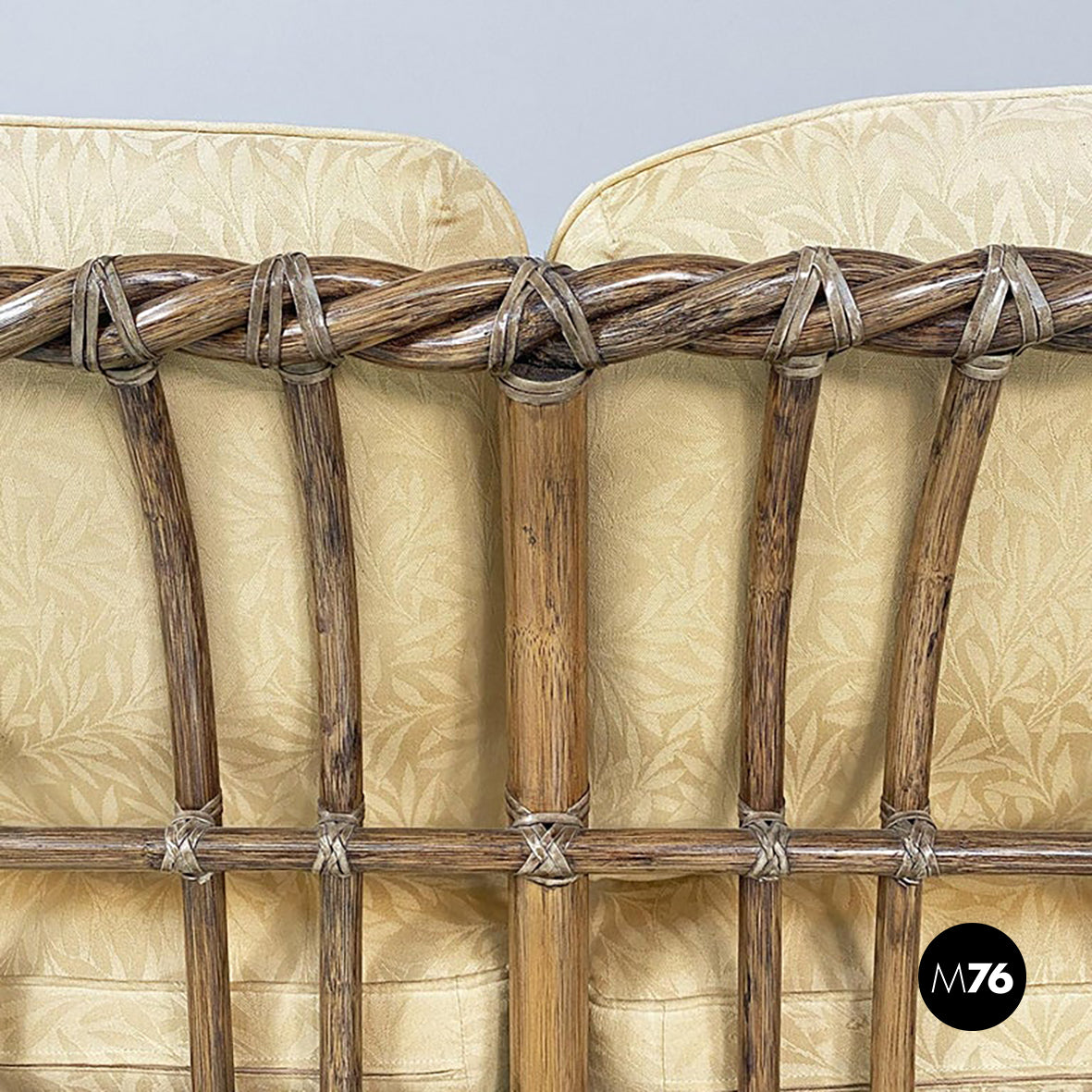 Two-seater sofa with seat and back made by cushions upholstered in beige fabric with floral motifs. The structure, armrests and legs are made of woven rattan with leather details. This couch is suitable for outdoor use, both in the garden and on the porch.