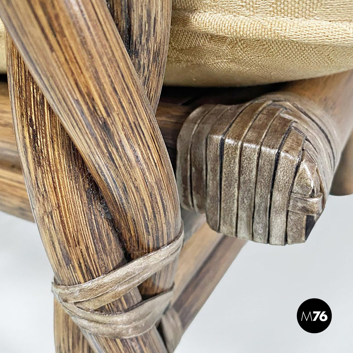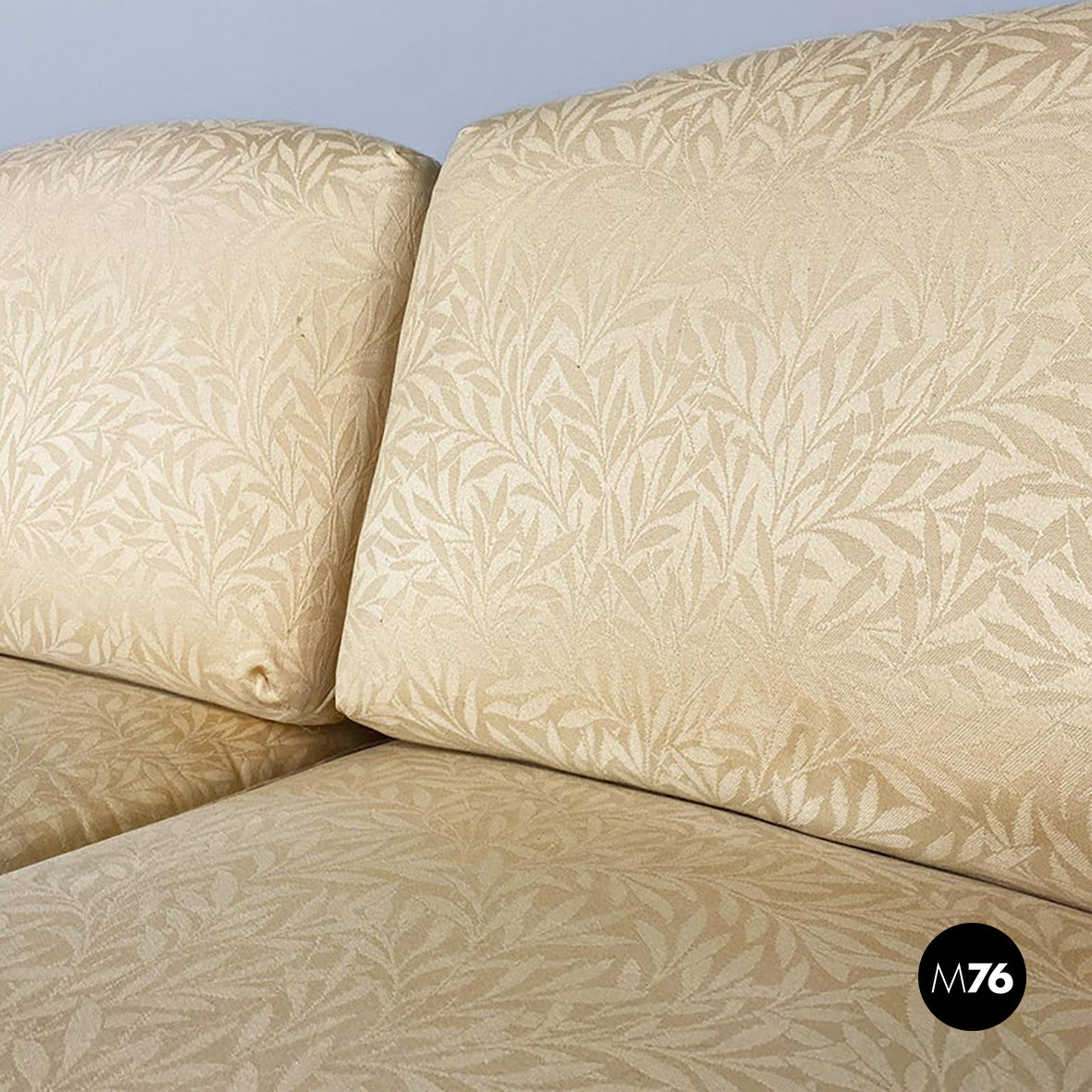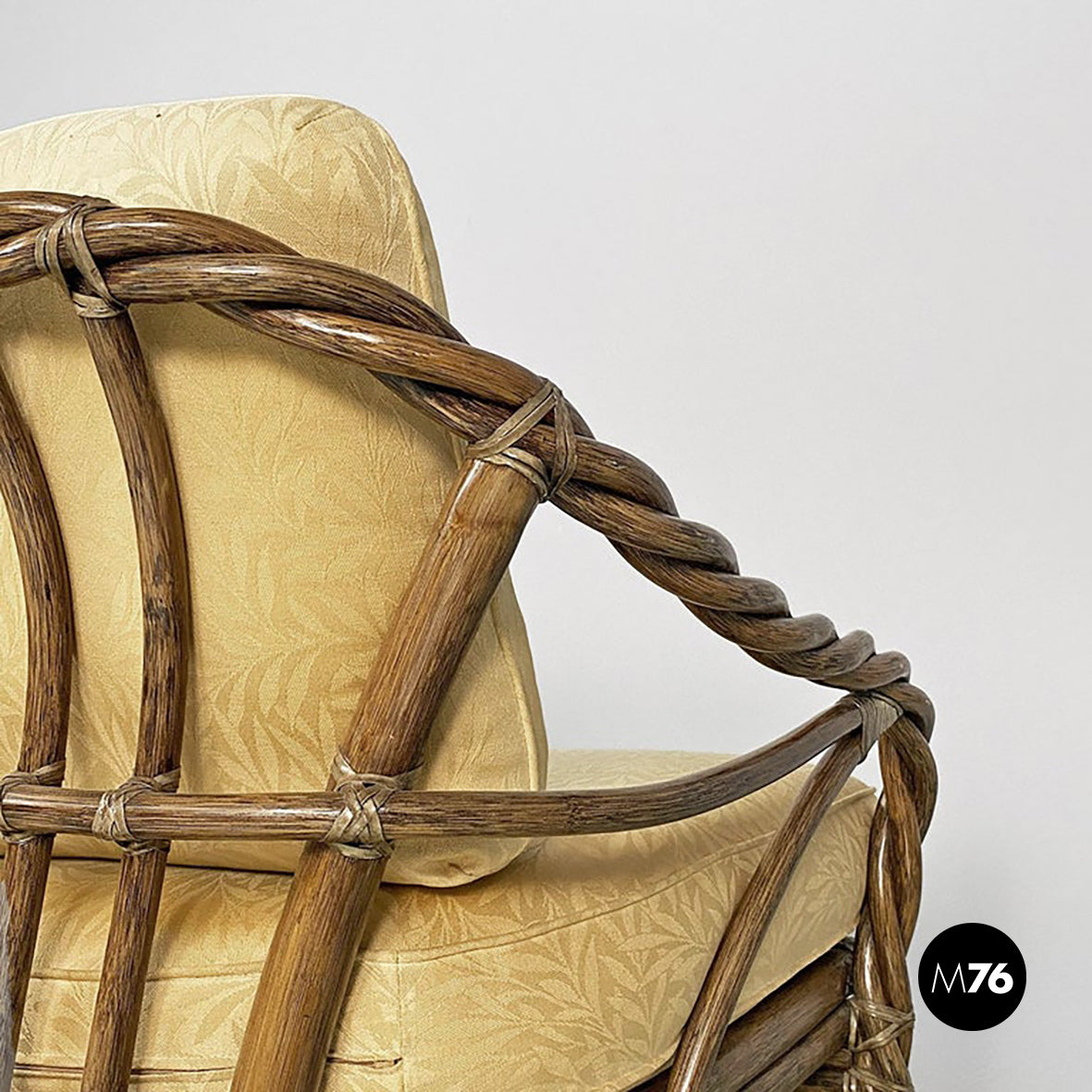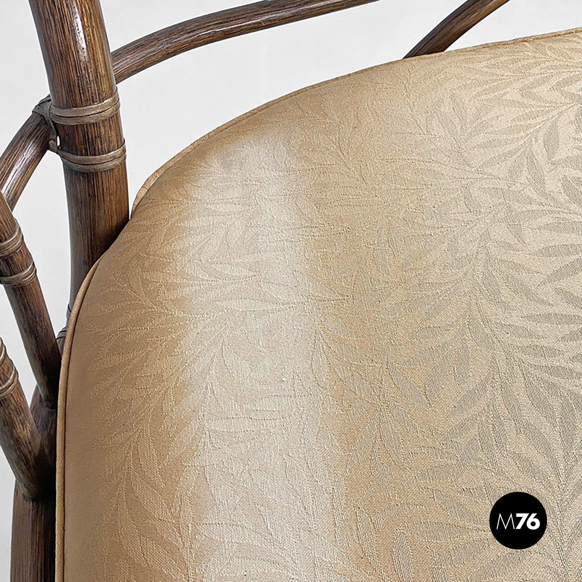 Two-seater sofa with seat and back made by cushions upholstered in beige fabric with floral motifs. The structure, armrests and legs are made of woven rattan with leather details. This couch is suitable for outdoor use, both in the garden and on the porch.