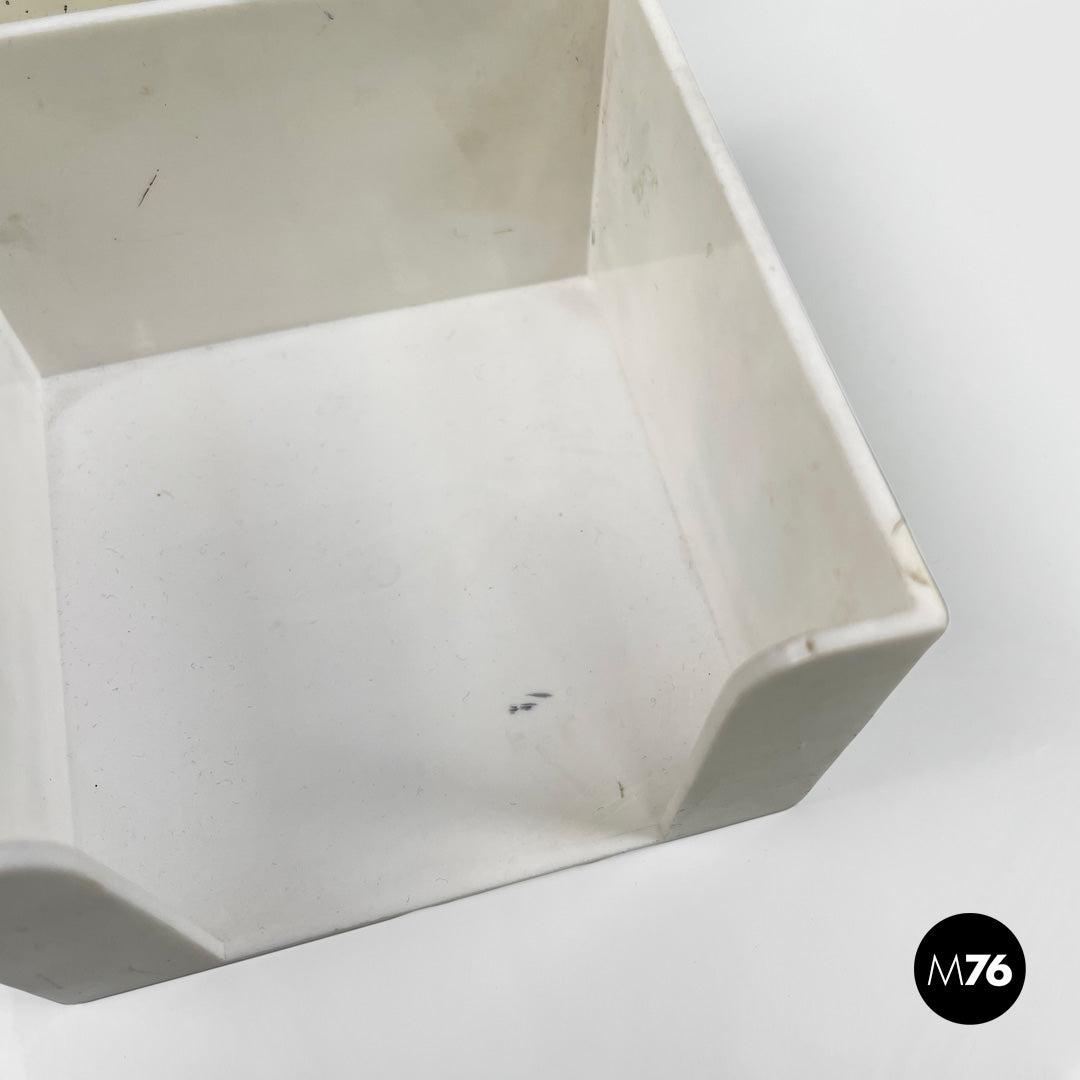 White plastic storage box. It has three compartments, two of equal size and one larger. The logo is printed on two sides.
