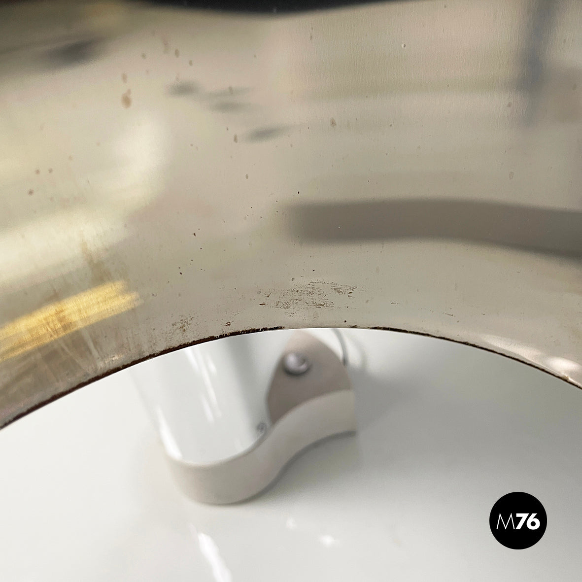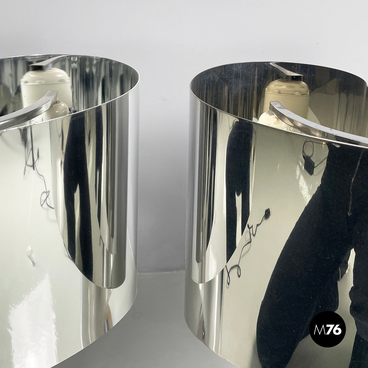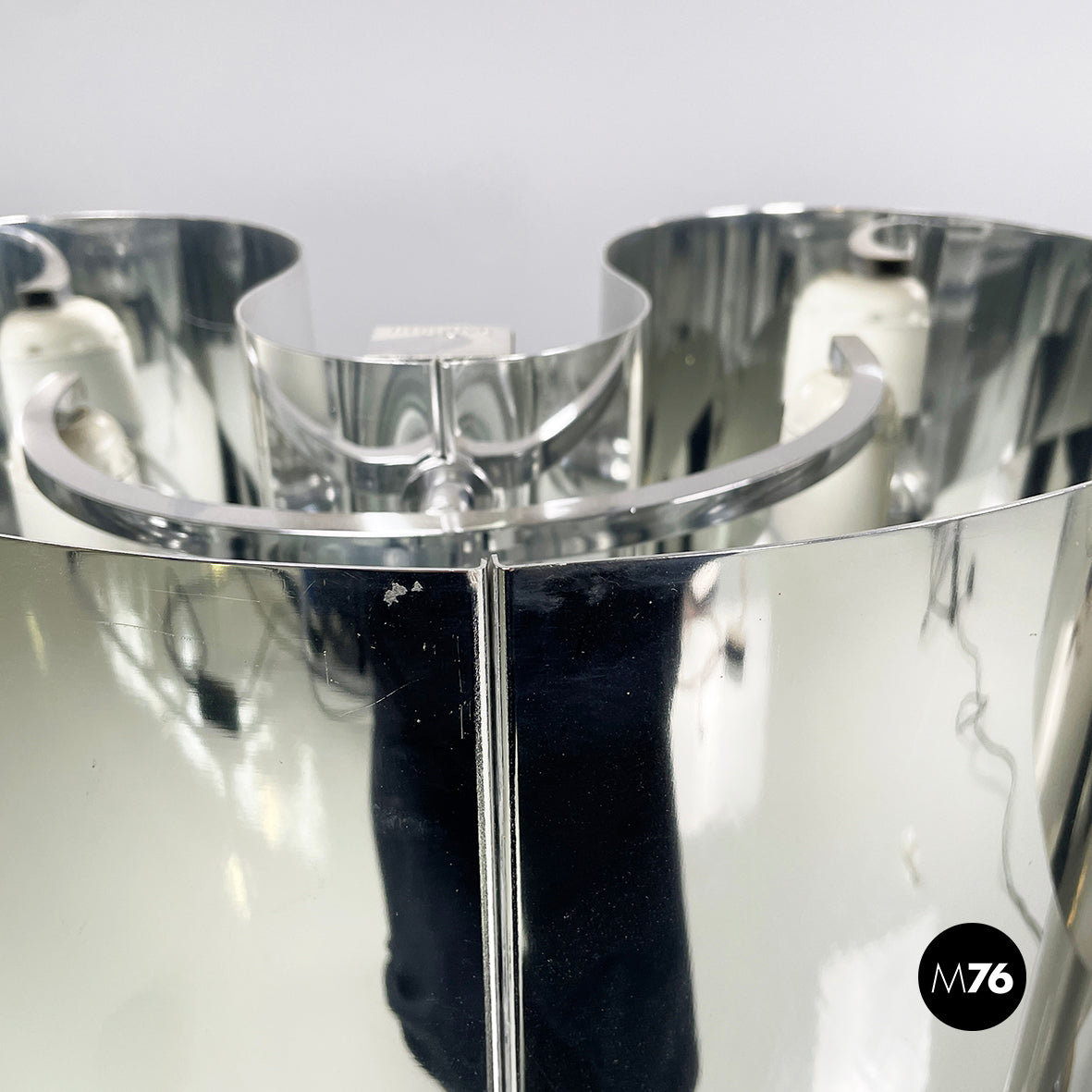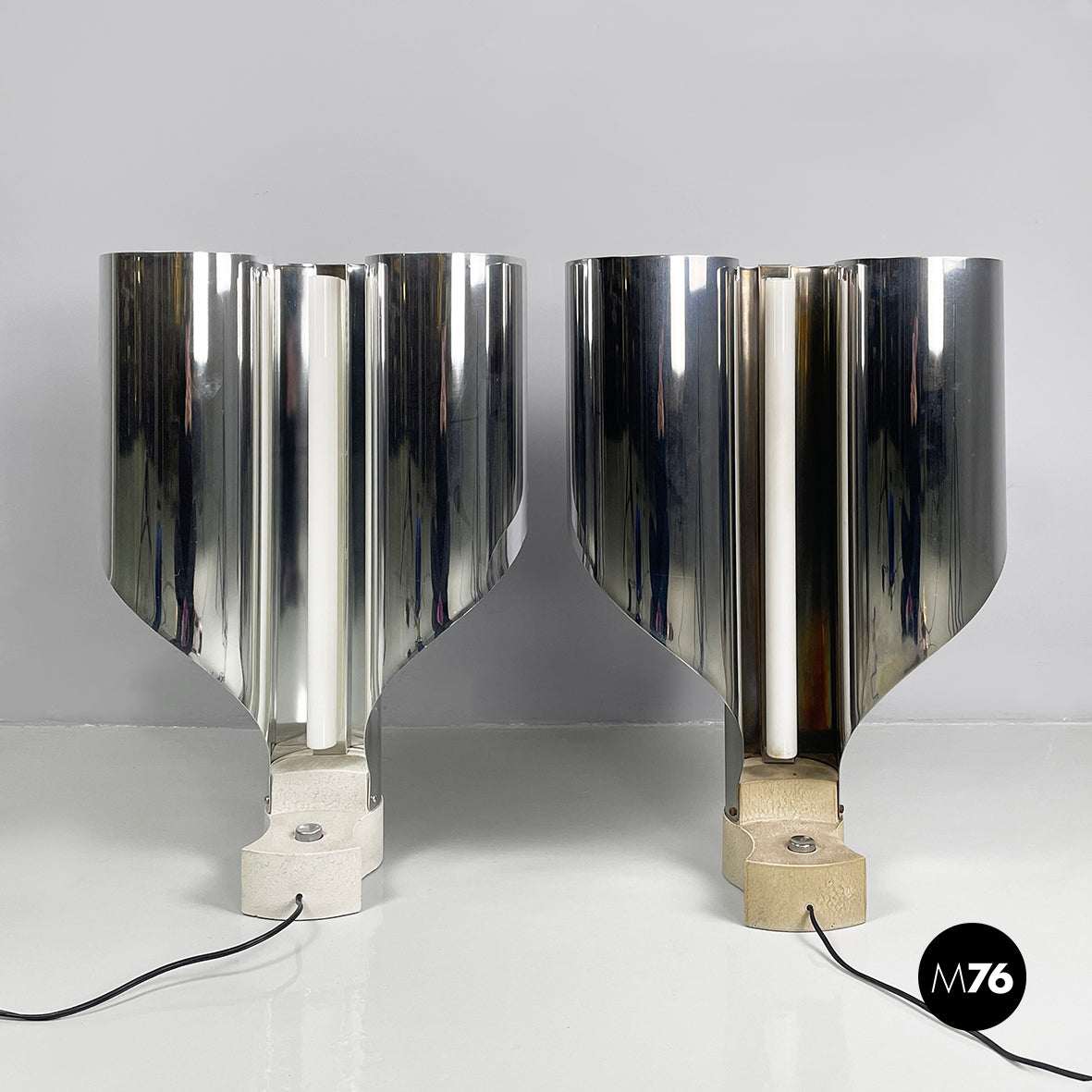 Good condition, scattered signs of age on the aluminum. One base is darker. In patina. In one lamp the neon light has been replaced with a LED light.