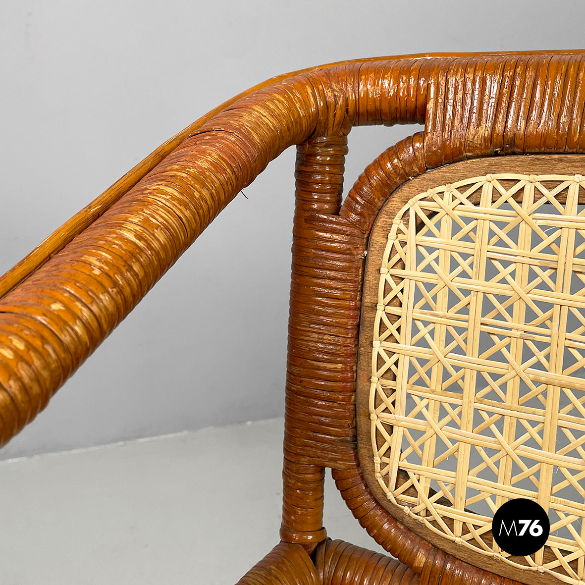 Two-seater bench entirely in woven rattan. The backrest is in rattan with light straw weaves with a star pattern. Curved armrests. The seat has the same pattern and color as the details of the backrest. The legs are in brown rattan with metal feet. This seat is perfect for an outdoor space, a garden or terrace.
