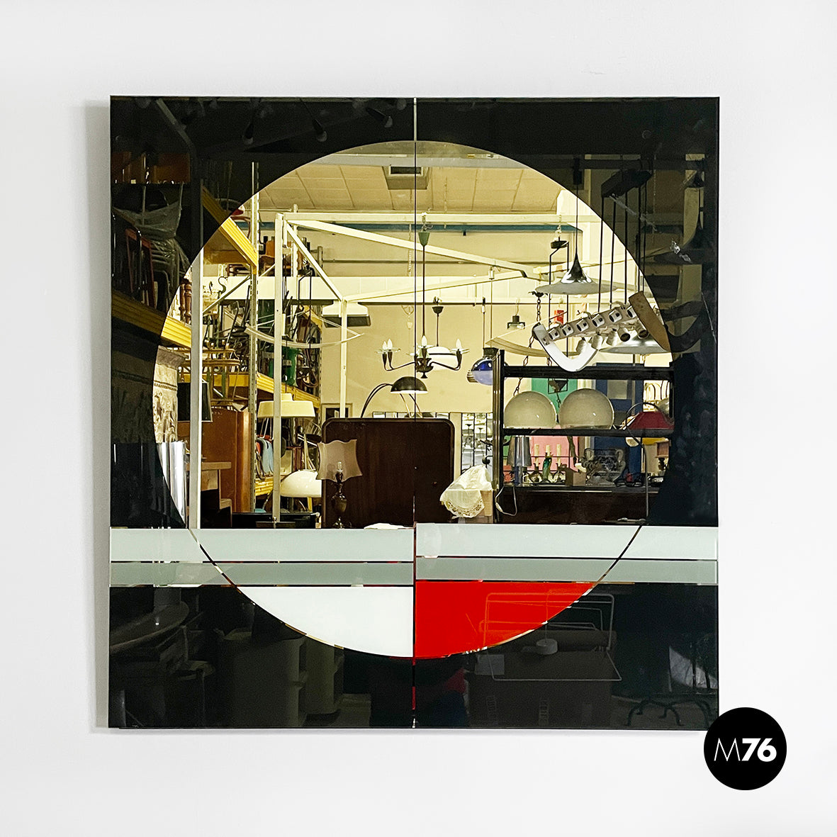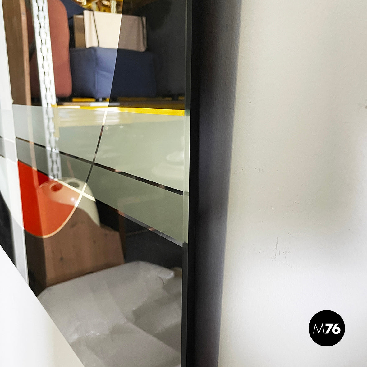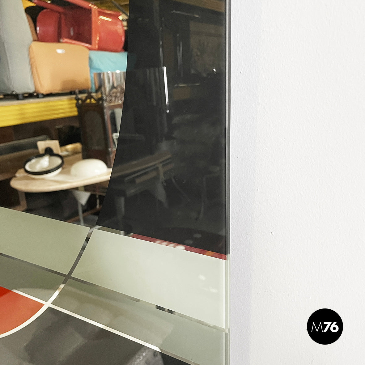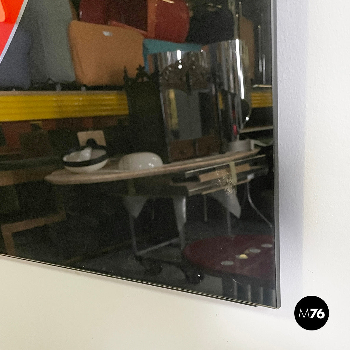 Wall mirror from Morphos series, rectangular in shape. On the profile there are geometric decorations in black, red and gray.