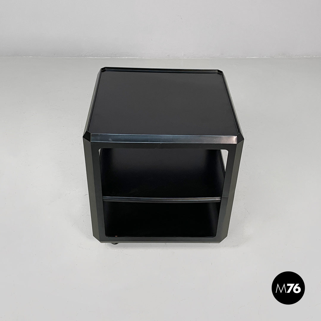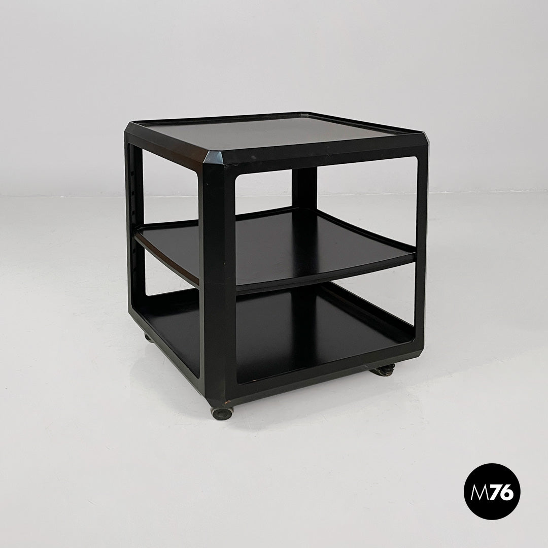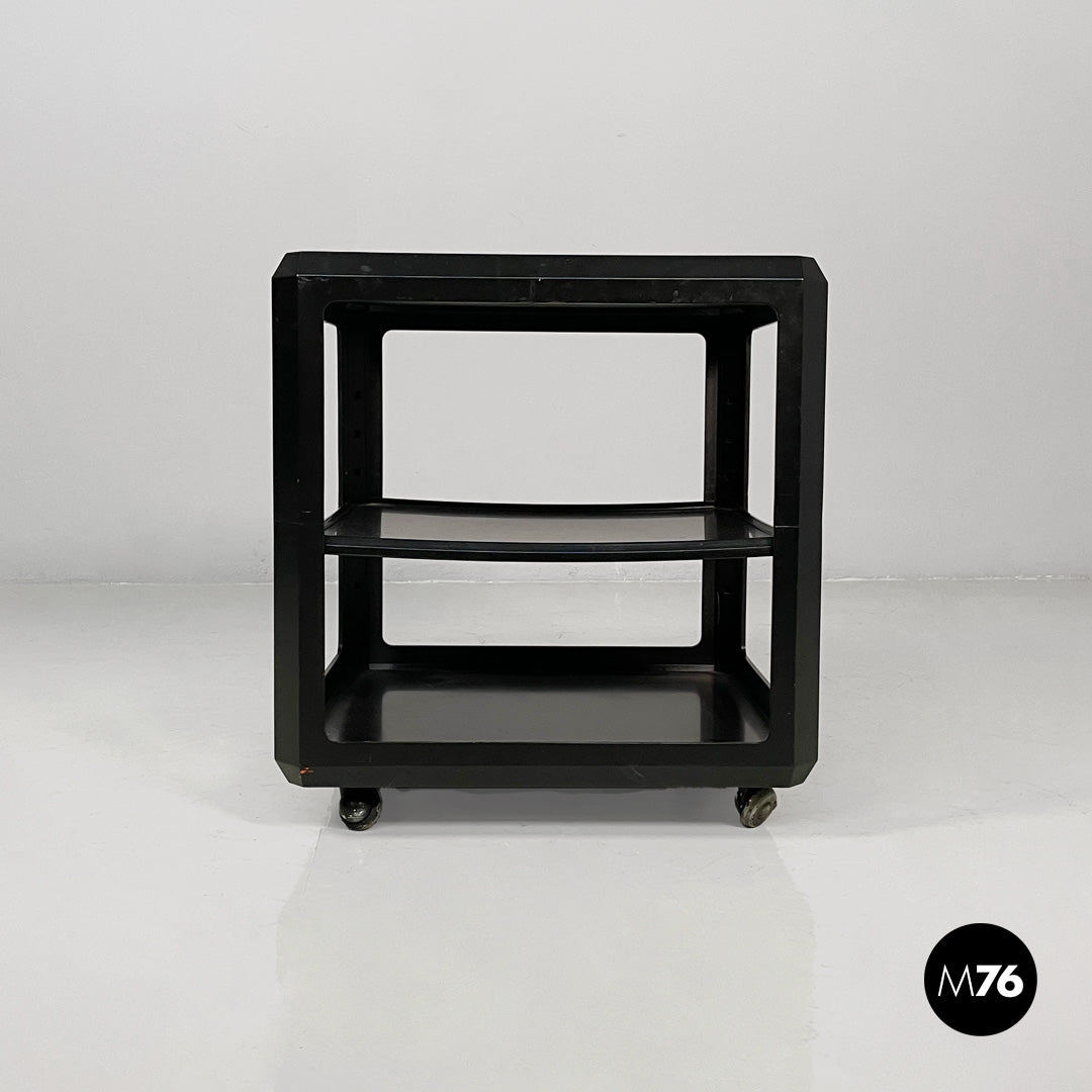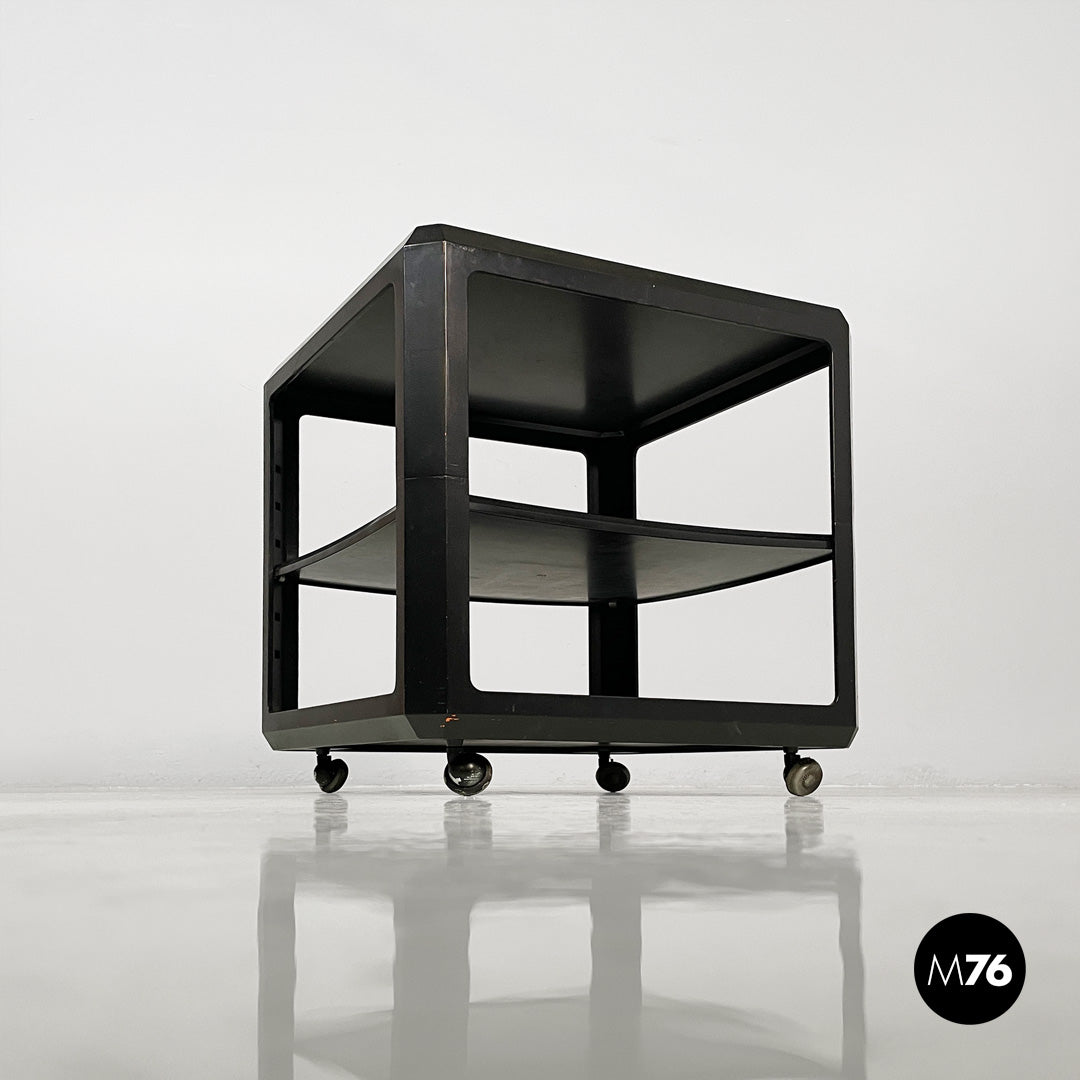 Wooden cart or coffee table with wheels. The frame is made of matte black wood. It features a top shelf with slightly raised edges. The middle and bottom shelves are framed by a square frame. A small metal tab allows you to adjust the position of the middle shelf.