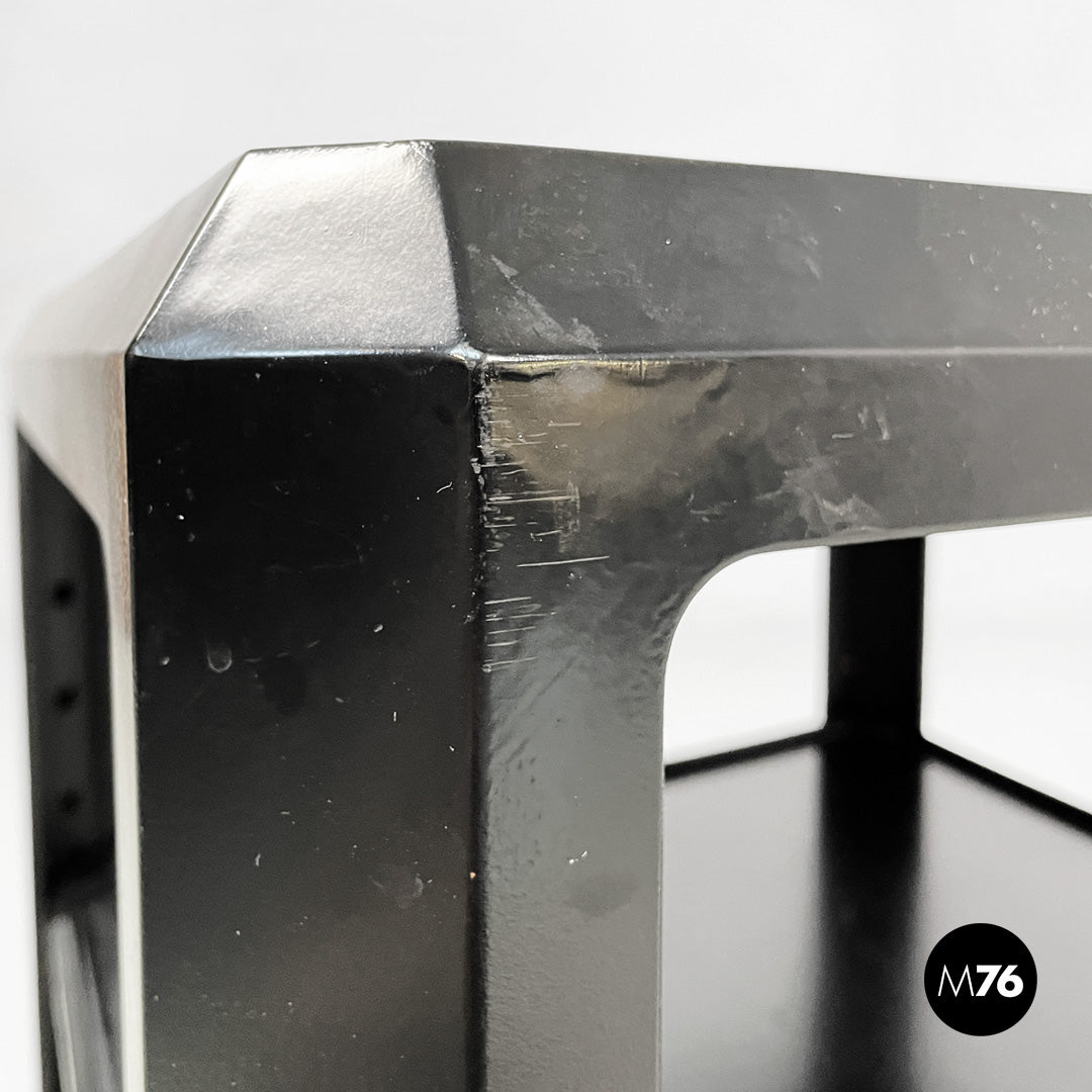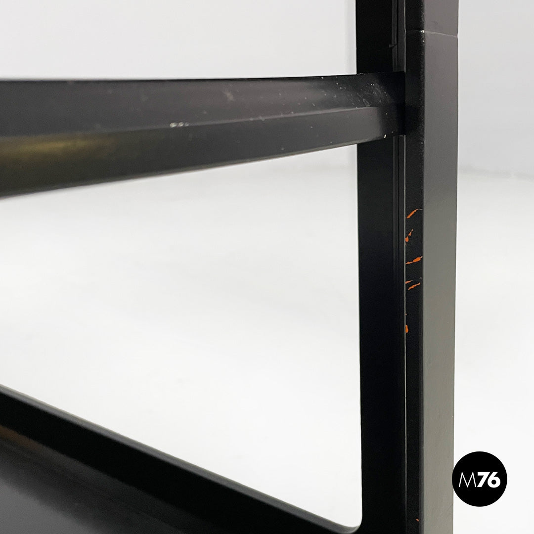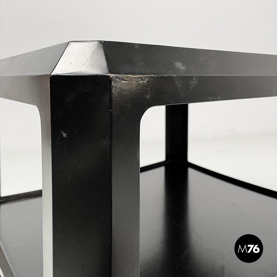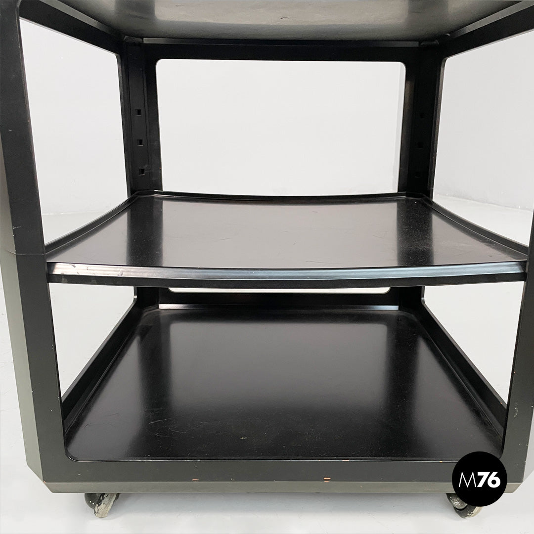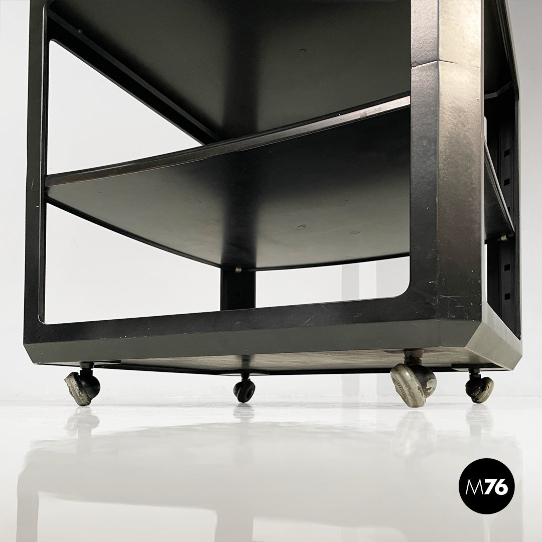 Wooden cart or coffee table with wheels. The frame is made of matte black wood. It features a top shelf with slightly raised edges. The middle and bottom shelves are framed by a square frame. A small metal tab allows you to adjust the position of the middle shelf.