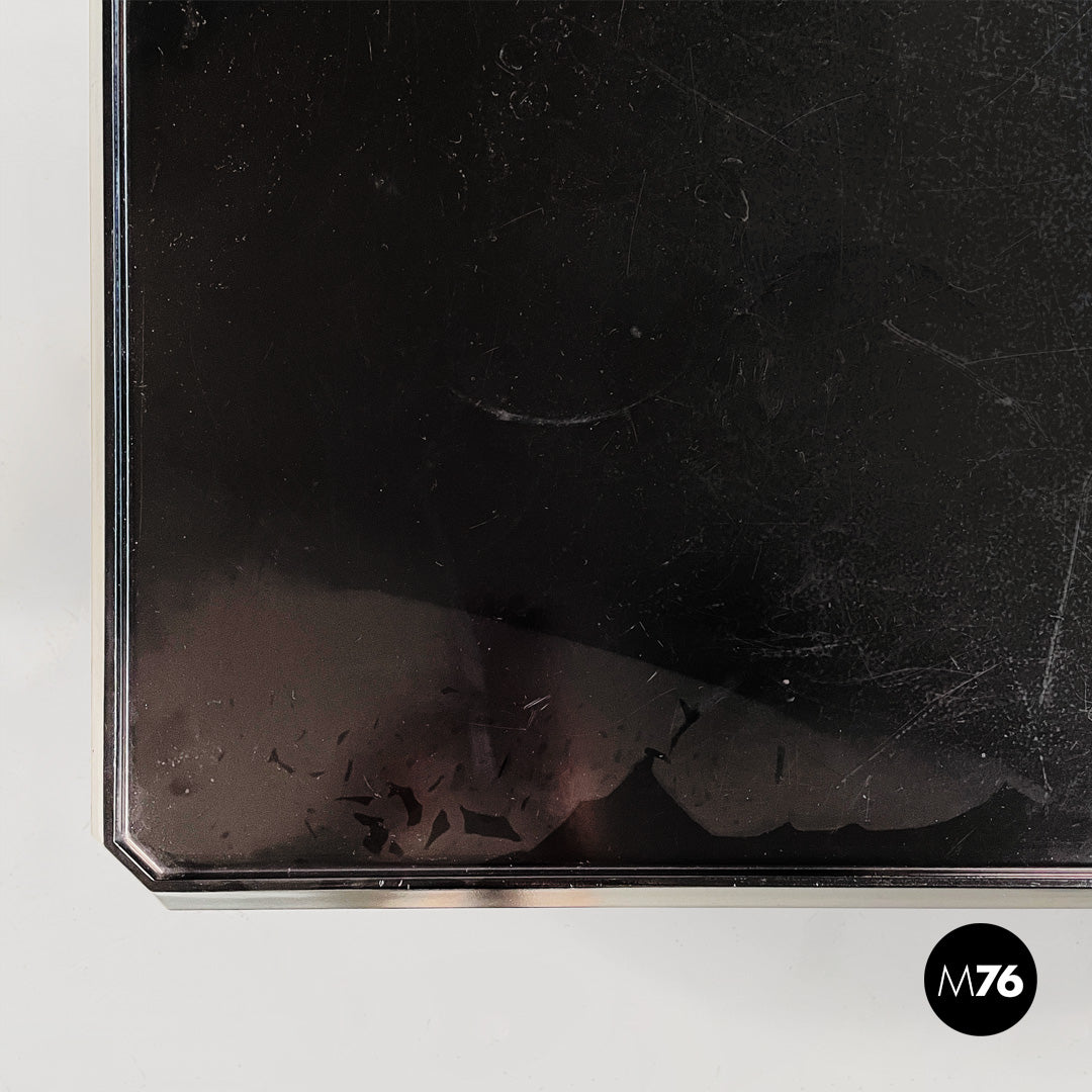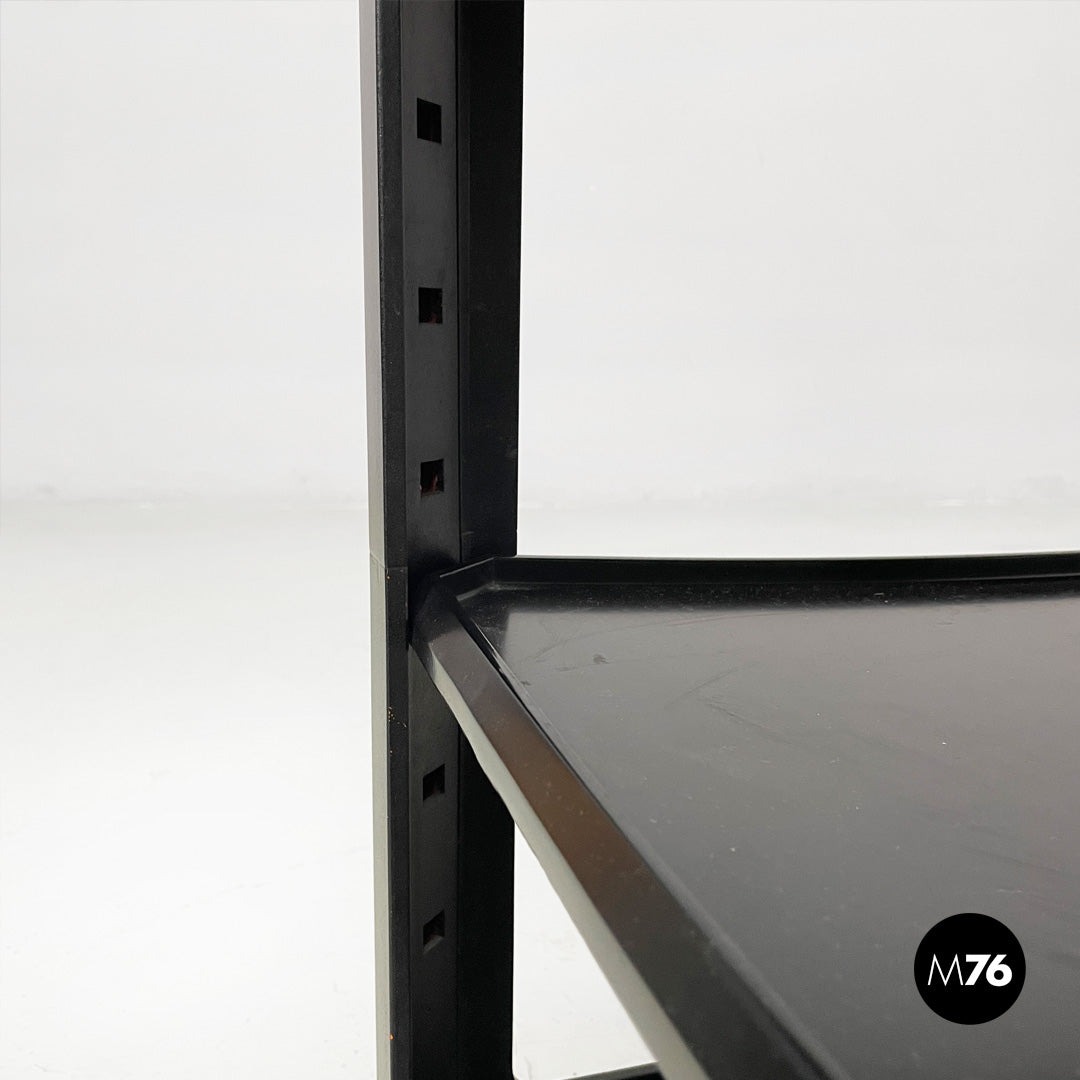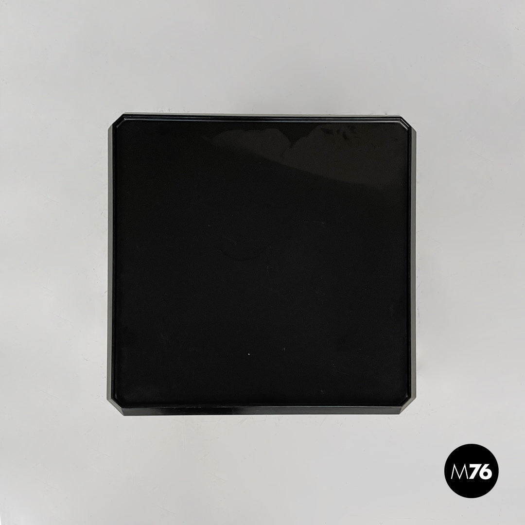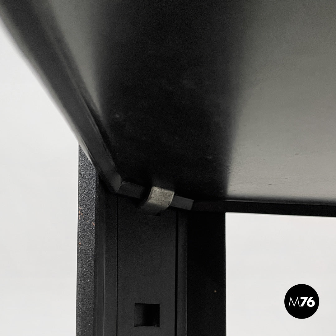 Wooden cart or coffee table with wheels. The frame is made of matte black wood. It features a top shelf with slightly raised edges. The middle and bottom shelves are framed by a square frame. A small metal tab allows you to adjust the position of the middle shelf.