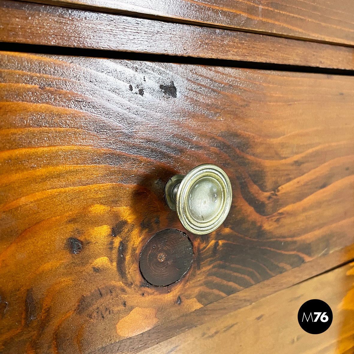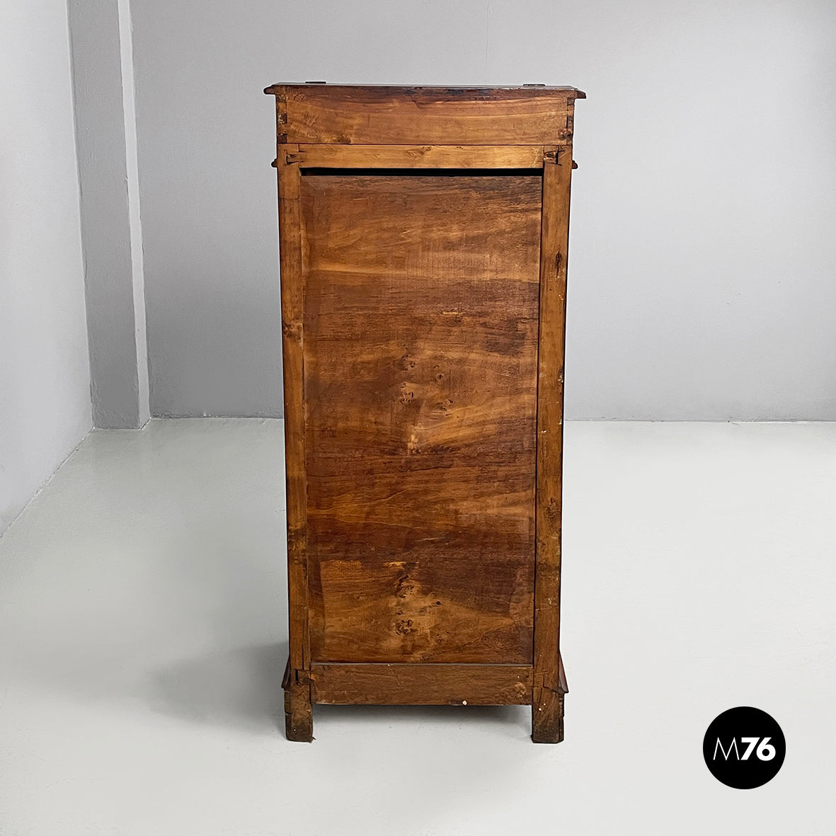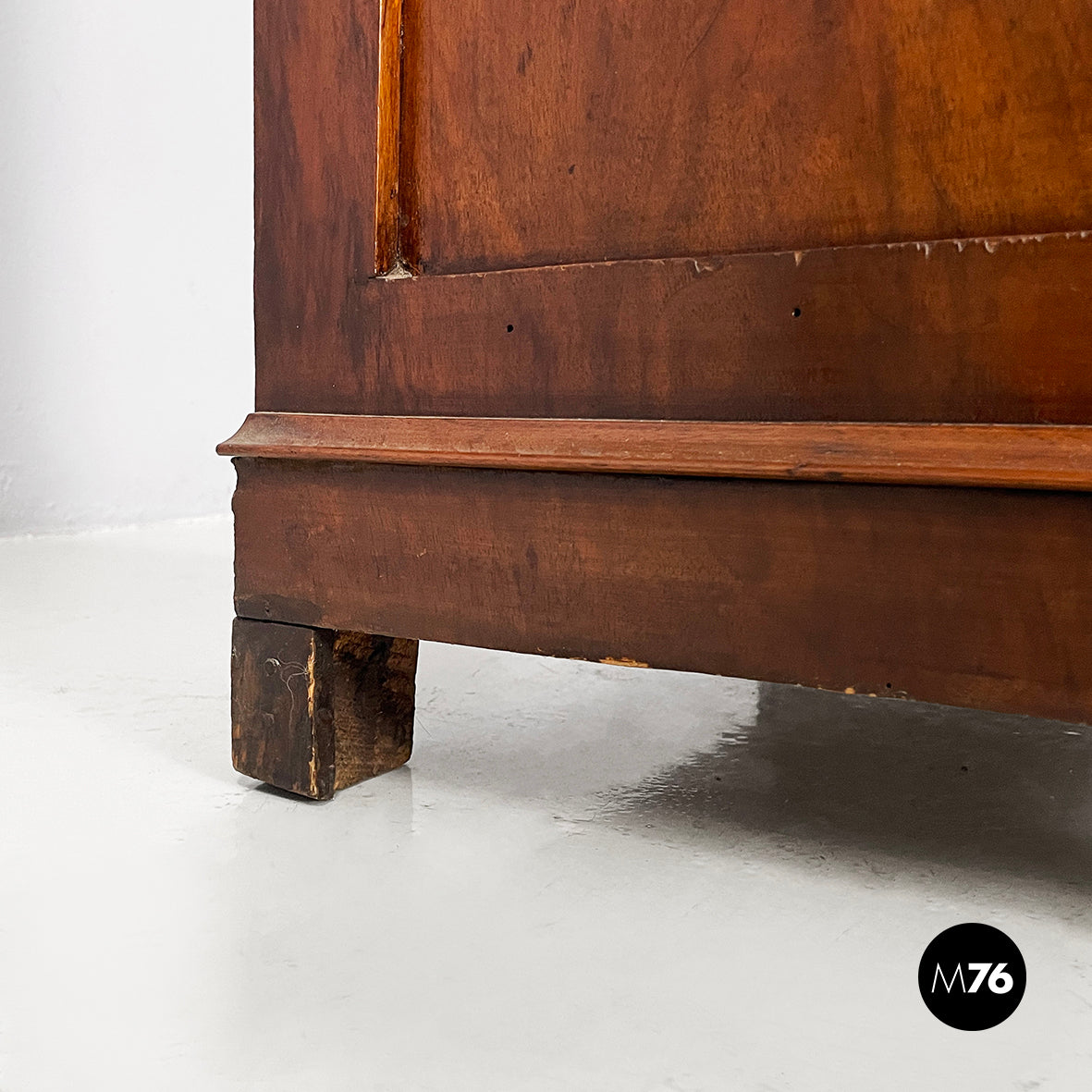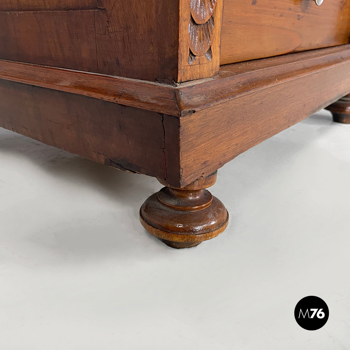 Square-based chest of drawers with a lectern, entirely made of wood. The lectern has a hidden compartment with a flap opening. The seven front drawers have a finely crafted side closure and round metal handles. Round crafted front feet and squared rear feet. Unfinished back. It can be used as an archive.
