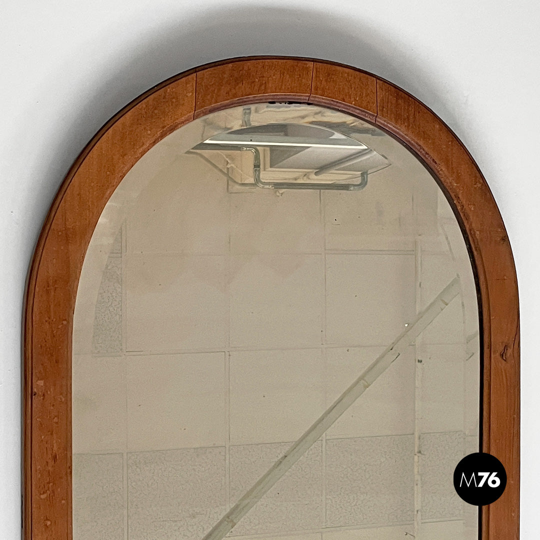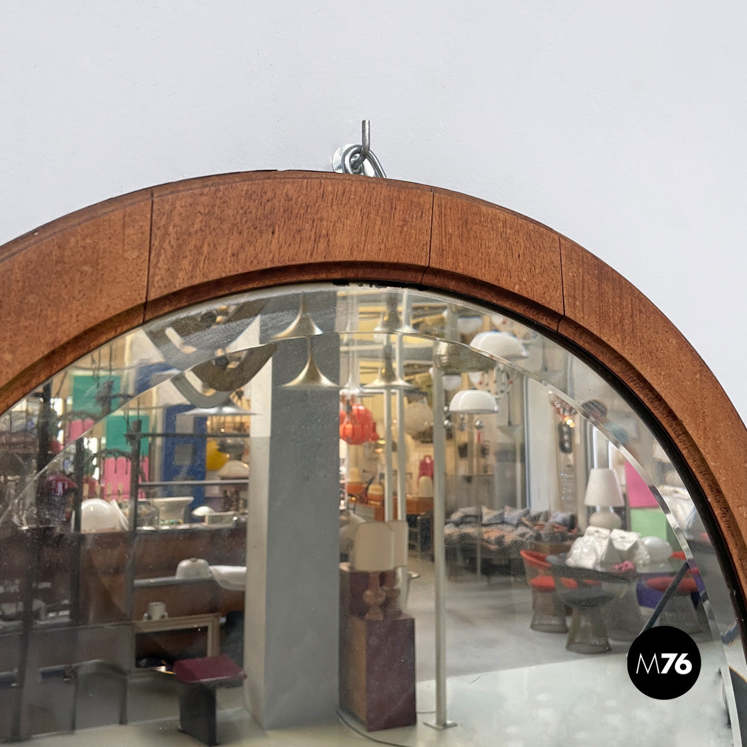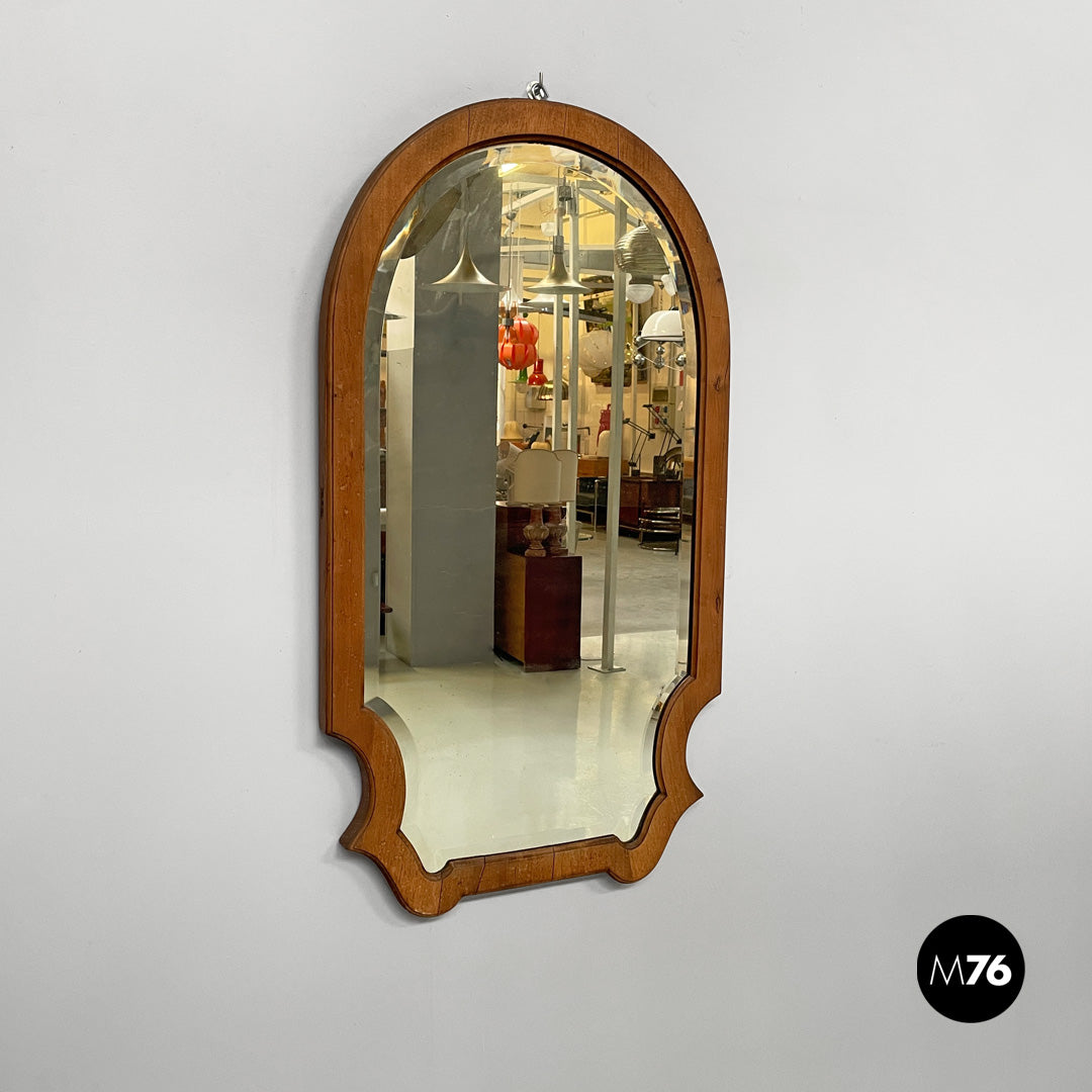 Arched shaped wall mirror with wooden frame. There is a decorative embossment on the circumference of the glass. There is a ring on the top to hang it.