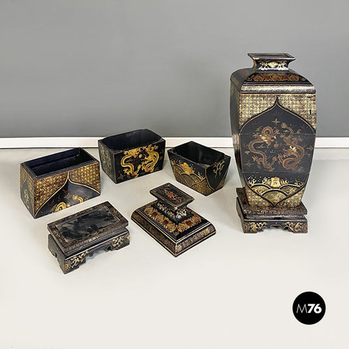 Oriental black wood vases or sculptures with decorations, 1950s
