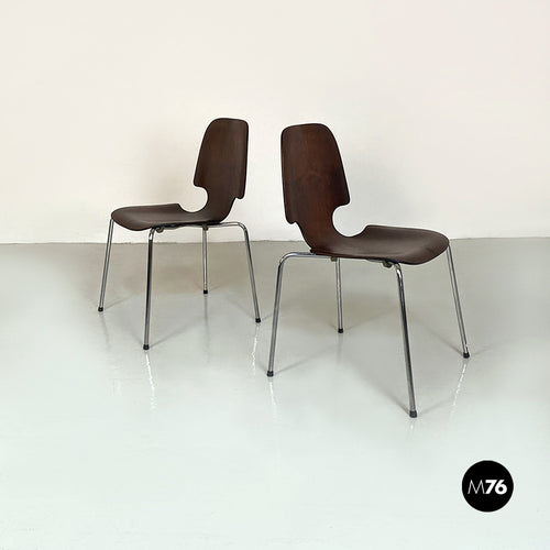 Wood single shell and chromed steel rods legs chairs, 1960s