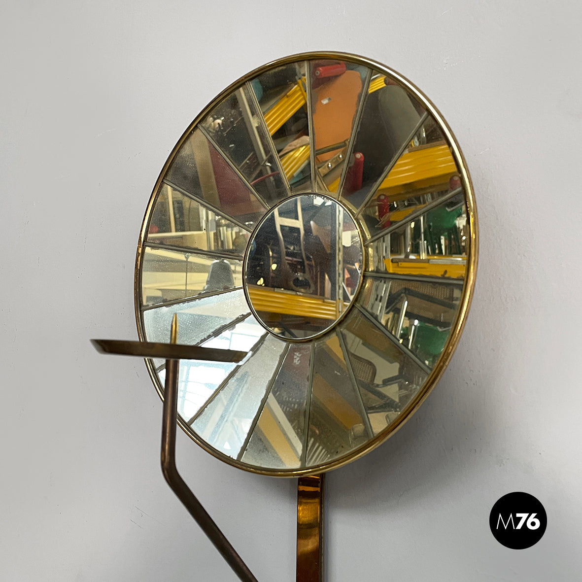 Wall candle holder with a round mirrored diffuser. The round candle holder is made of brass. The square brass structure features a mechanism for adjusting the height of the holder, ensuring the flame is always centered in the diffuser.
