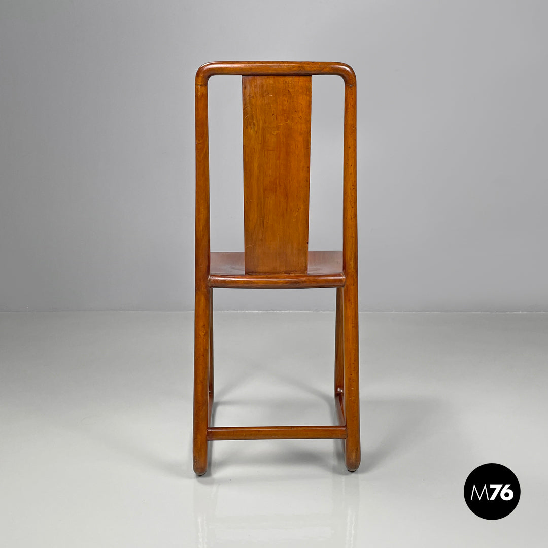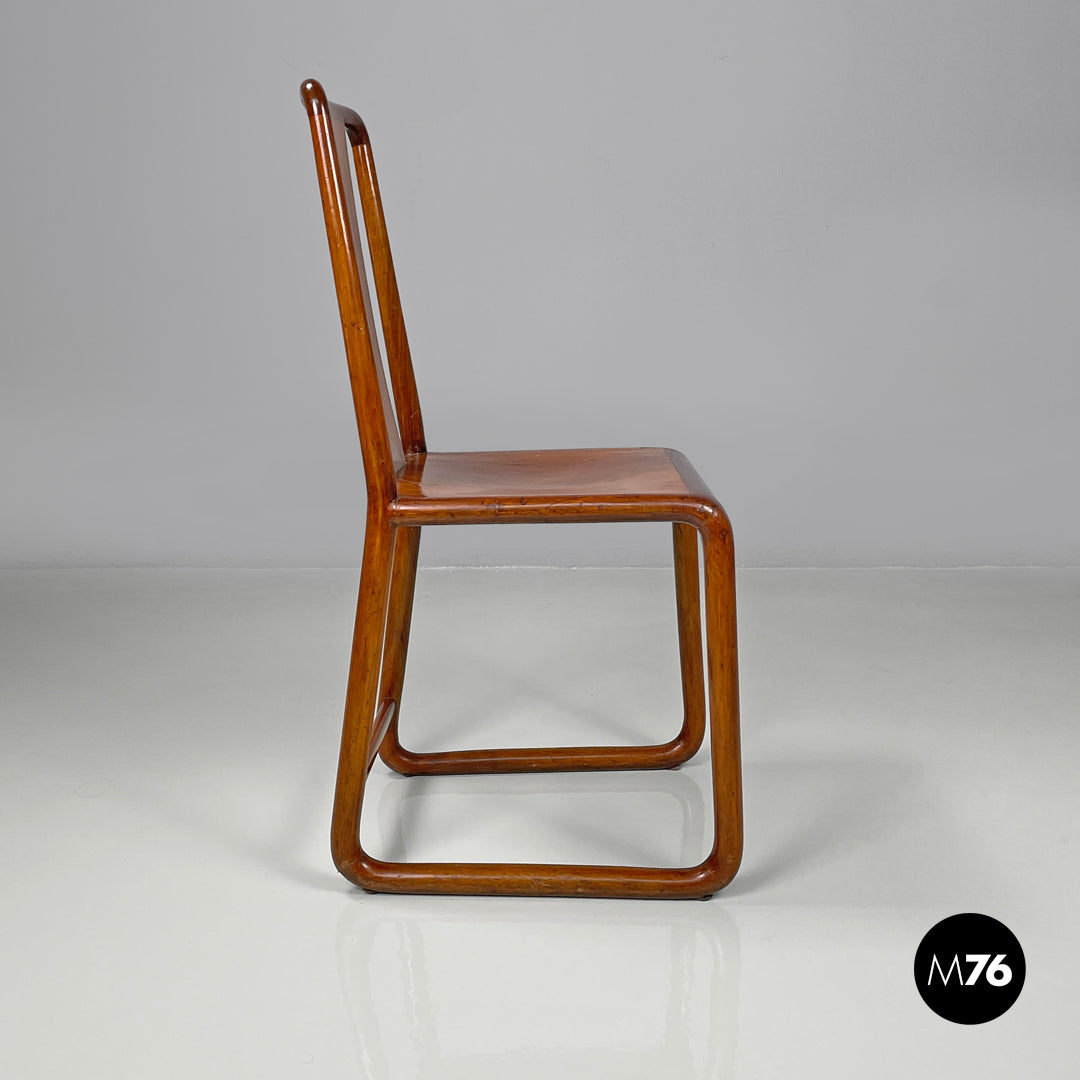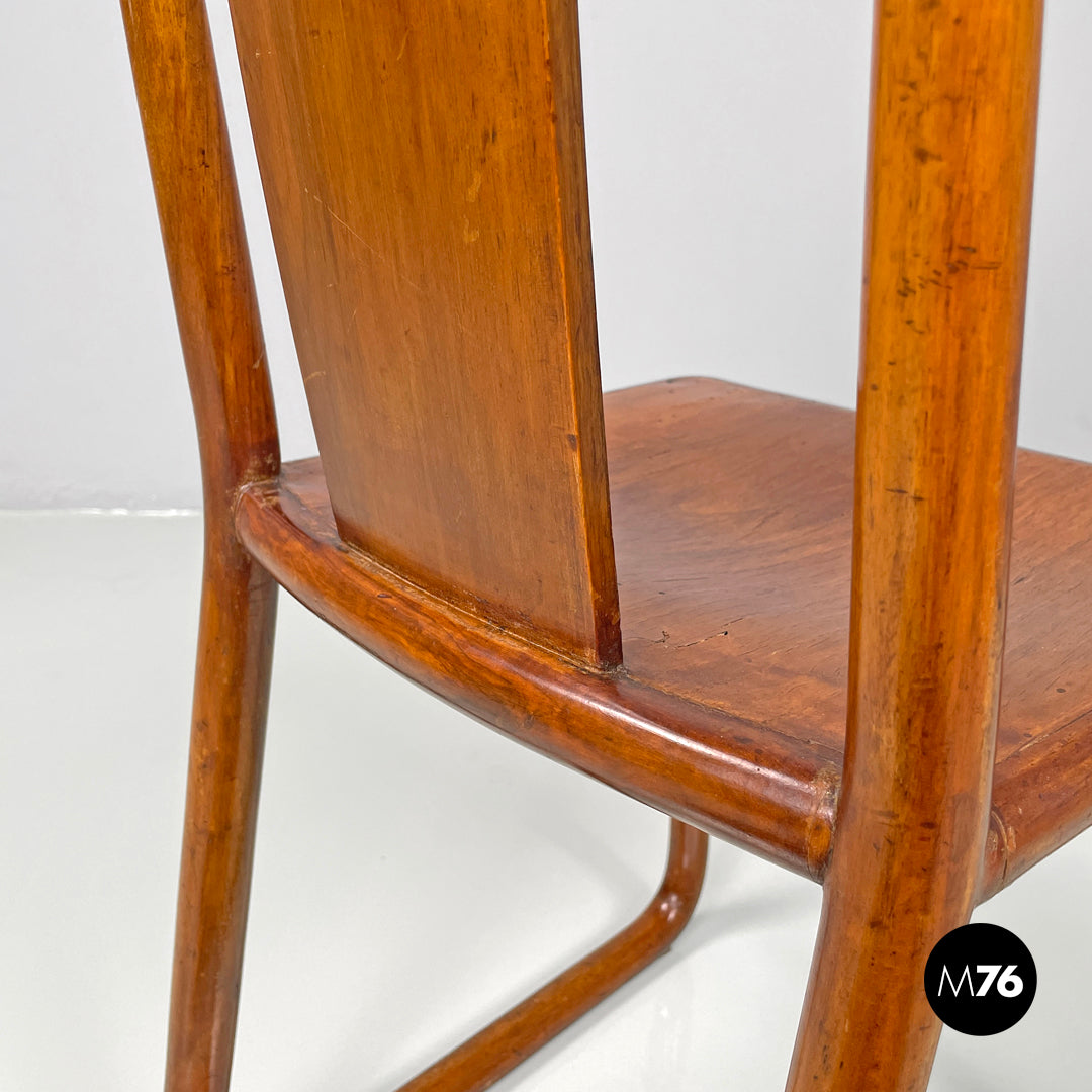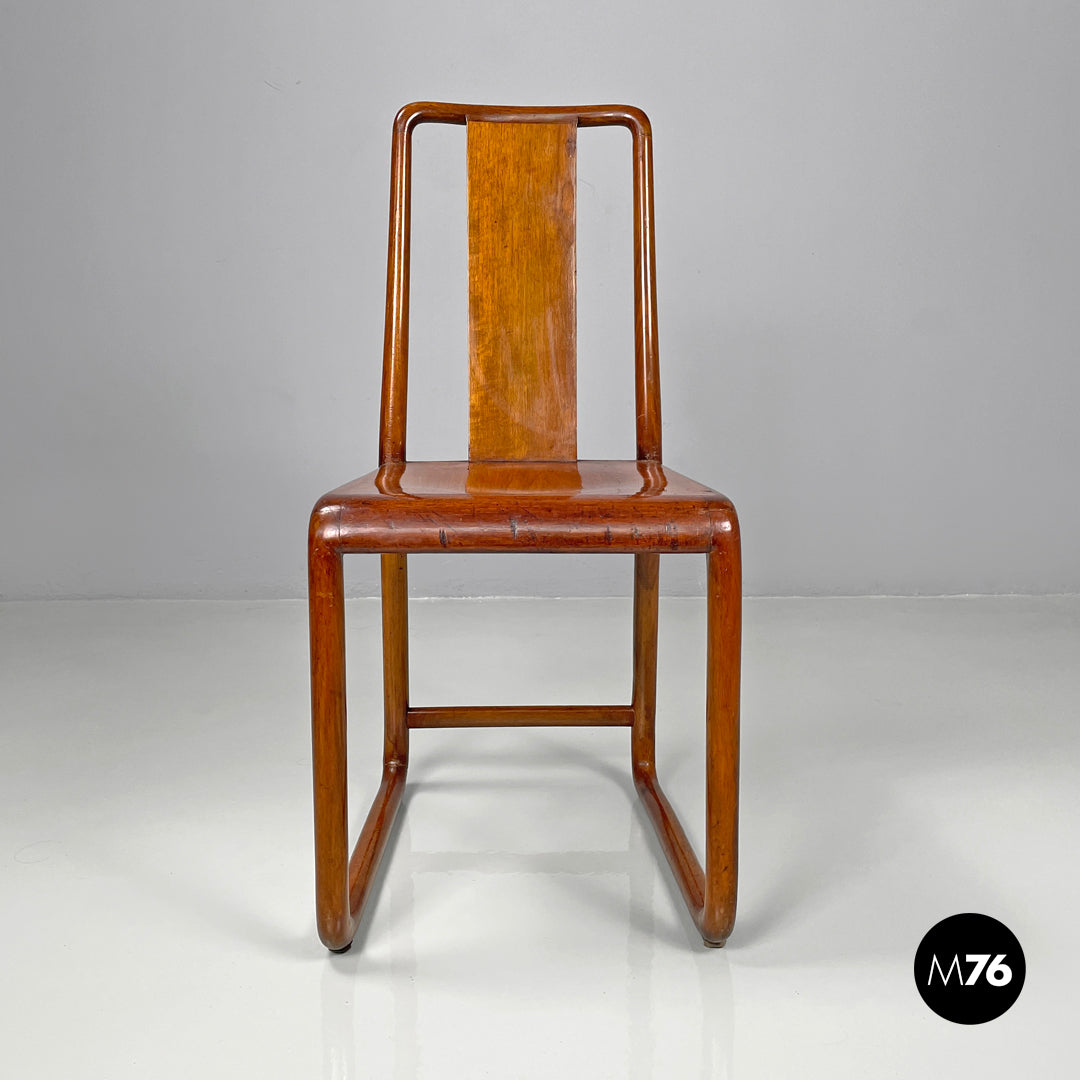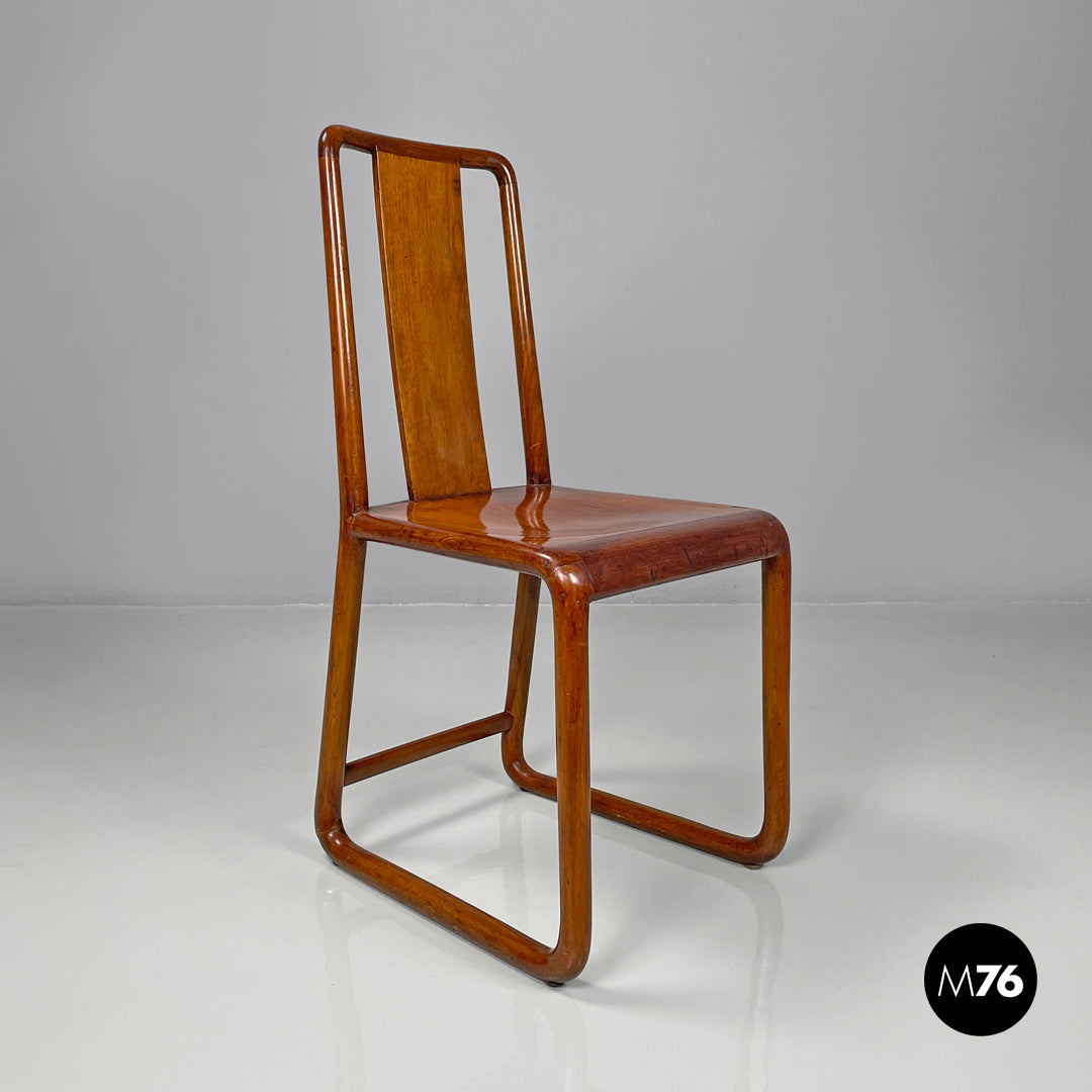 Set of six chairs entirely made of wood. The seat and back are rectangular and the structure is round.