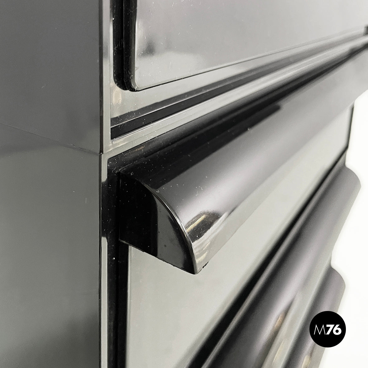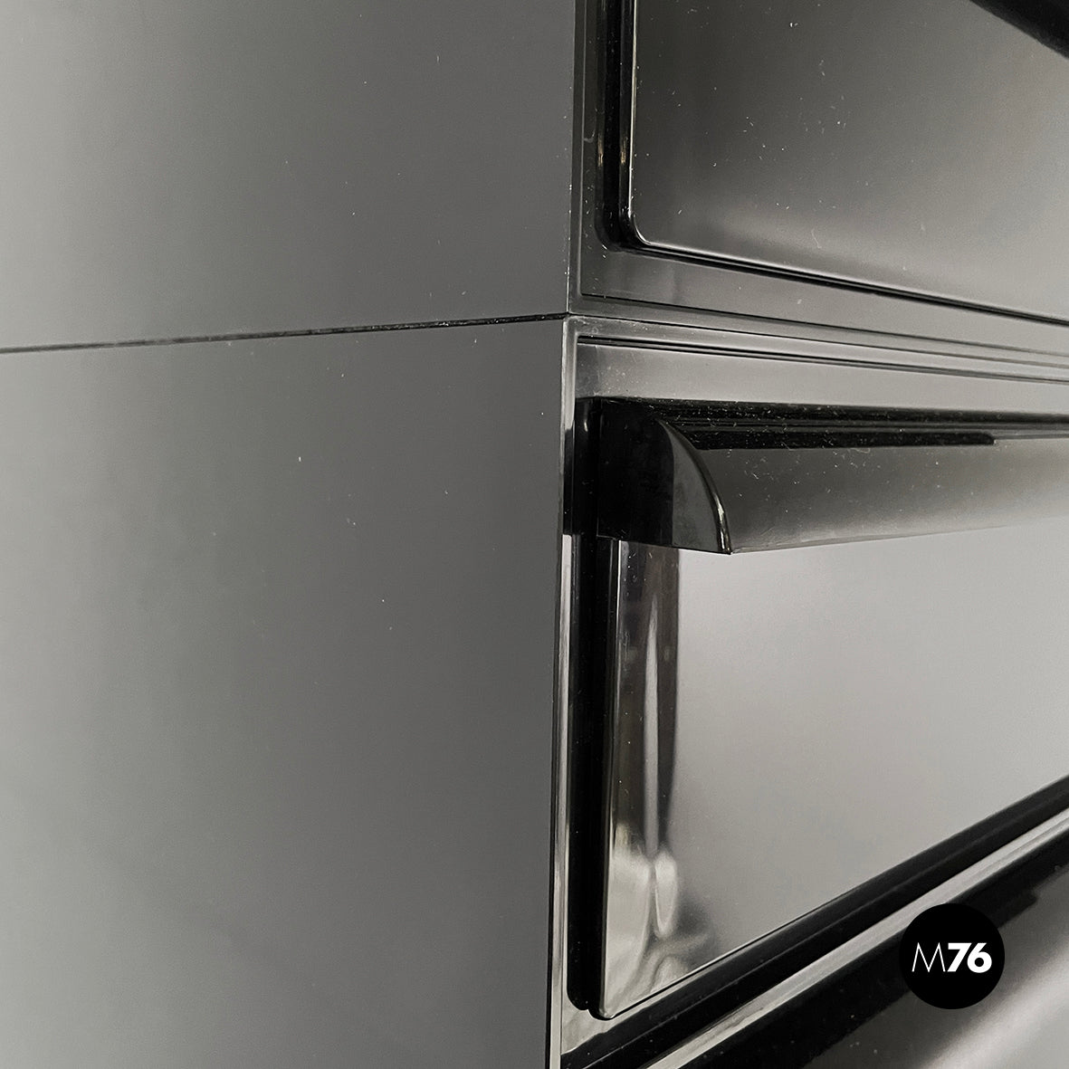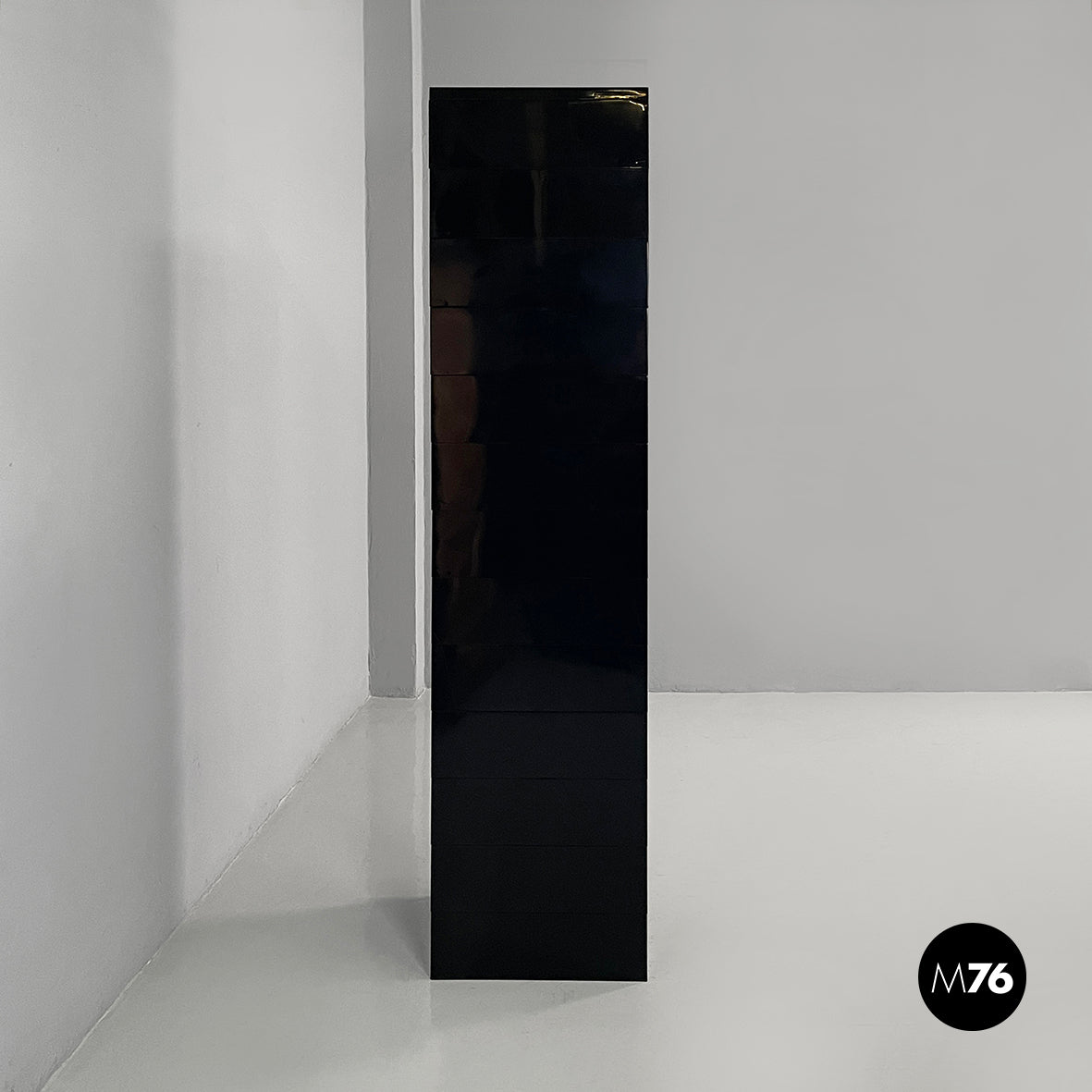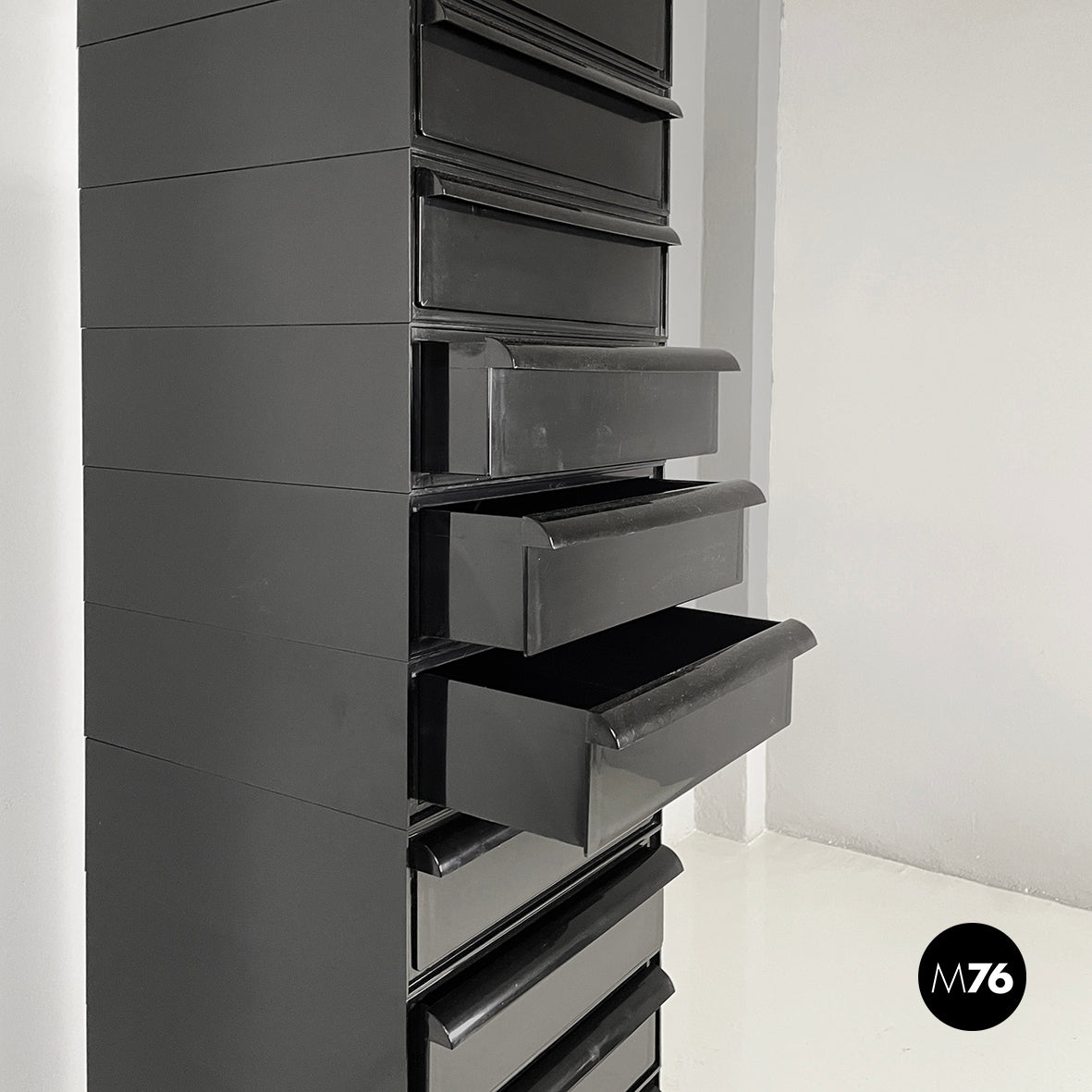 Modular chest of drawers model 4602 with a square base, made entirely of black plastic. The thirteen drawers have a rounded triangular handle, that have the same length as the drawer.