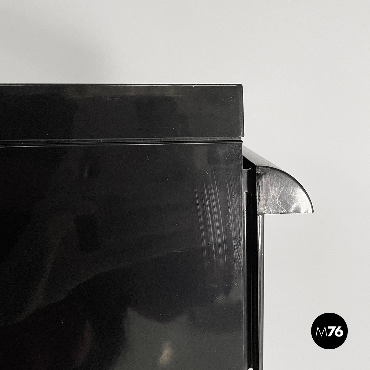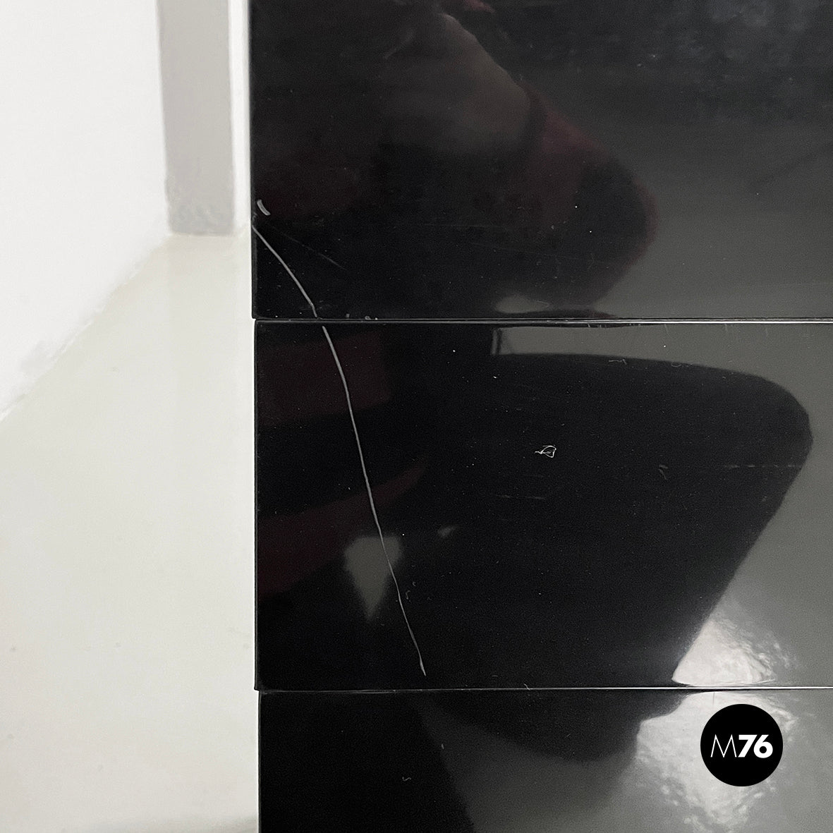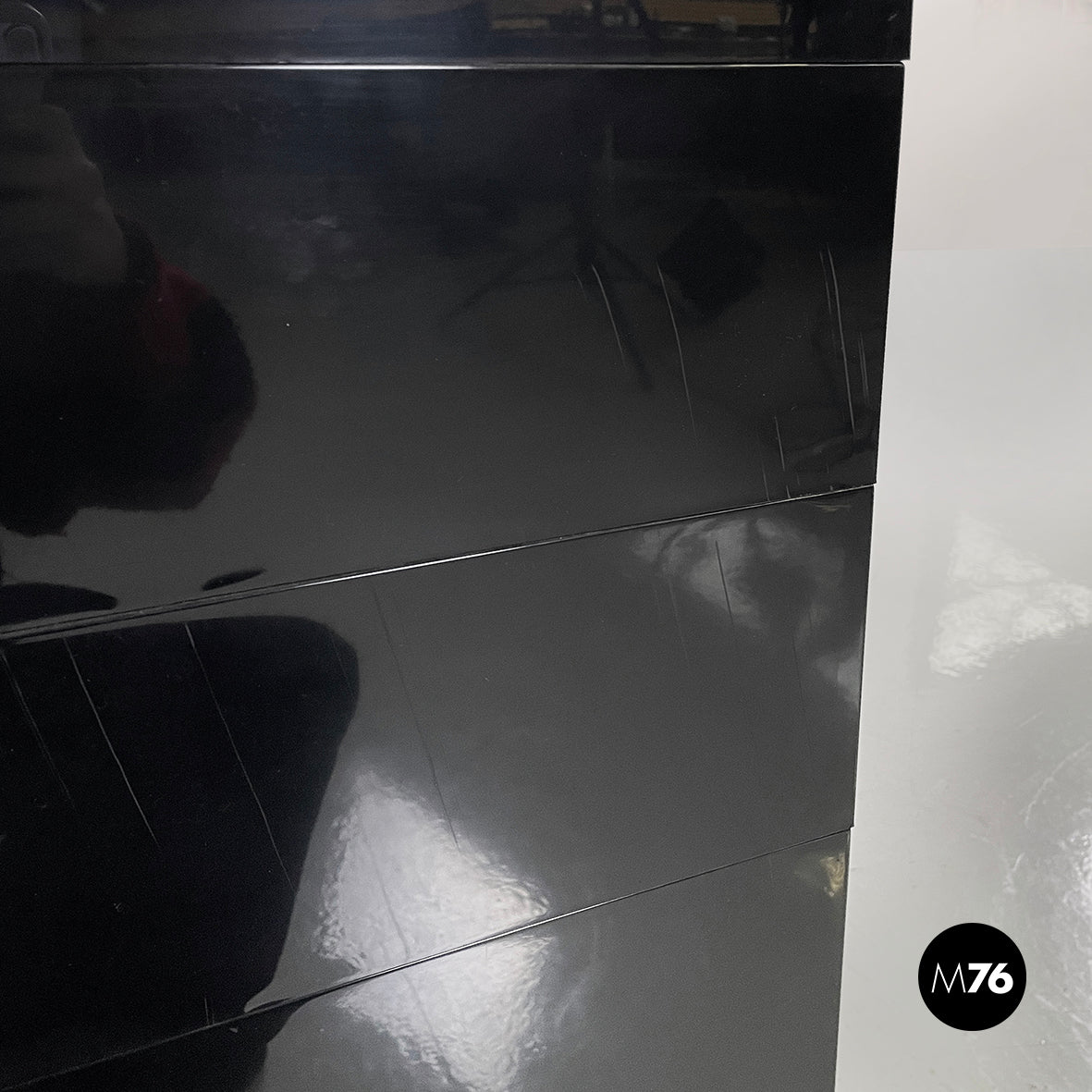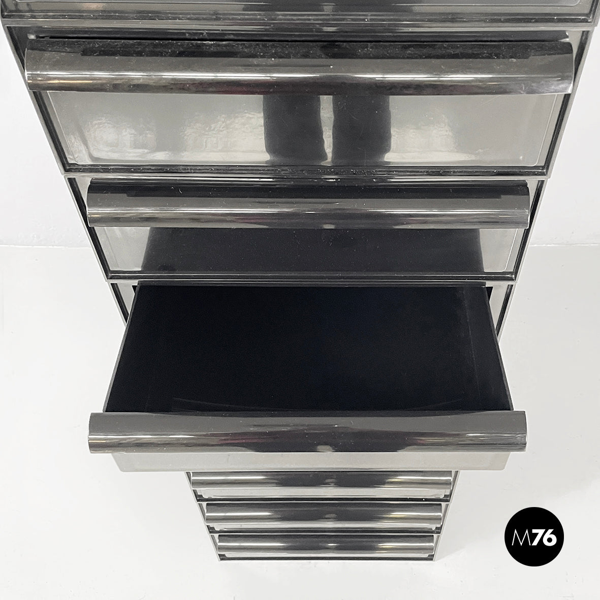 Modular chest of drawers model 4602 with a square base, made entirely of black plastic. The thirteen drawers have a rounded triangular handle, that have the same length as the drawer.