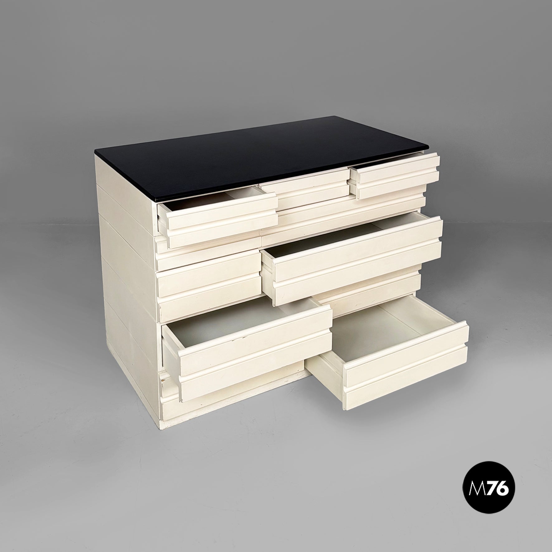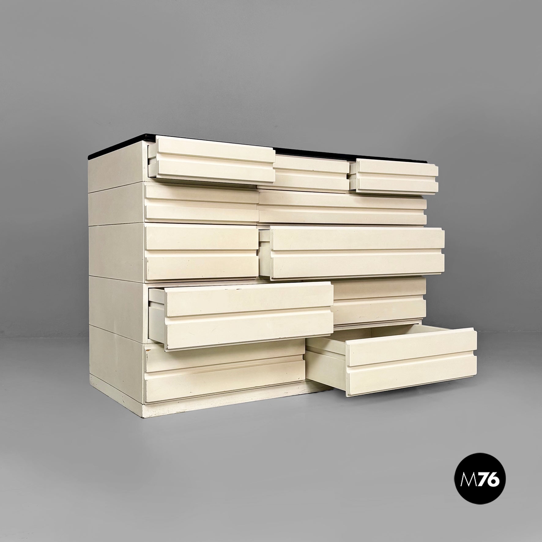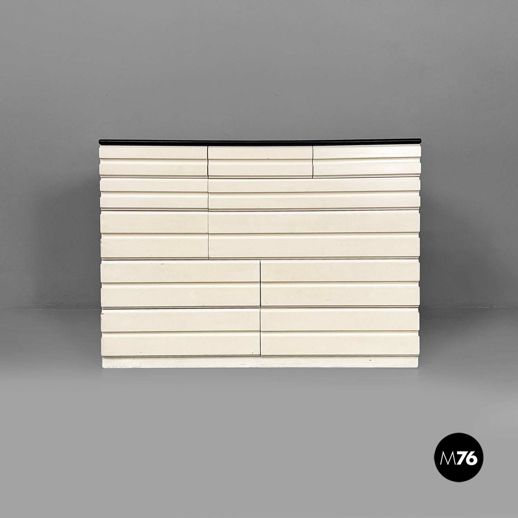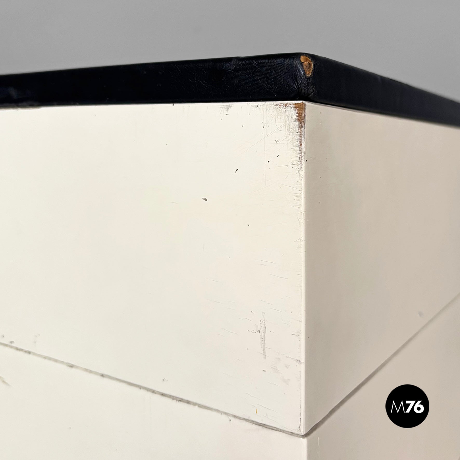Chest of drawers model Samarcanda  with rectangular base in white painted wood. The top is upholstered in black leather. The front features eleven drawers of varying sizes with decorative grooves.