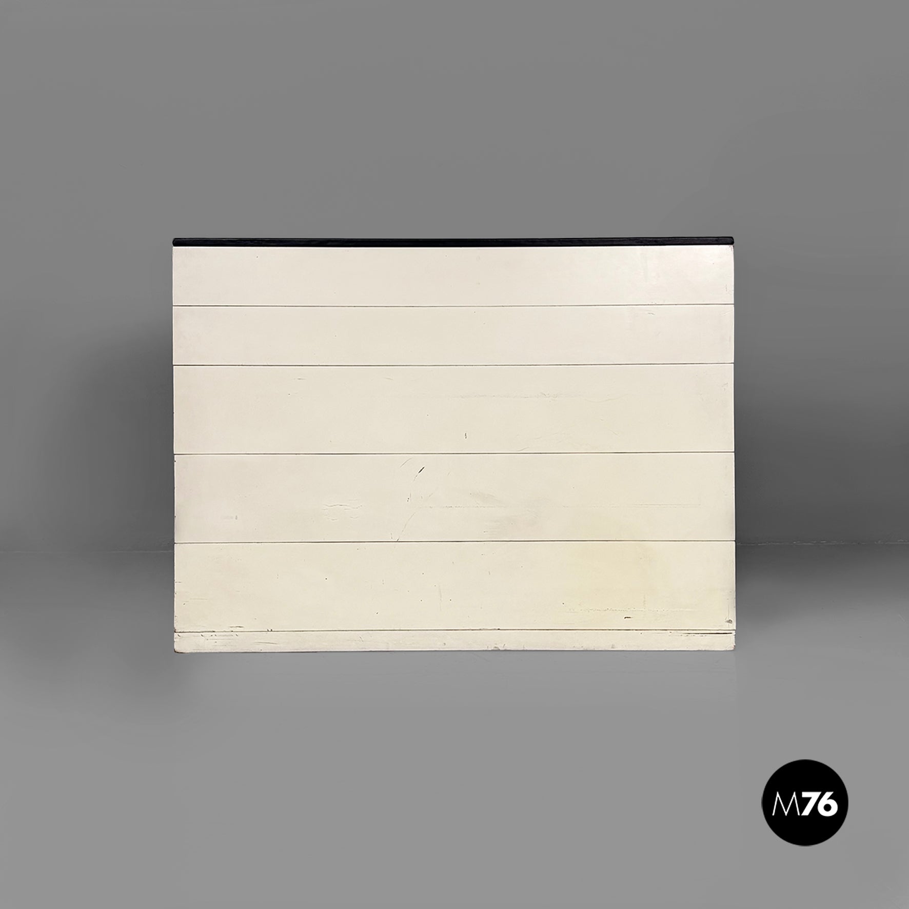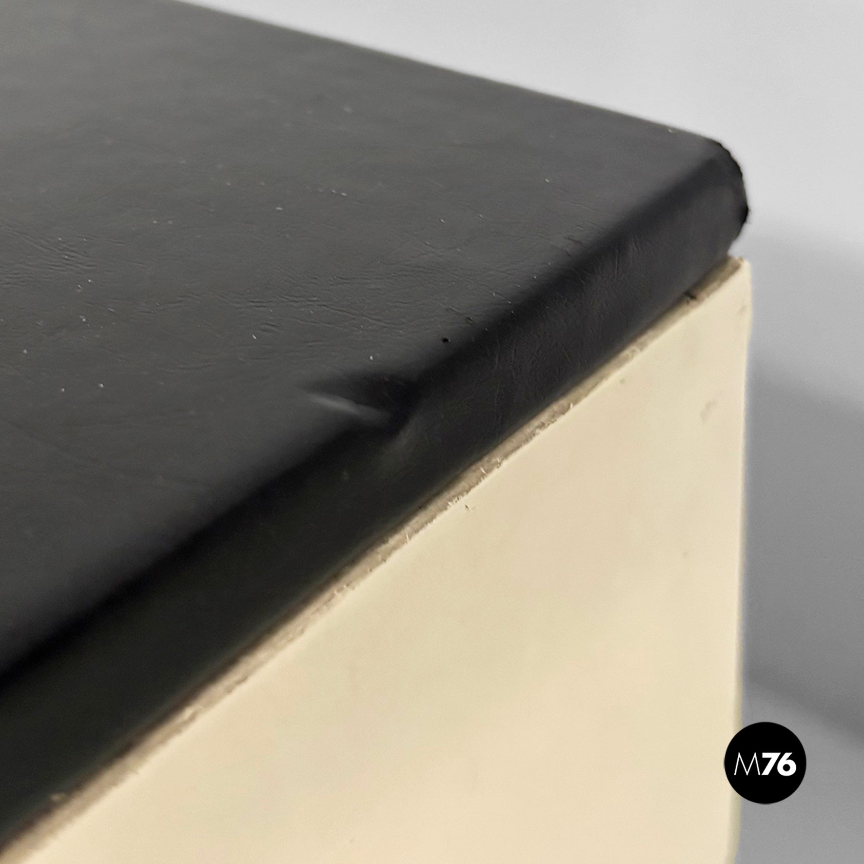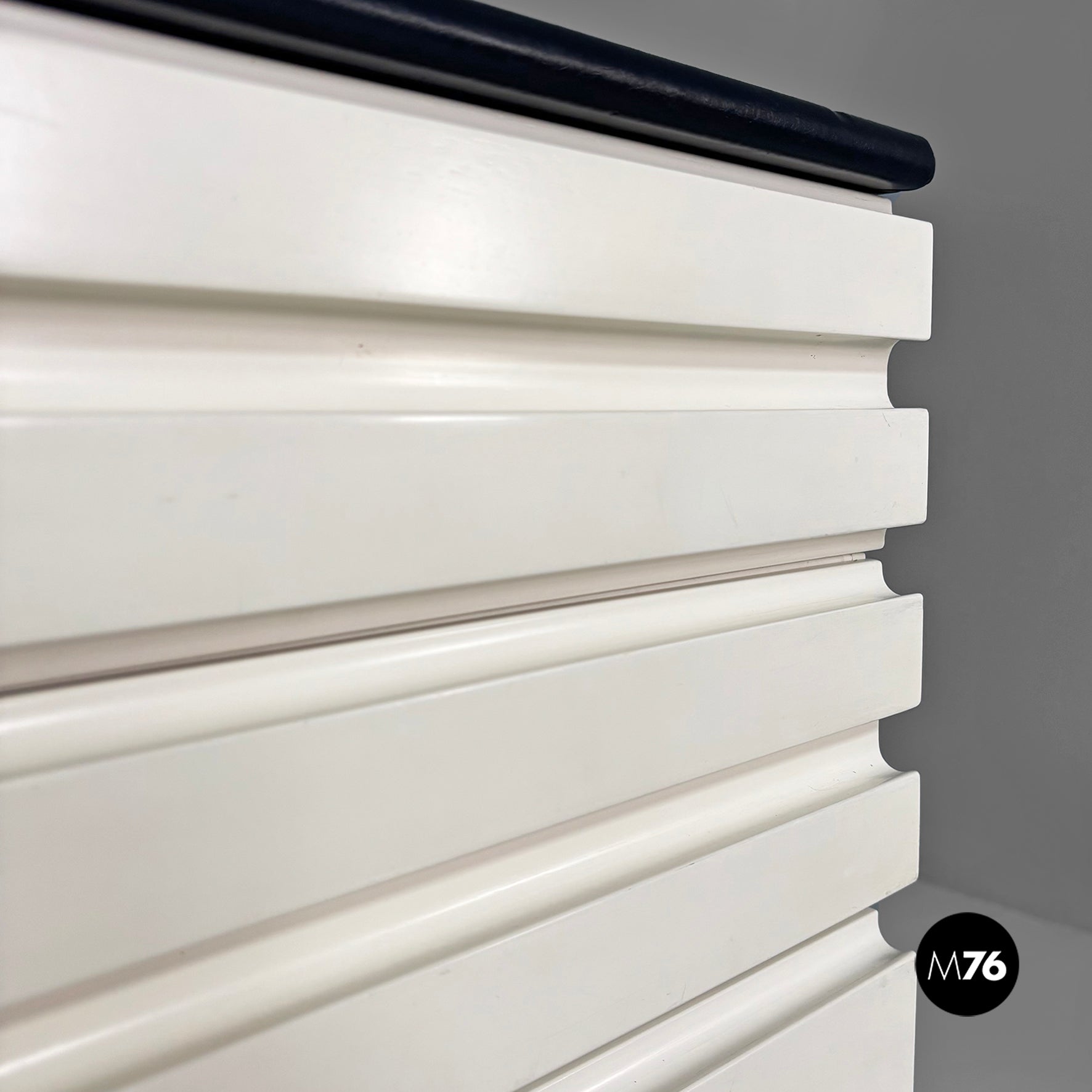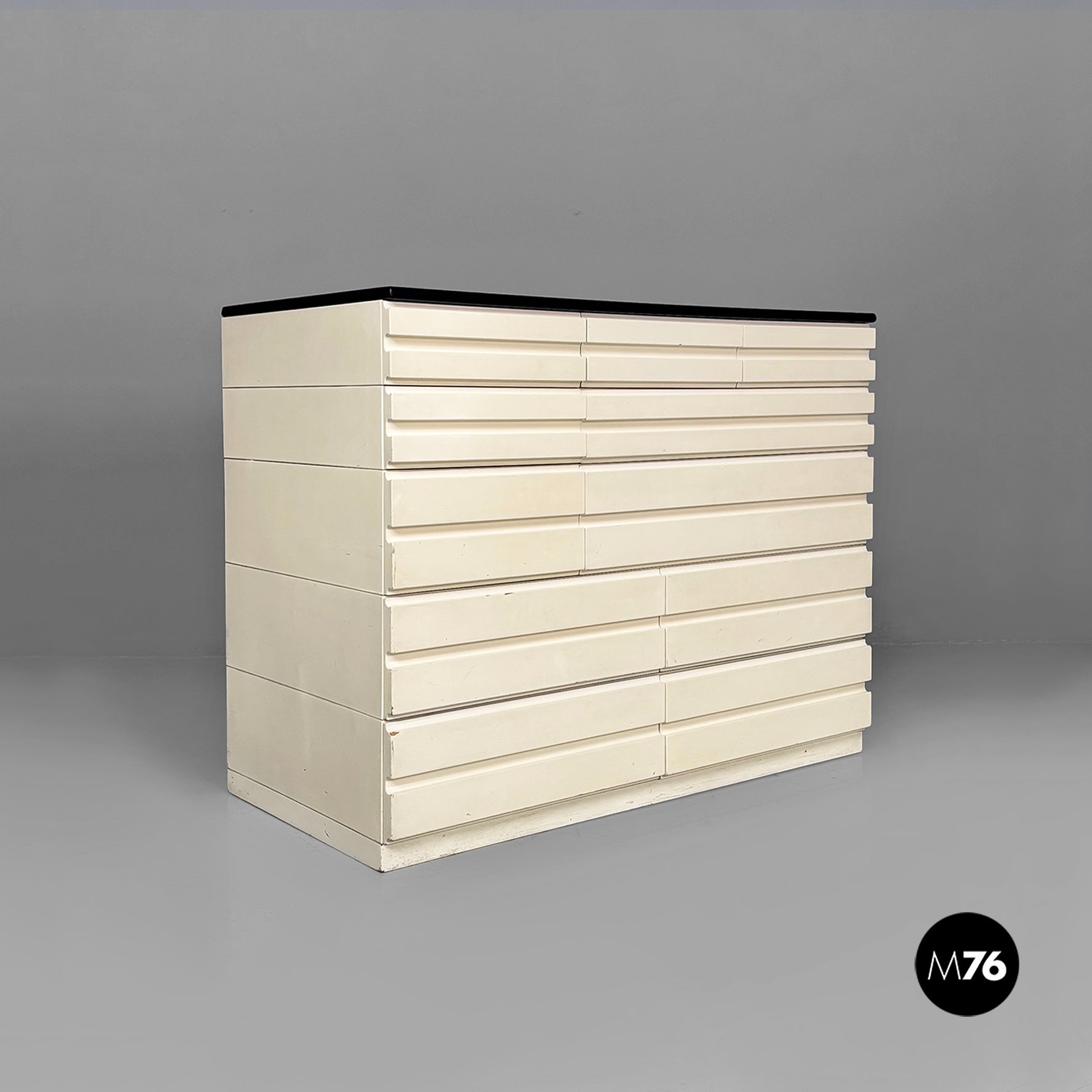 Chest of drawers model Samarcanda  with rectangular base in white painted wood. The top is upholstered in black leather. The front features eleven drawers of varying sizes with decorative grooves.