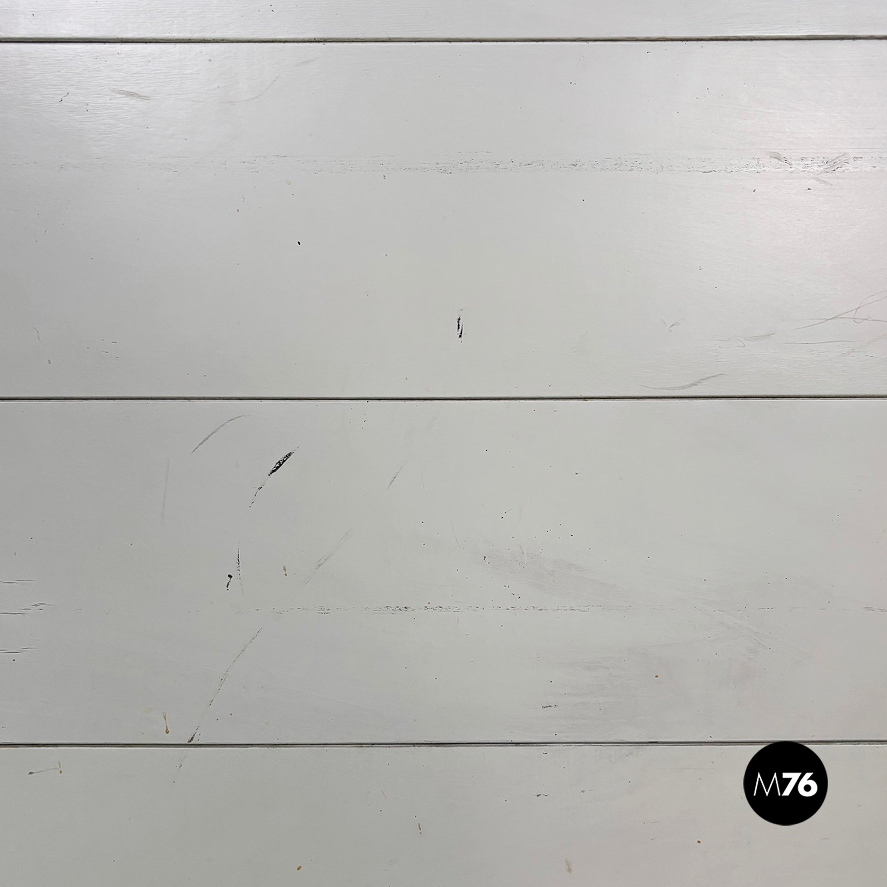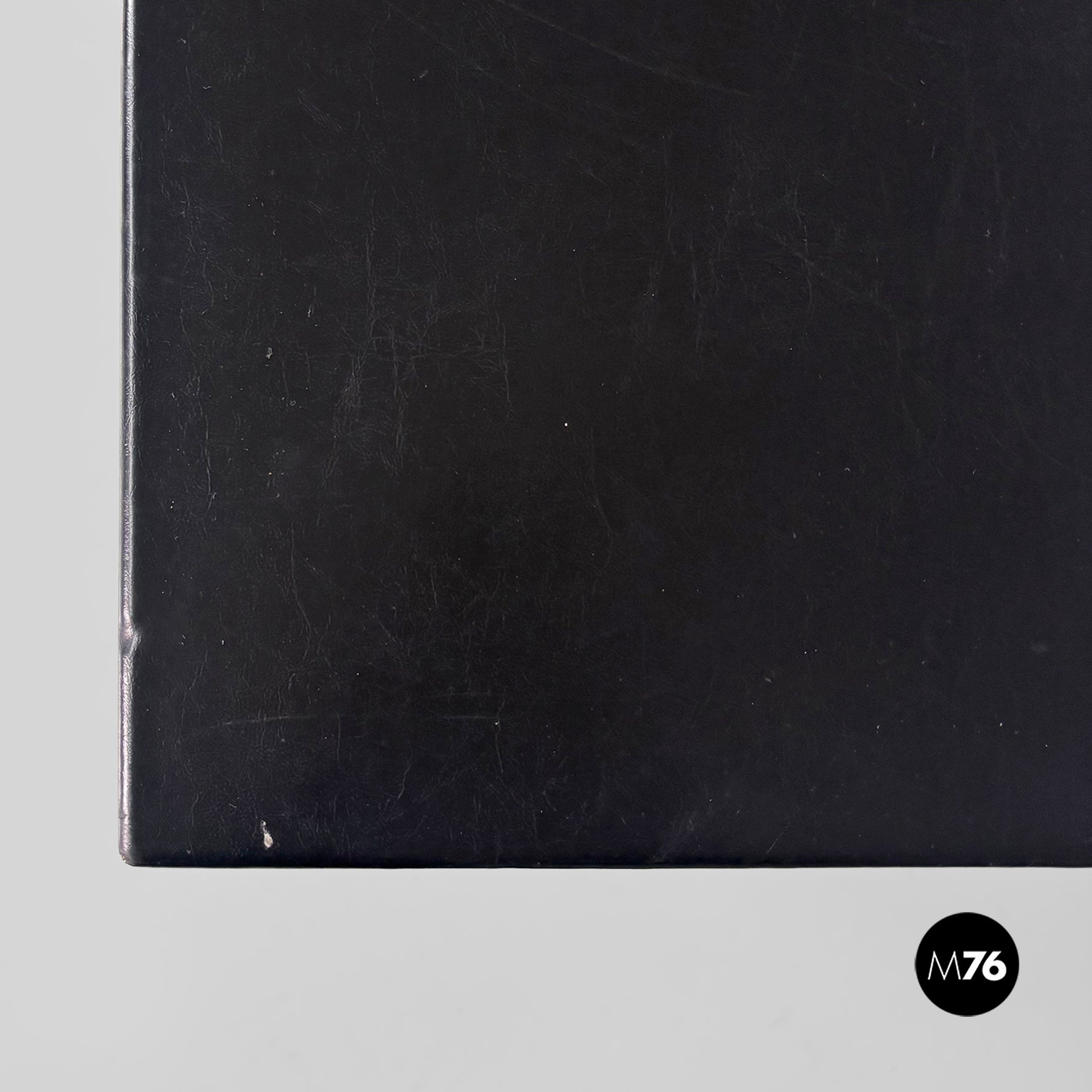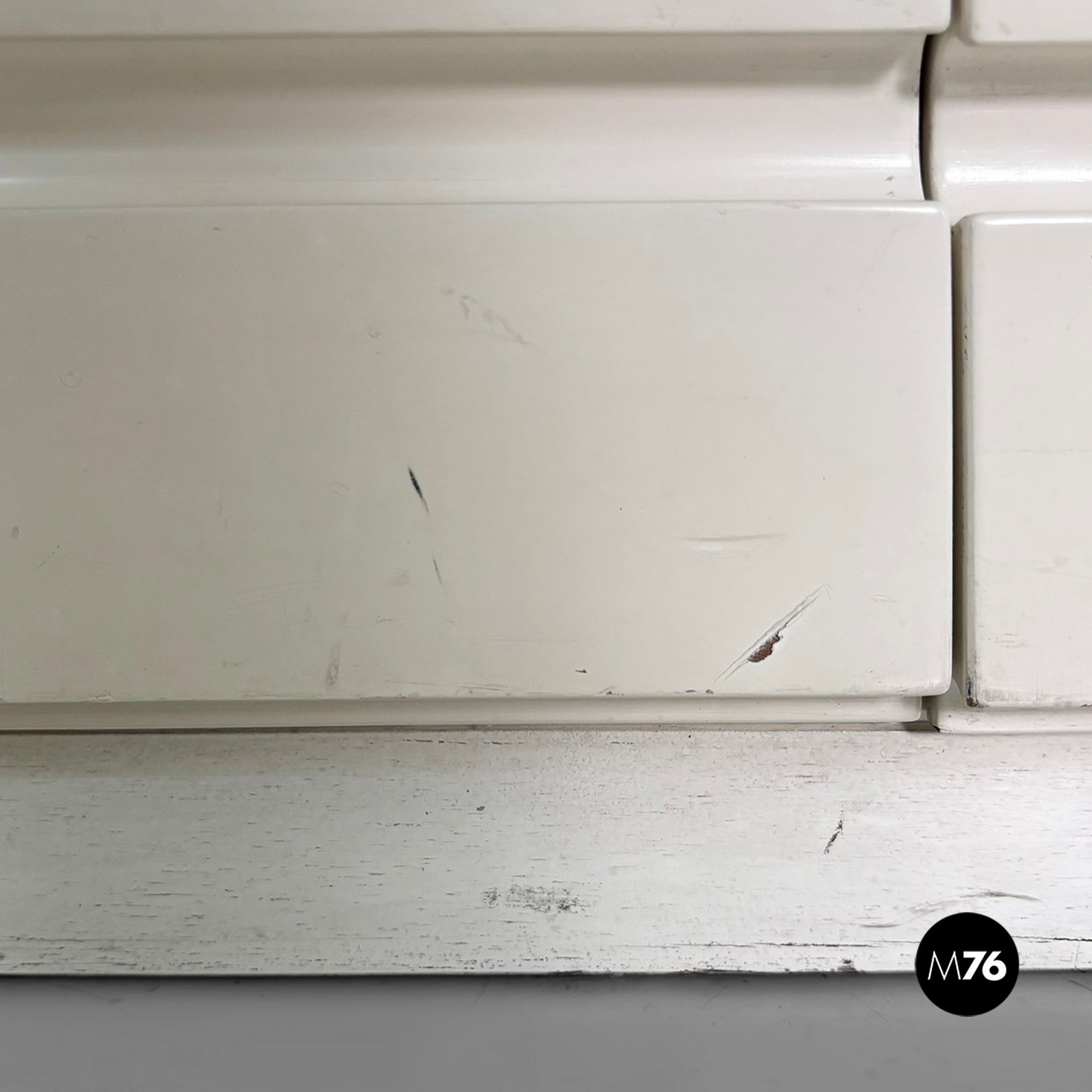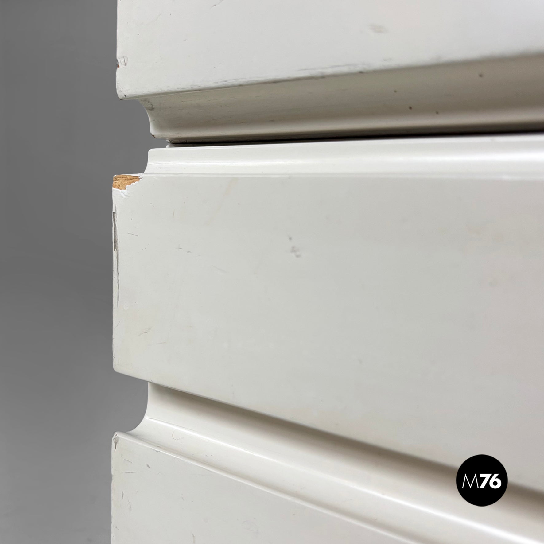 Chest of drawers model Samarcanda  with rectangular base in white painted wood. The top is upholstered in black leather. The front features eleven drawers of varying sizes with decorative grooves.