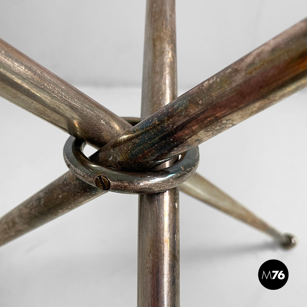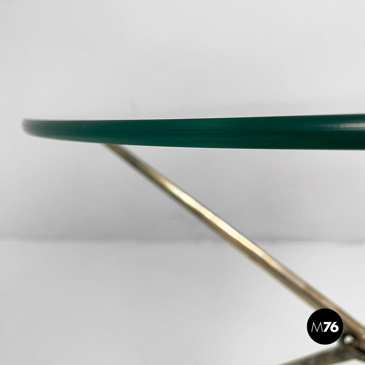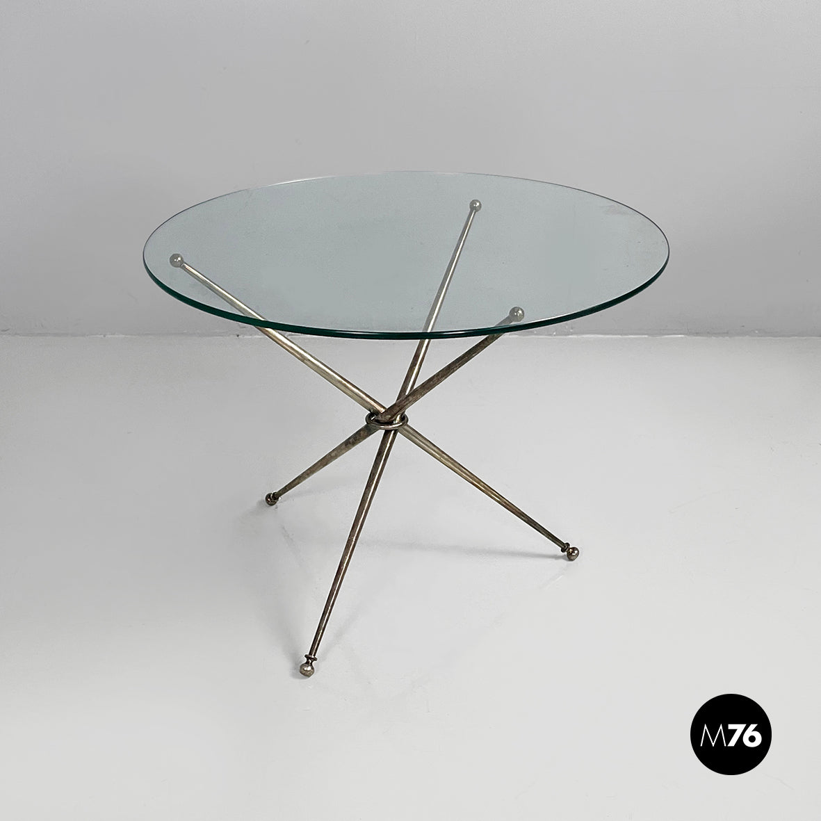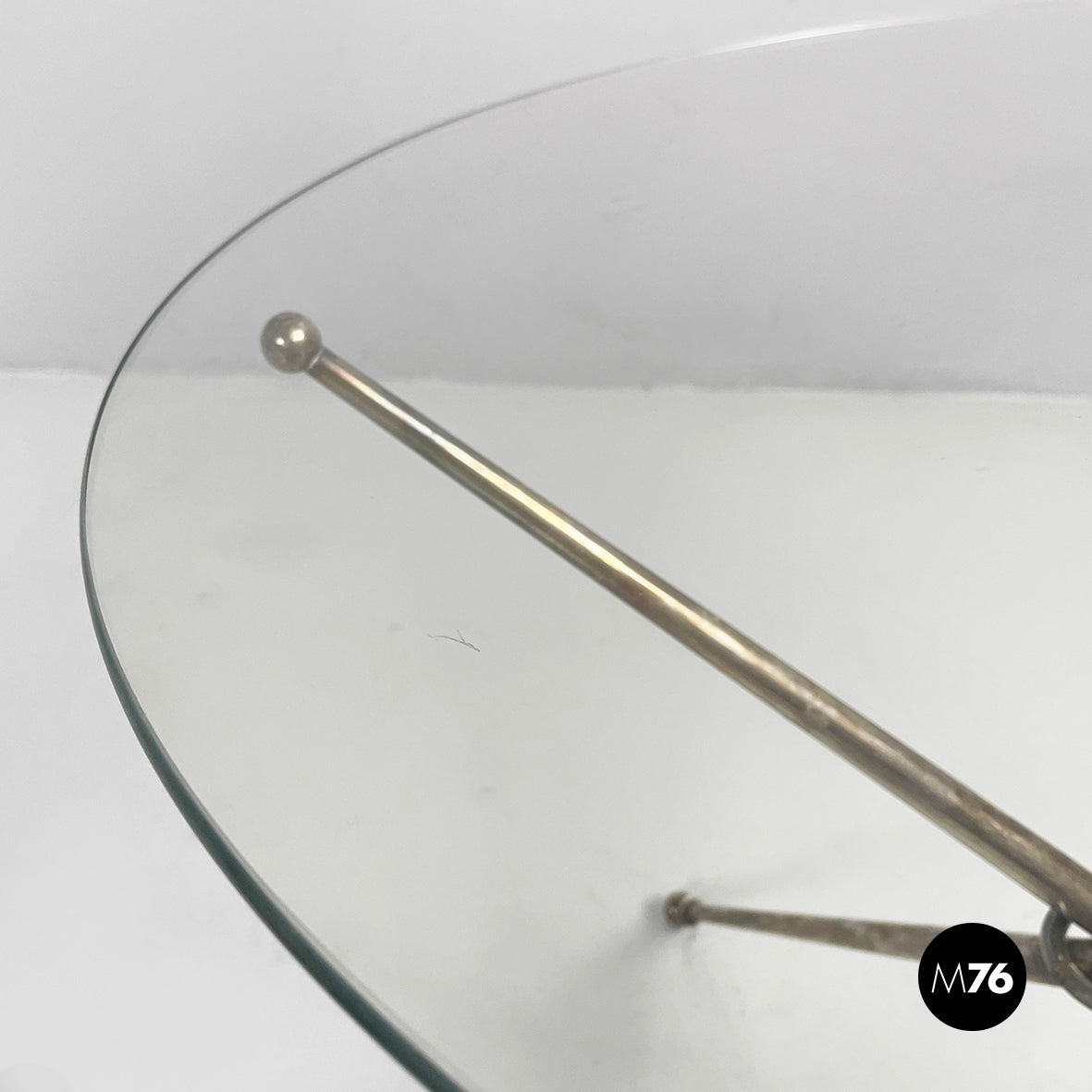 Coffee table with round top in thick glass. The base is composed of three burnished metal rods joined at the center by a ring. Spherical feet.