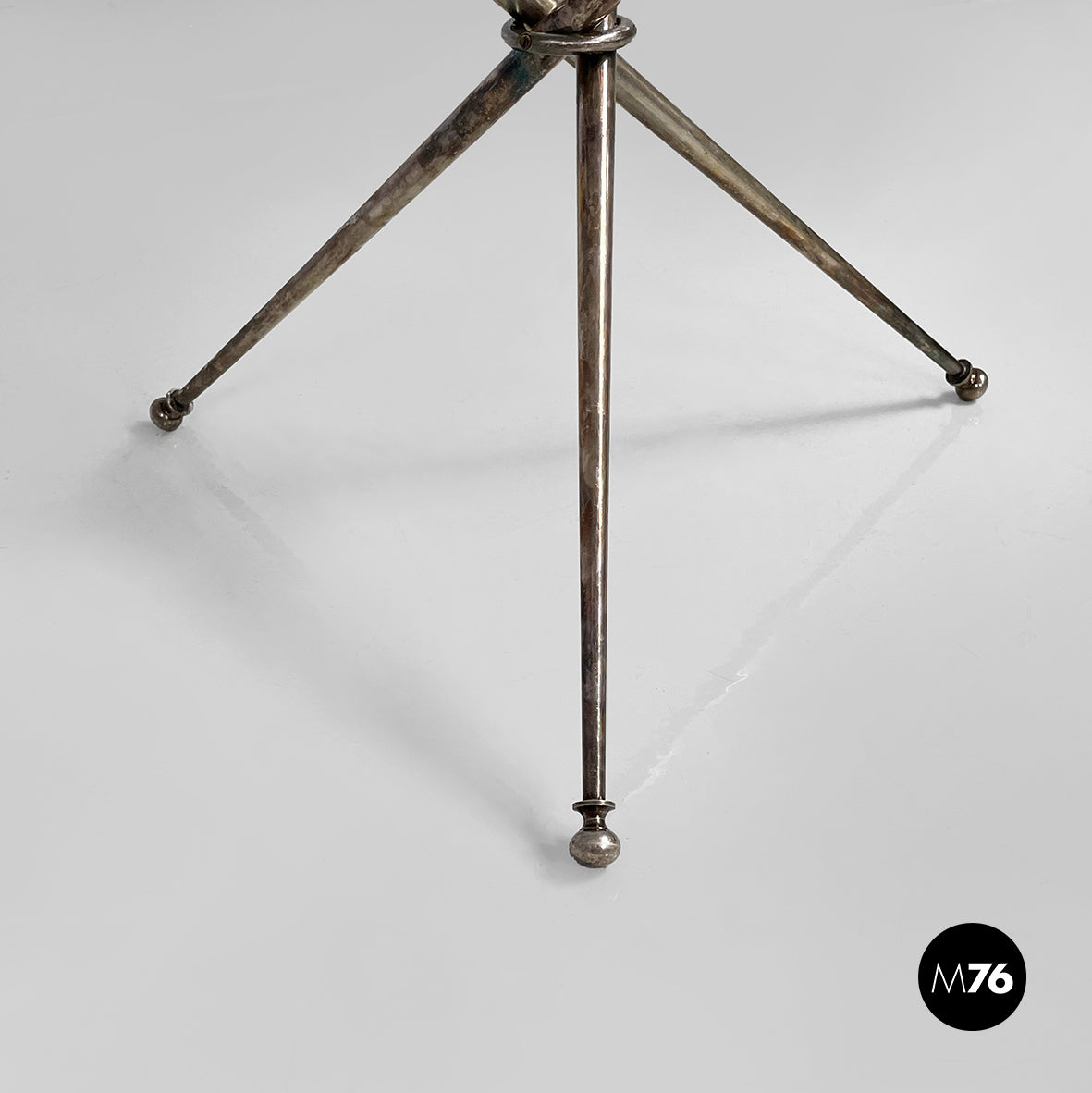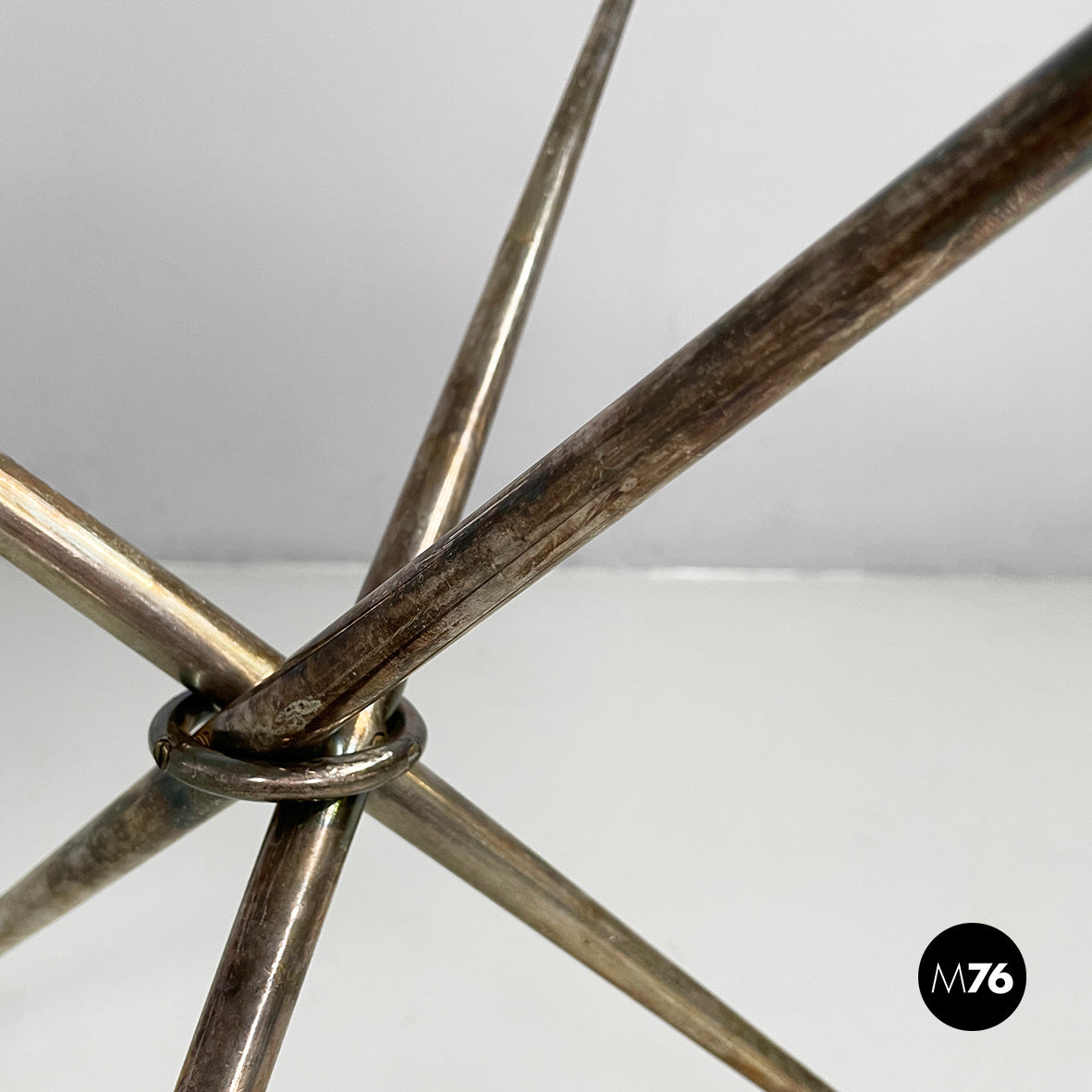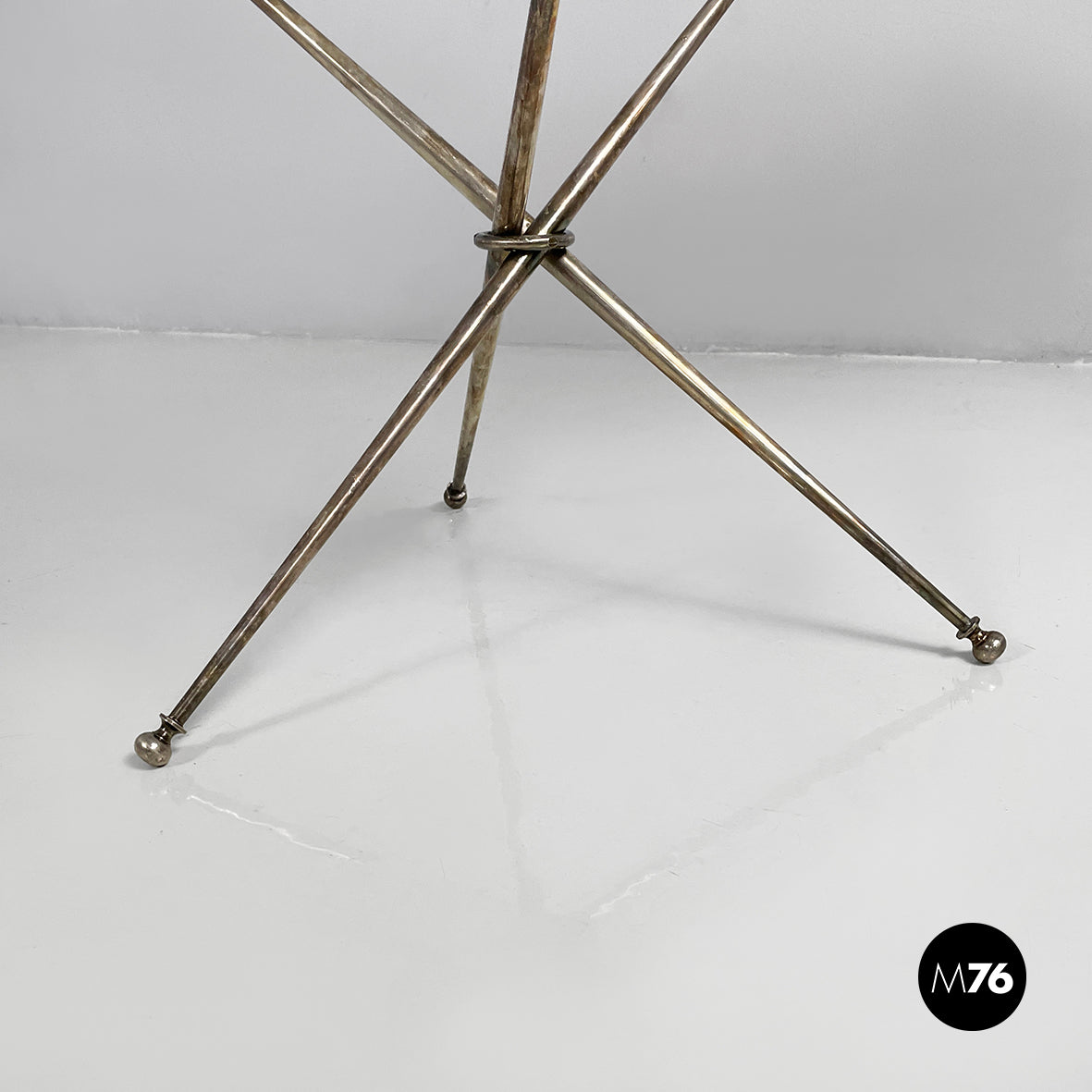 Coffee table with round top in thick glass. The base is composed of three burnished metal rods joined at the center by a ring. Spherical feet.